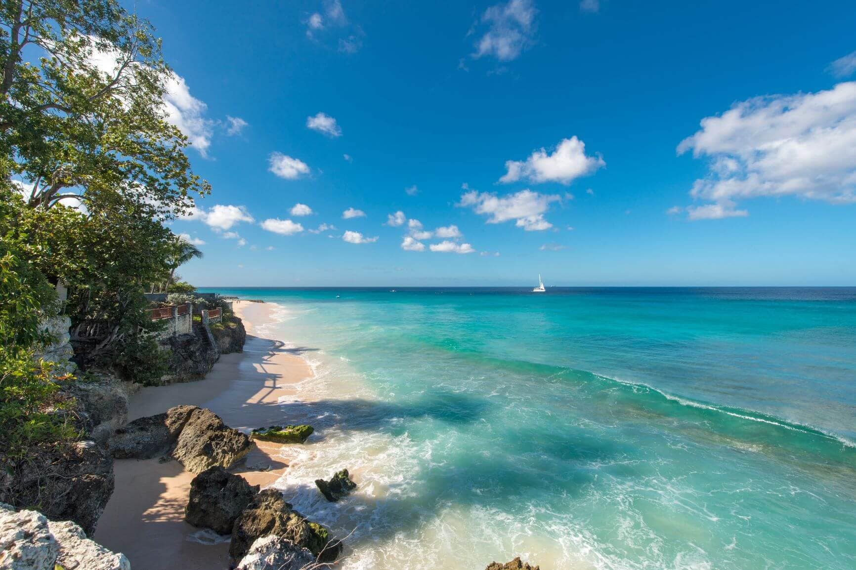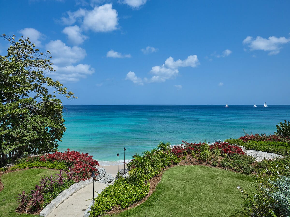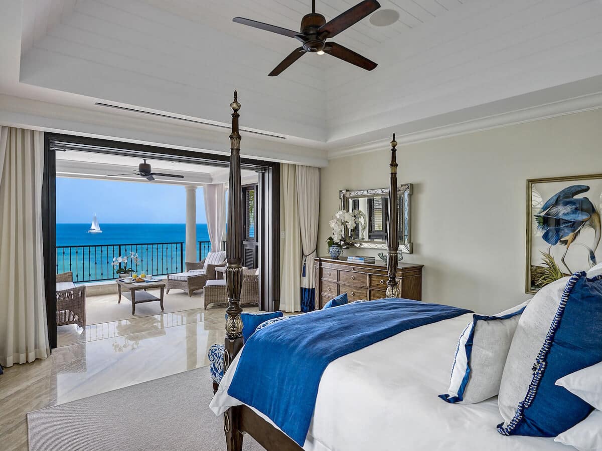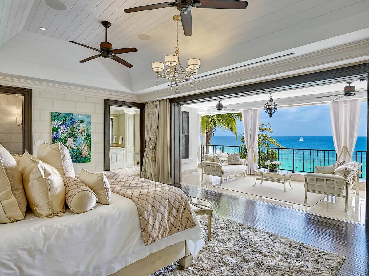 This spectacular six-bedroom beachfront villa in Barbados is set on an acre of tropical gardens on a bluff overlooking the Caribbean Sea. The luxurious property offers breathtaking sea views from all living areas and five of the bedrooms. Interiors feature a cocktail bar, formal dining room, grand piano, and fitness room. The main house has four elegant bedroom suites with terraces, and a spiral staircase leads to a grand master suite with a private terrace. An additional bedroom is located in a self-contained cottage, ideal for staff or teenagers.