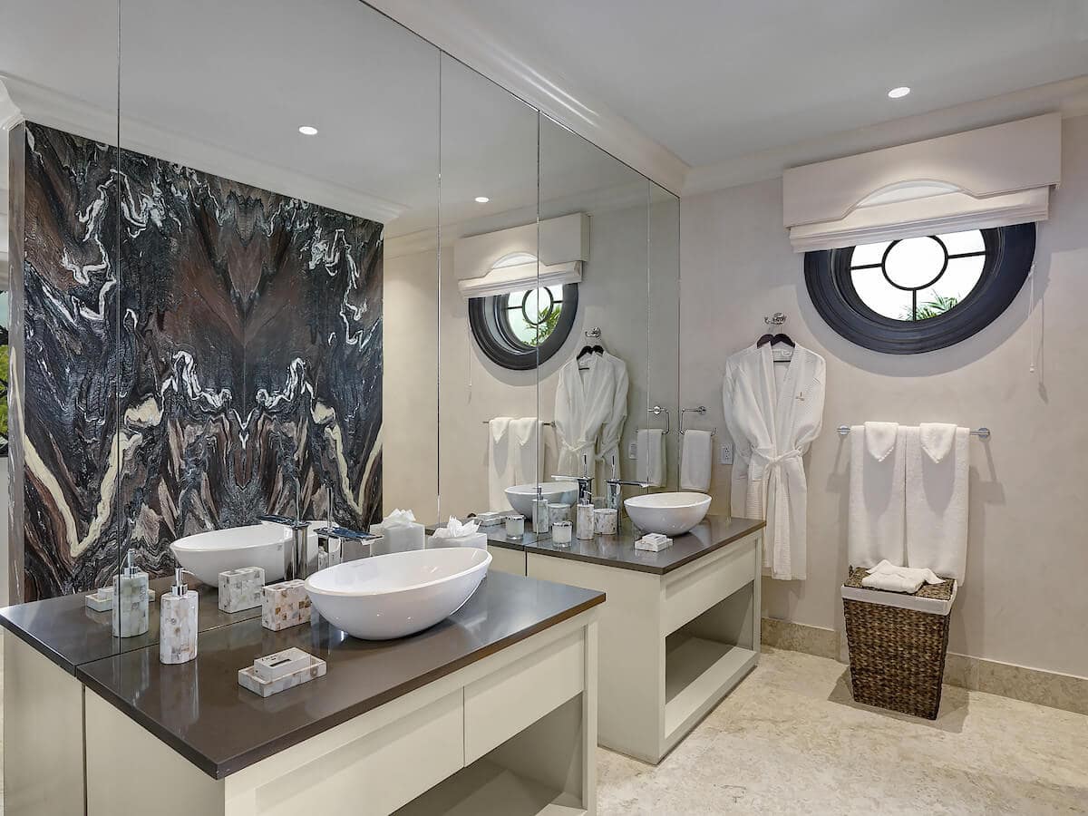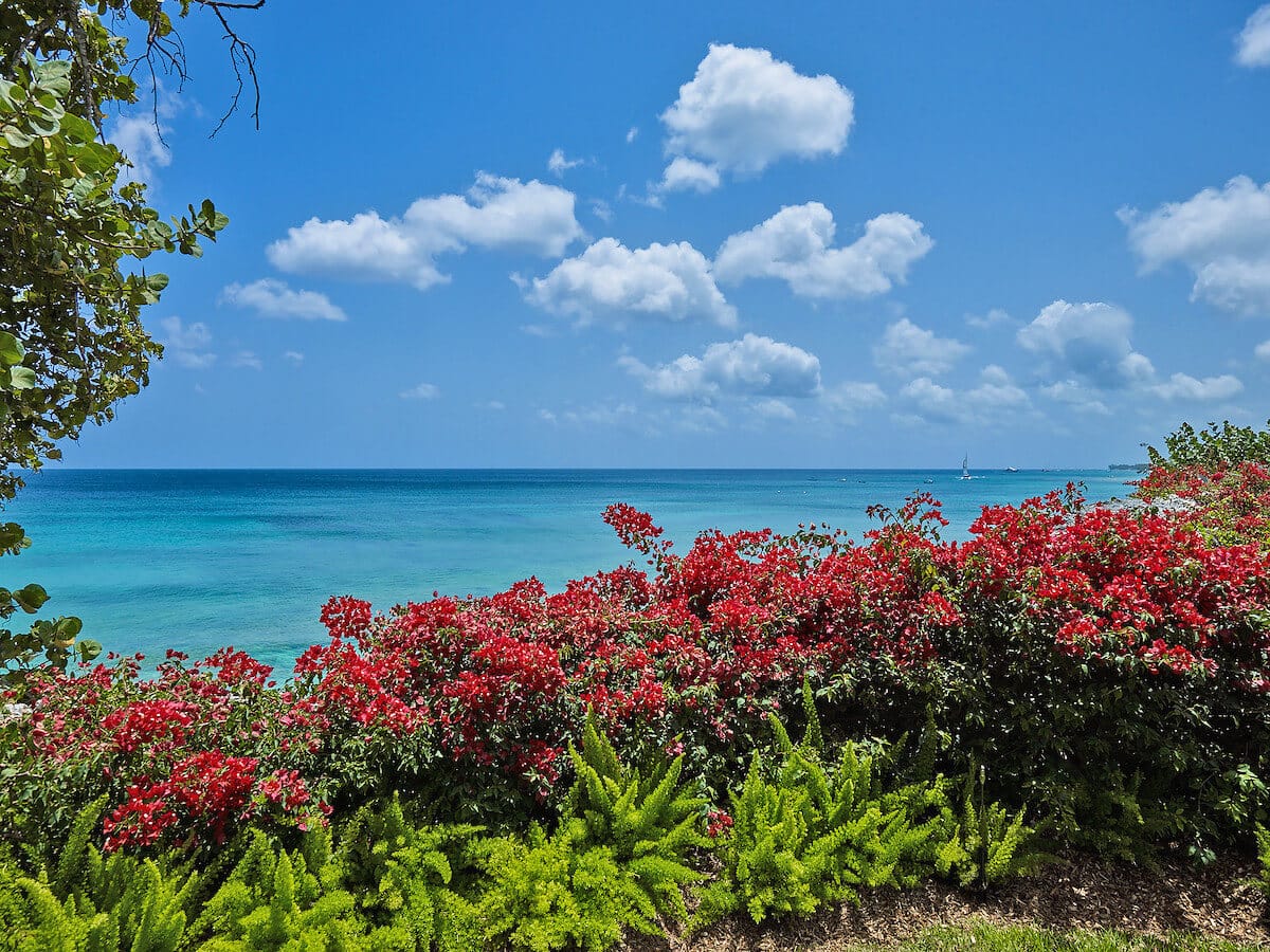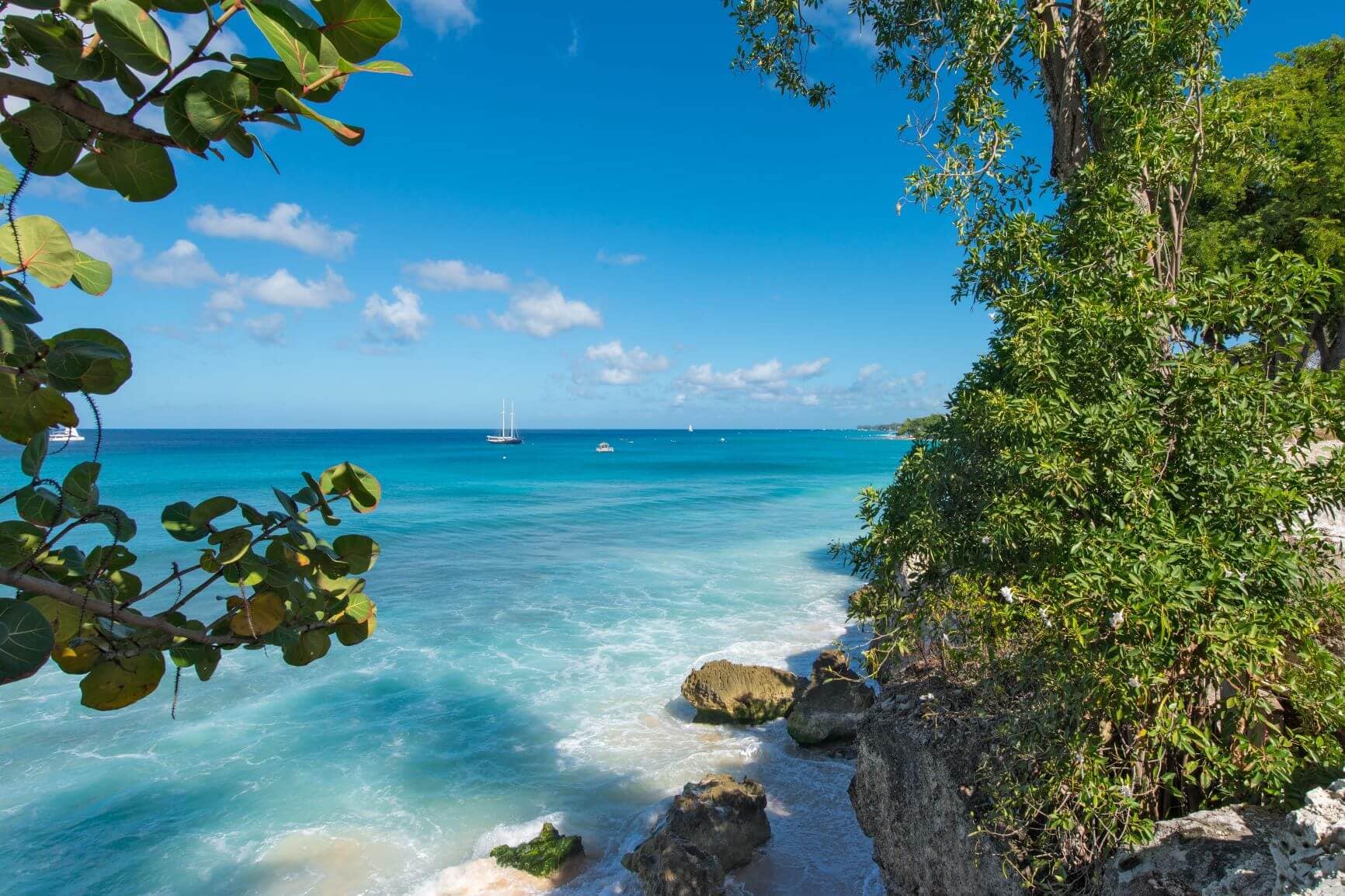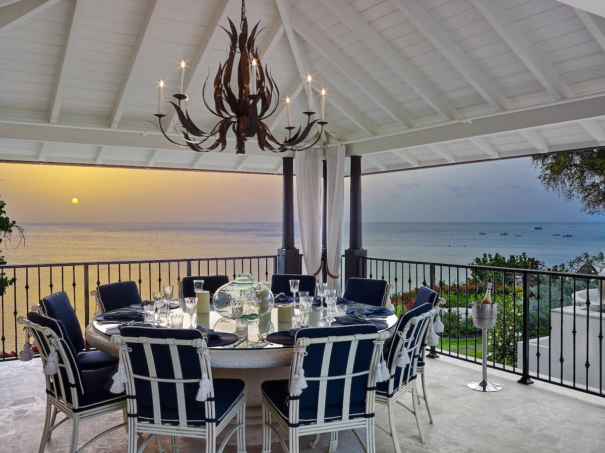 This spectacular six-bedroom beachfront villa in Barbados is set on an acre of tropical gardens on a bluff overlooking the Caribbean Sea. The luxurious property offers breathtaking sea views from all living areas and five of the bedrooms. Interiors feature a cocktail bar, formal dining room, grand piano, and fitness room. The main house has four elegant bedroom suites with terraces, and a spiral staircase leads to a grand master suite with a private terrace. An additional bedroom is located in a self-contained cottage, ideal for staff or teenagers.