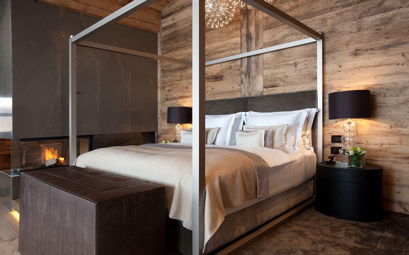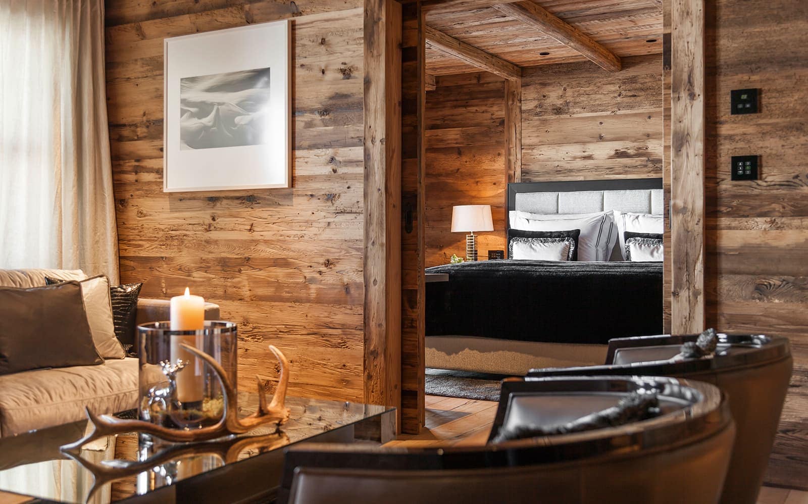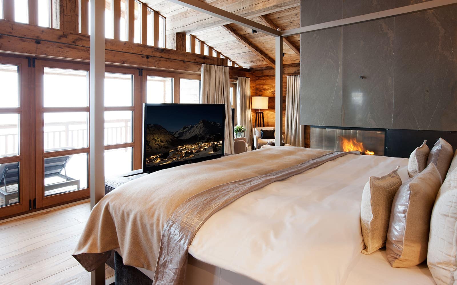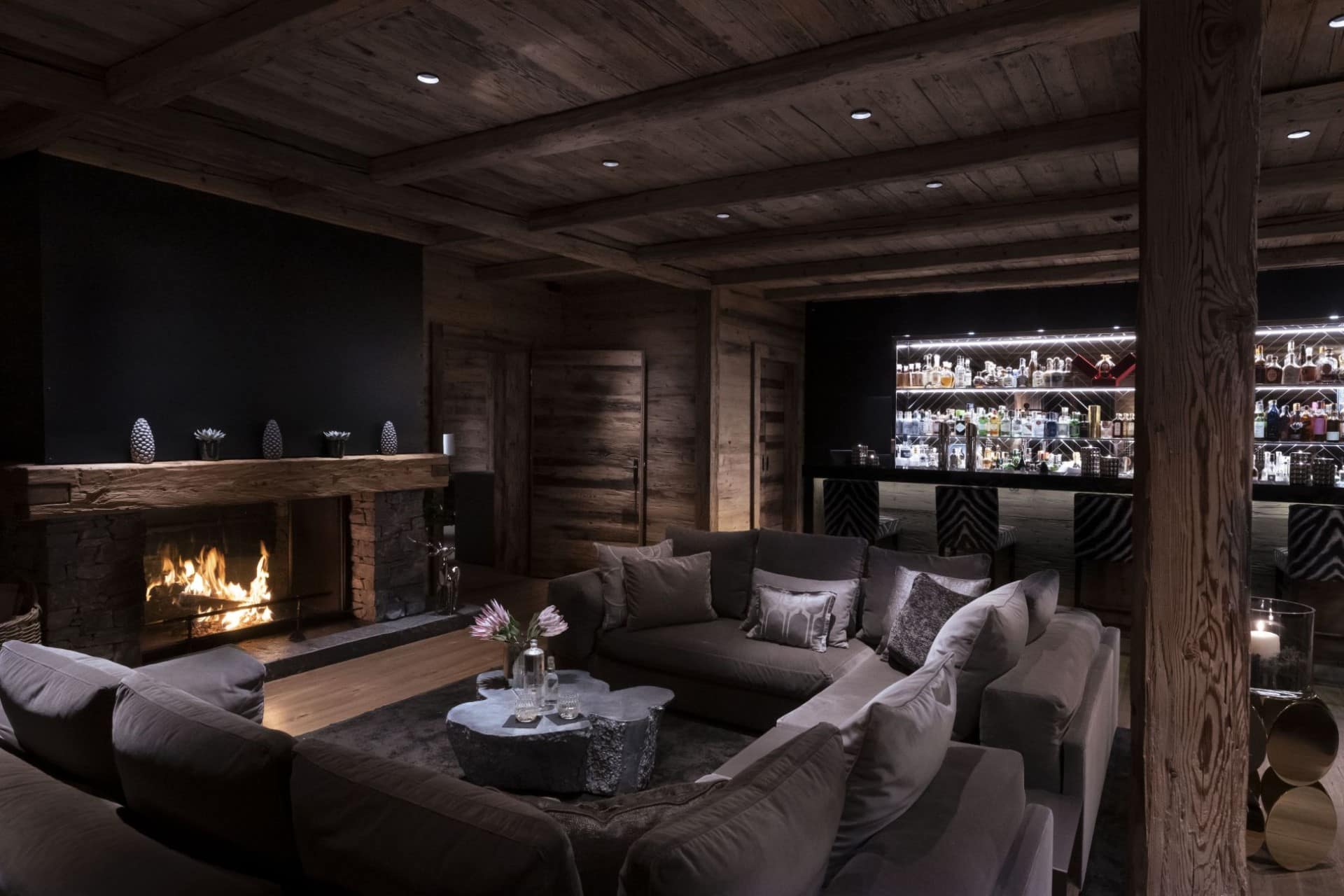Chalet N features nine exquisite suites, each designed as a private sanctuary. Warm fireplaces, soft candlelight, plush rugs, and irresistibly comfortable beds set the tone for refined Alpine living. Every suite includes a spacious lounge area, an elegant dressing room, and a beautifully appointed en-suite bathroom—along with breathtaking views of the surrounding mountains.
