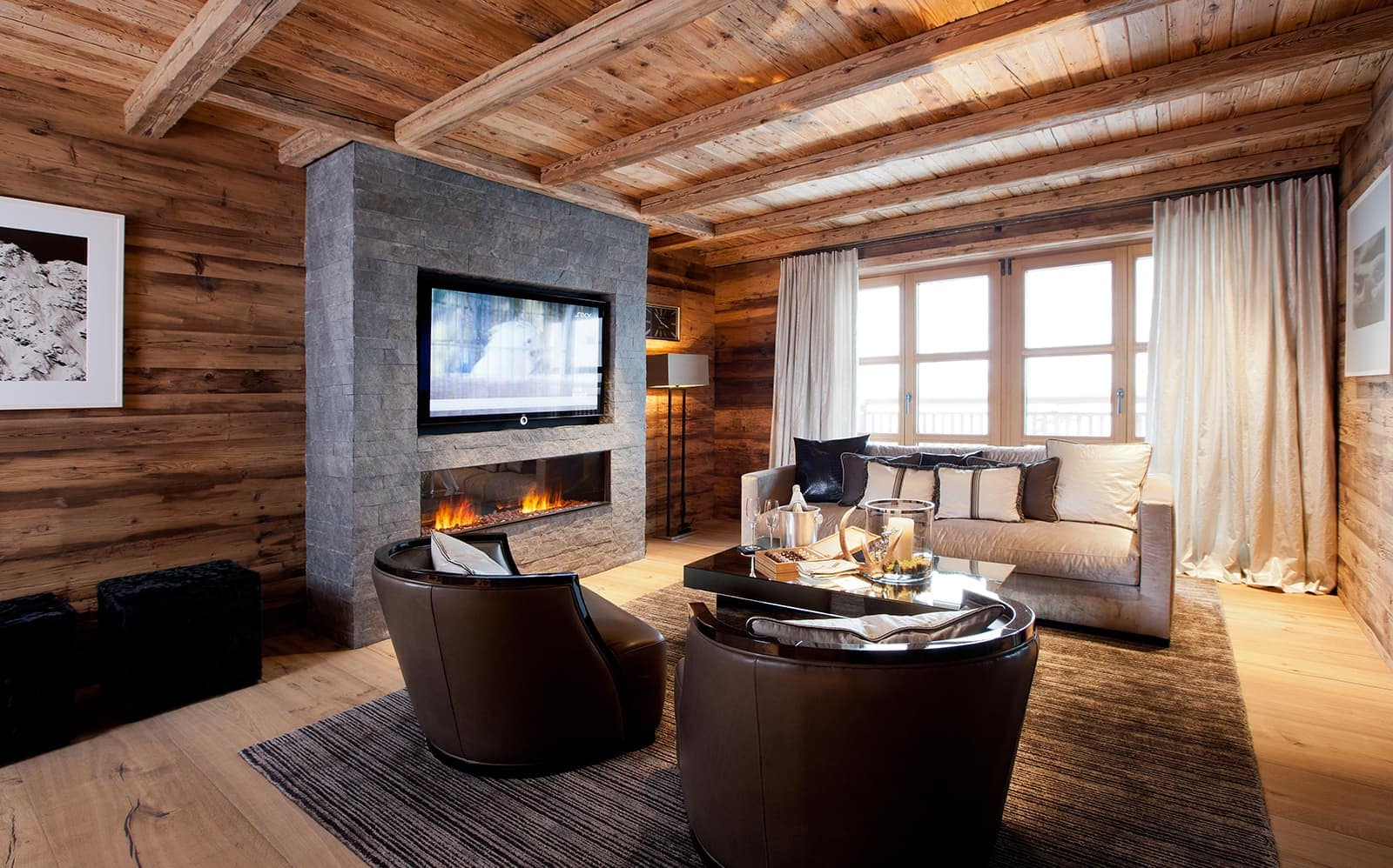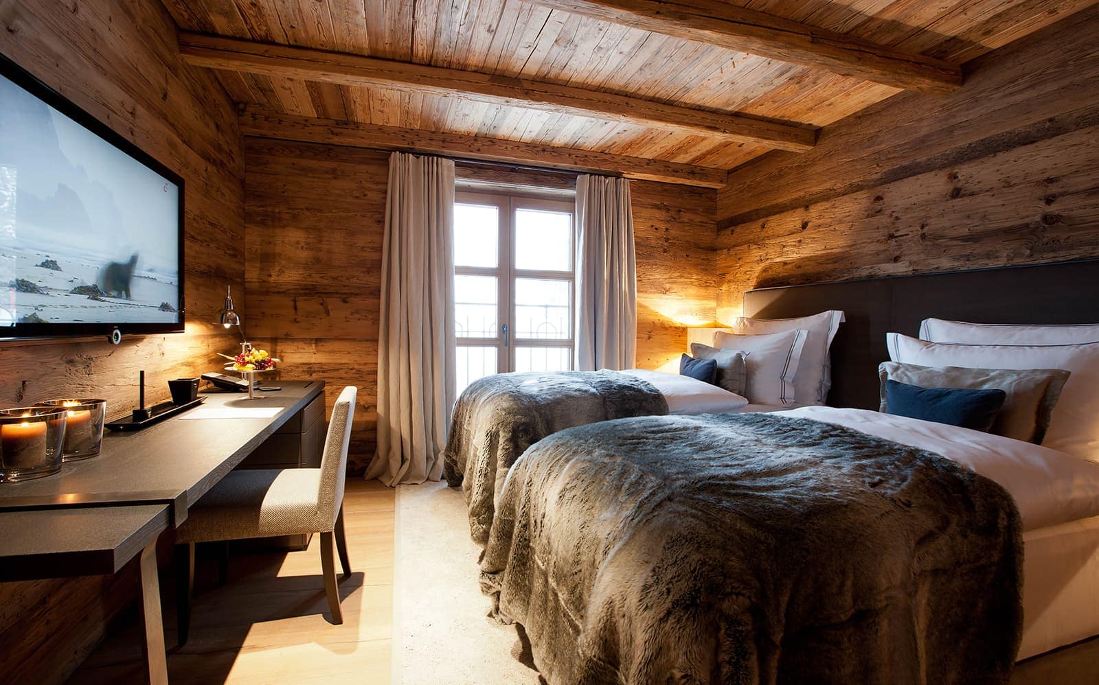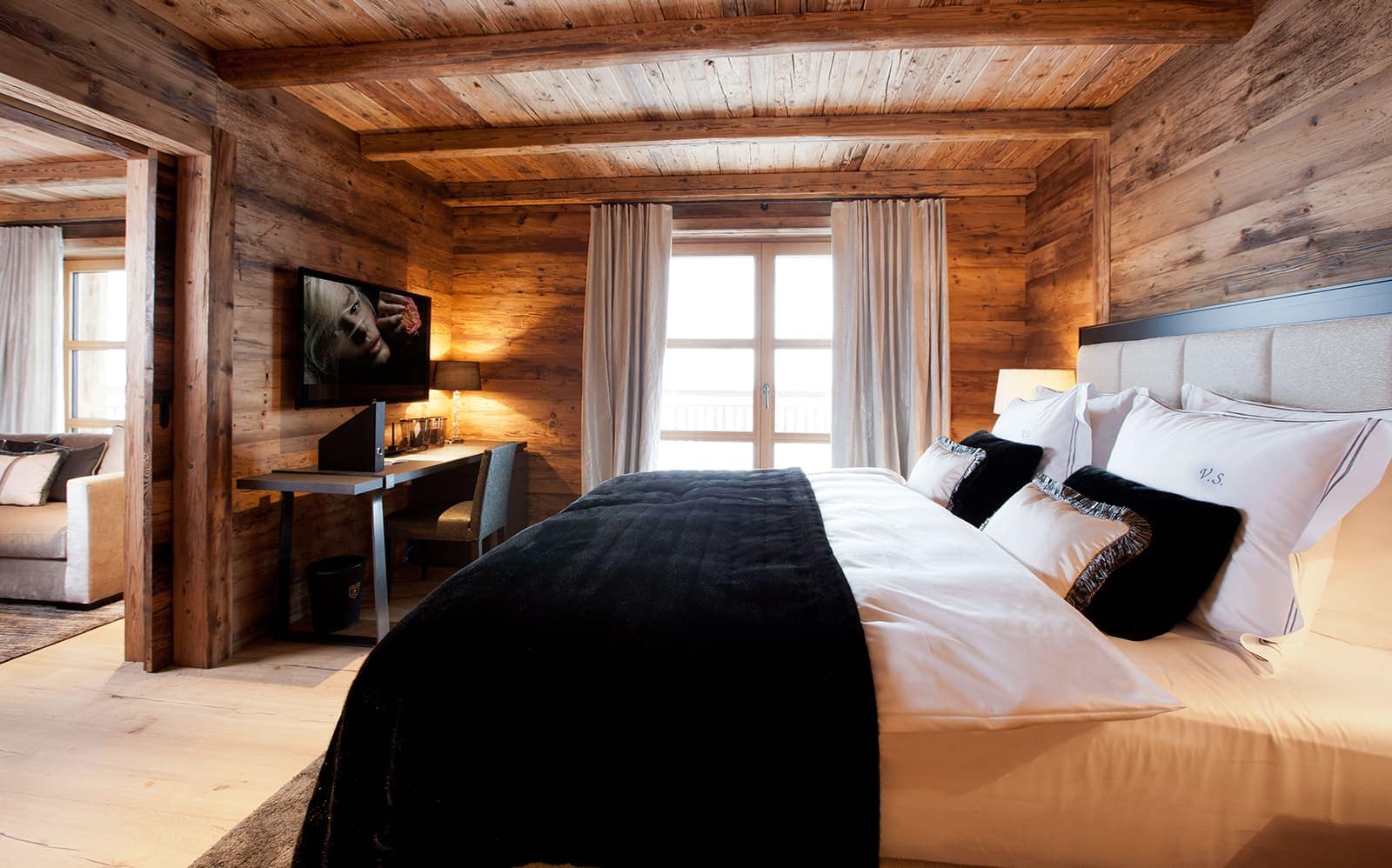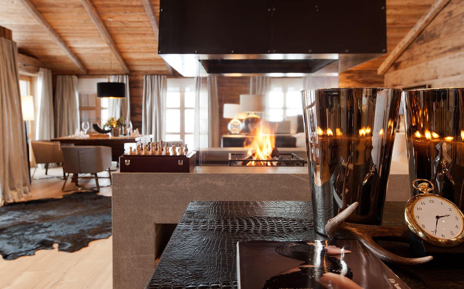 Chalet N features nine exquisite suites, each designed as a private sanctuary. Warm fireplaces, soft candlelight, plush rugs, and irresistibly comfortable beds set the tone for refined Alpine living. Every suite includes a spacious lounge area, an elegant dressing room, and a beautifully appointed en-suite bathroom—along with breathtaking views of the surrounding mountains.