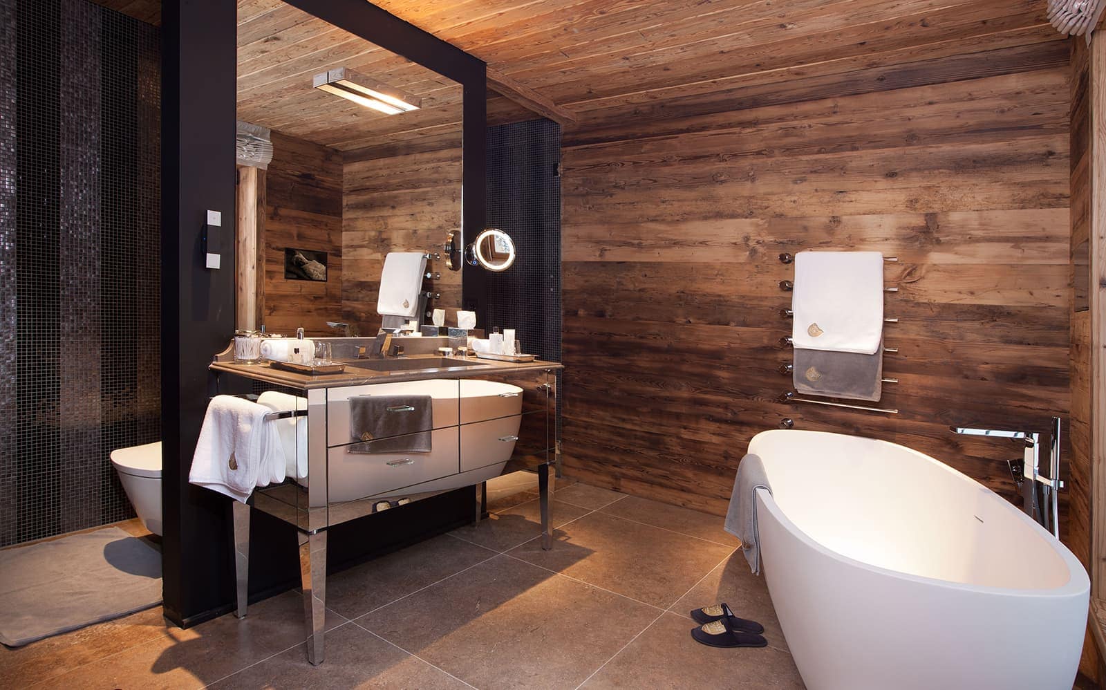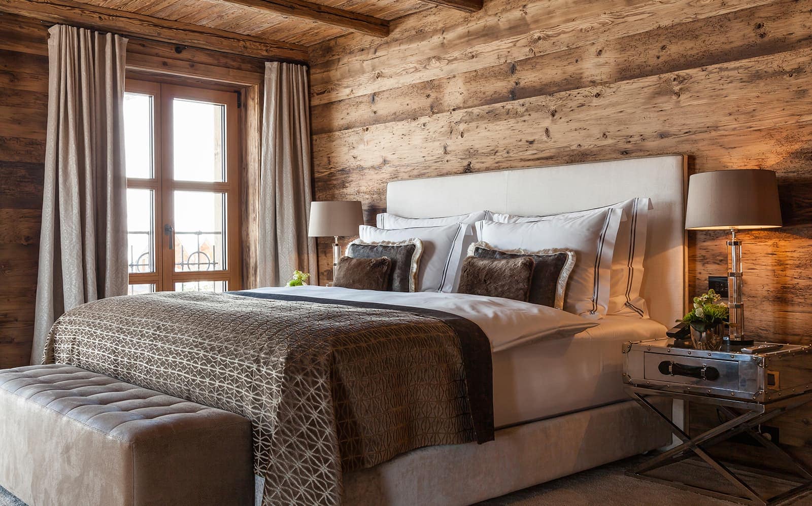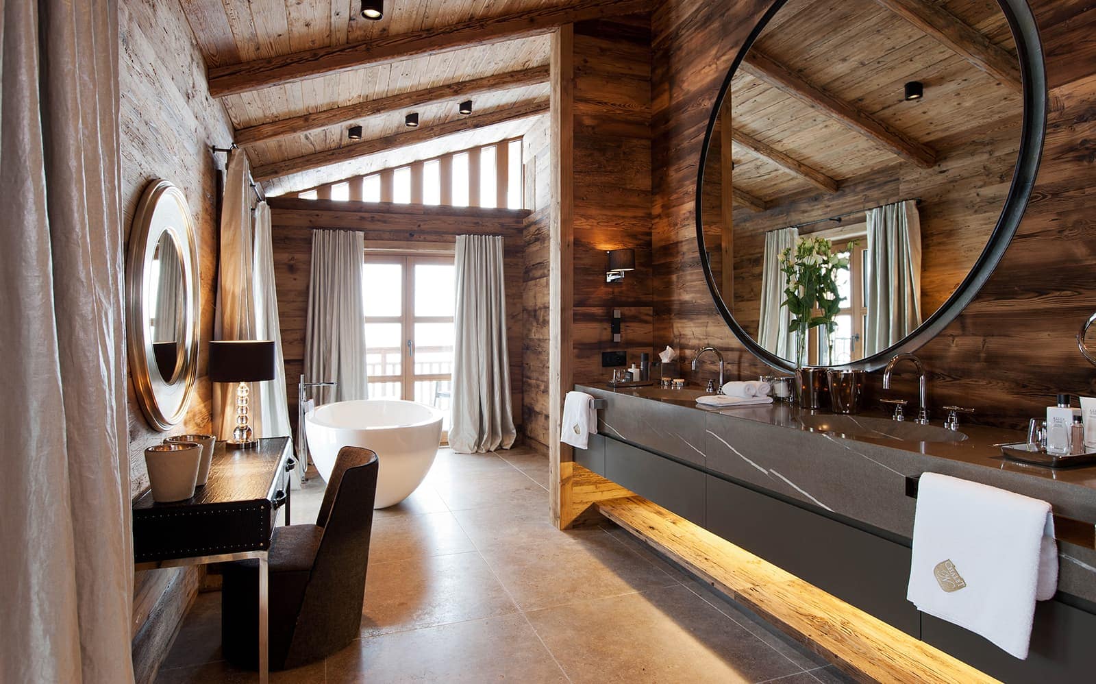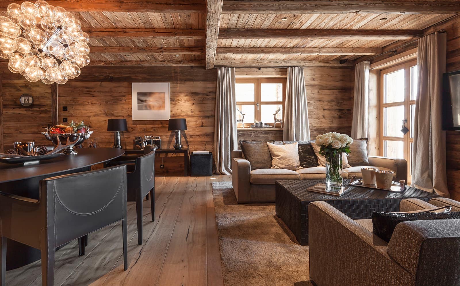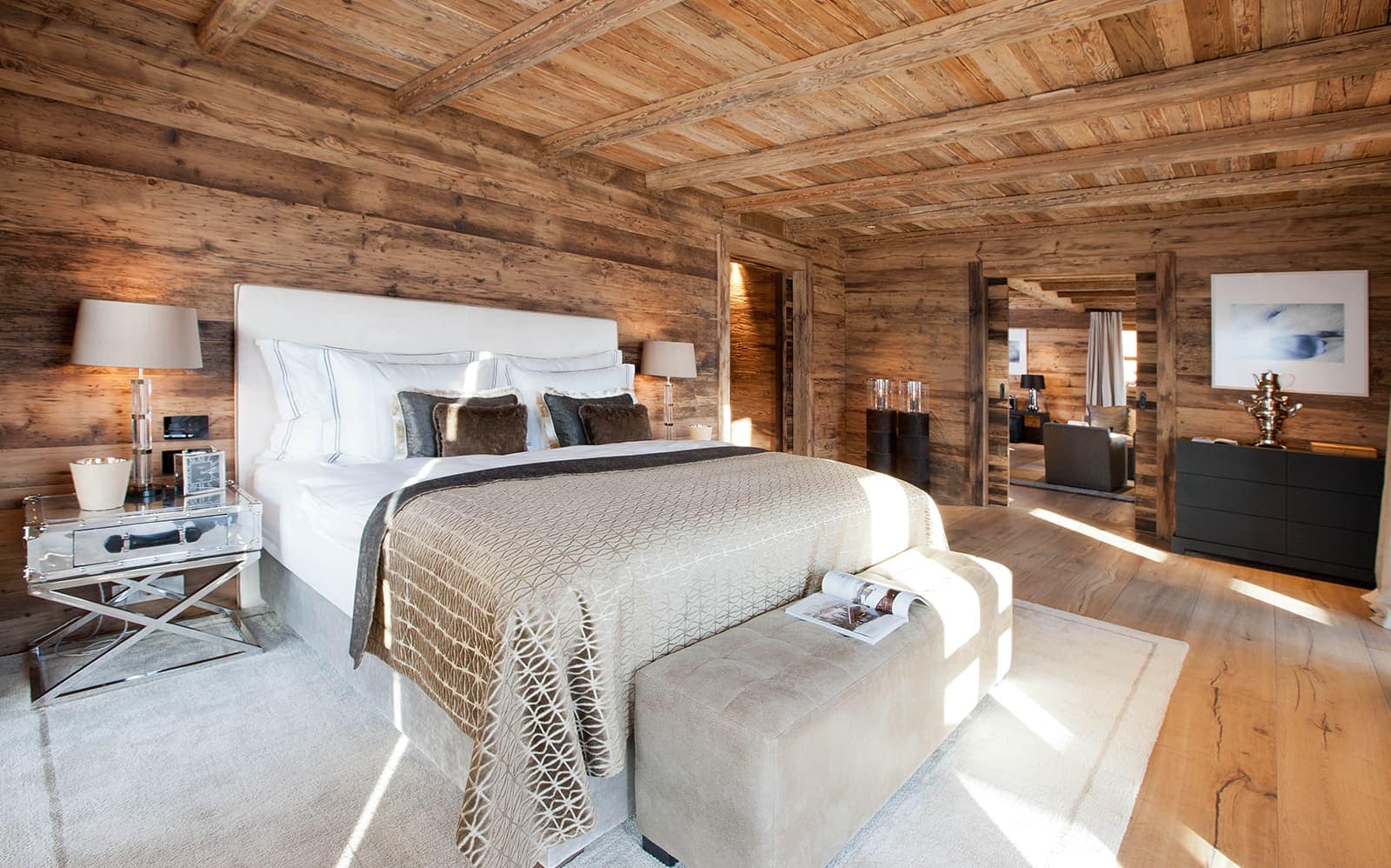 Chalet N features nine exquisite suites, each designed as a private sanctuary. Warm fireplaces, soft candlelight, plush rugs, and irresistibly comfortable beds set the tone for refined Alpine living. Every suite includes a spacious lounge area, an elegant dressing room, and a beautifully appointed en-suite bathroom—along with breathtaking views of the surrounding mountains.