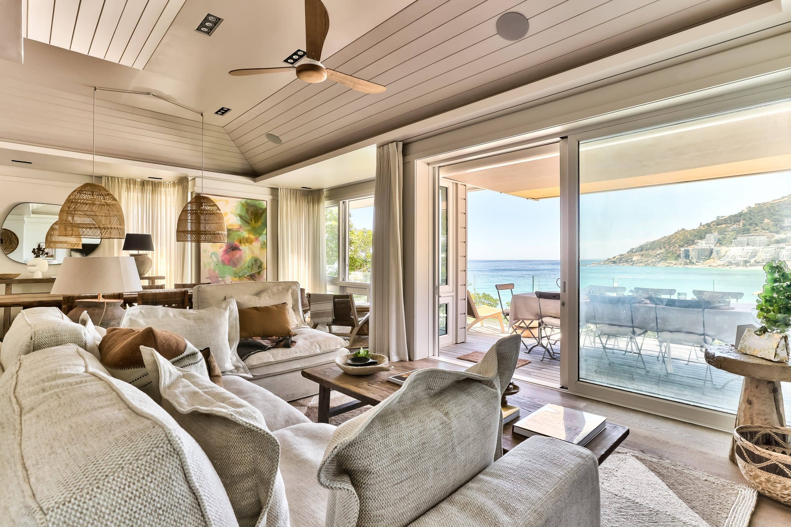 Each bedroom boasts king-sized beds, modern bathrooms, and ocean views, while the open-concept living area, complete with an artisan dining table and Cape Town artworks, opens directly to the beachside deck. Additional highlights include contemporary works by Carolina Salinas, Chris Denovan, and Xanthe Scout Lardner-Burke, offering an art-filled interior. The fully equipped kitchen provides ocean views, while the sun-drenched deck—complete with a BBQ area and dining table—invites relaxed al fresco meals.