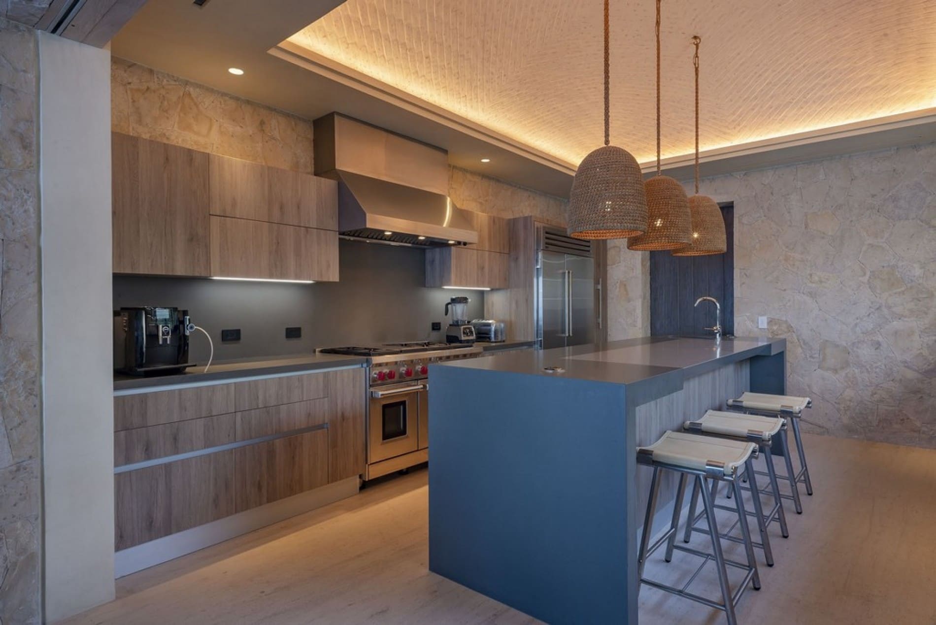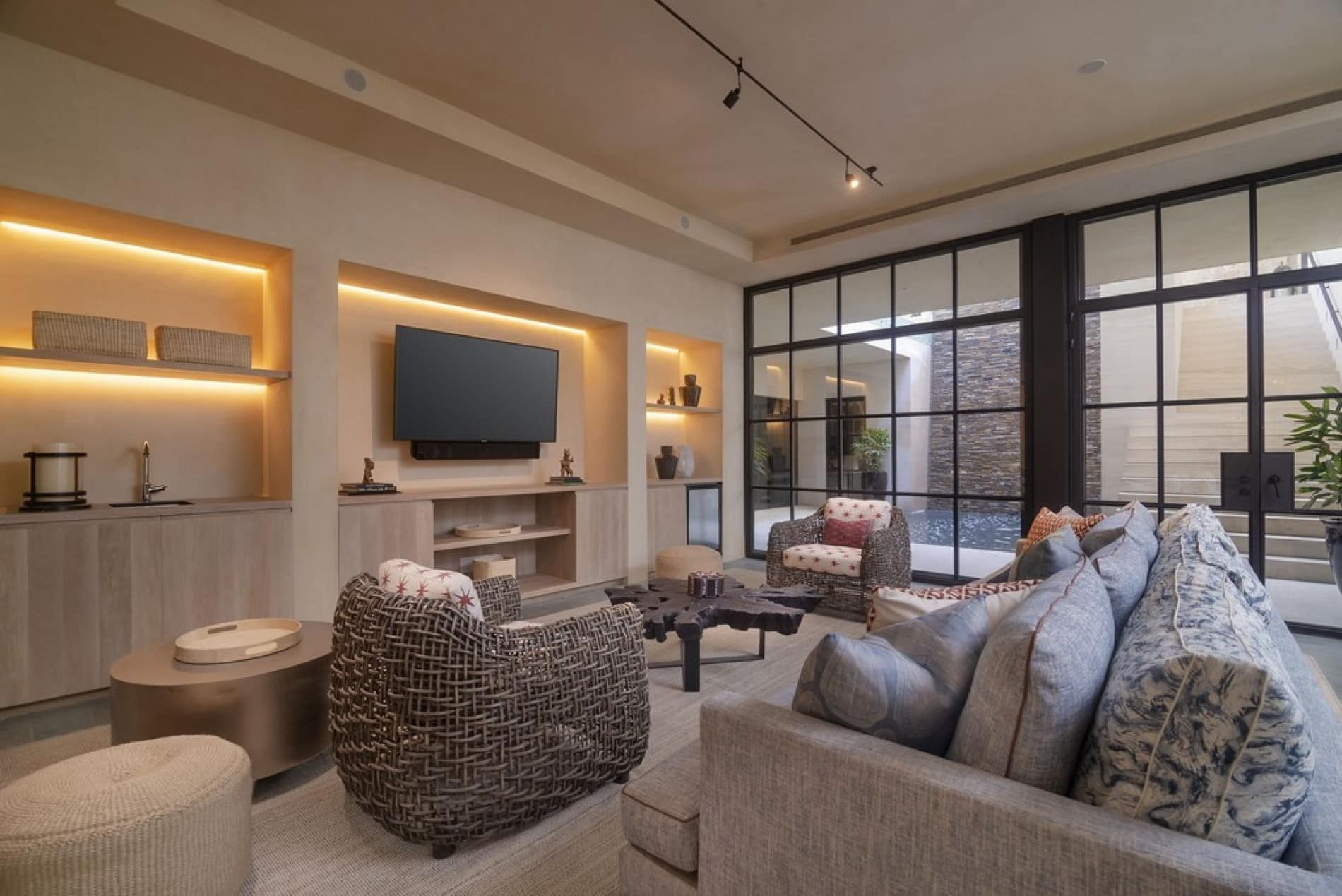 Living and Dining: A stunning 60-foot infinity pool anchors the space, featuring a submerged lounge area and a kid-friendly zone. An oversized jacuzzi offers sweeping views of a secluded sandy cove. Private beachside cabanas invite you to unwind with a cocktail in hand. Alfresco dining comes to life at the open-air dining table, perfect for sharing meals under the stars. Enjoy casual evenings with a 65” TV and custom-built pizza oven, perfect for watching the game or hosting a relaxed family dinner.