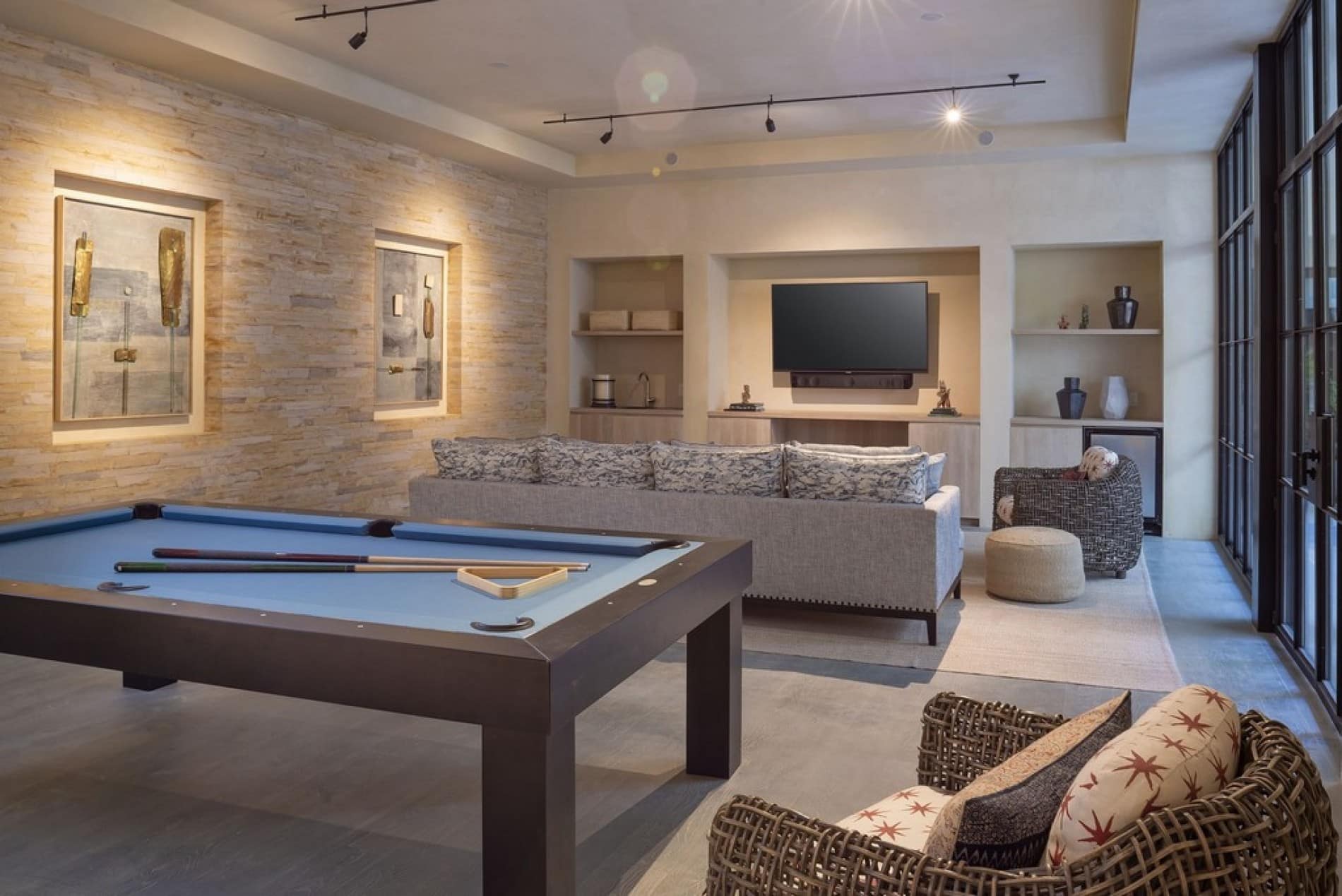 Media & Games: Private Media Room with 150” screen, laser projector and REVEL surround sound • Seating for up to 11 guests • Lounge Room with plush couches, TV, and pool table • Game Room featuring a 65” 4K UHD TV • Focal sound bar • Sonance audio system • Pool table • Dartboard • Retro gaming console for nostalgic fun.