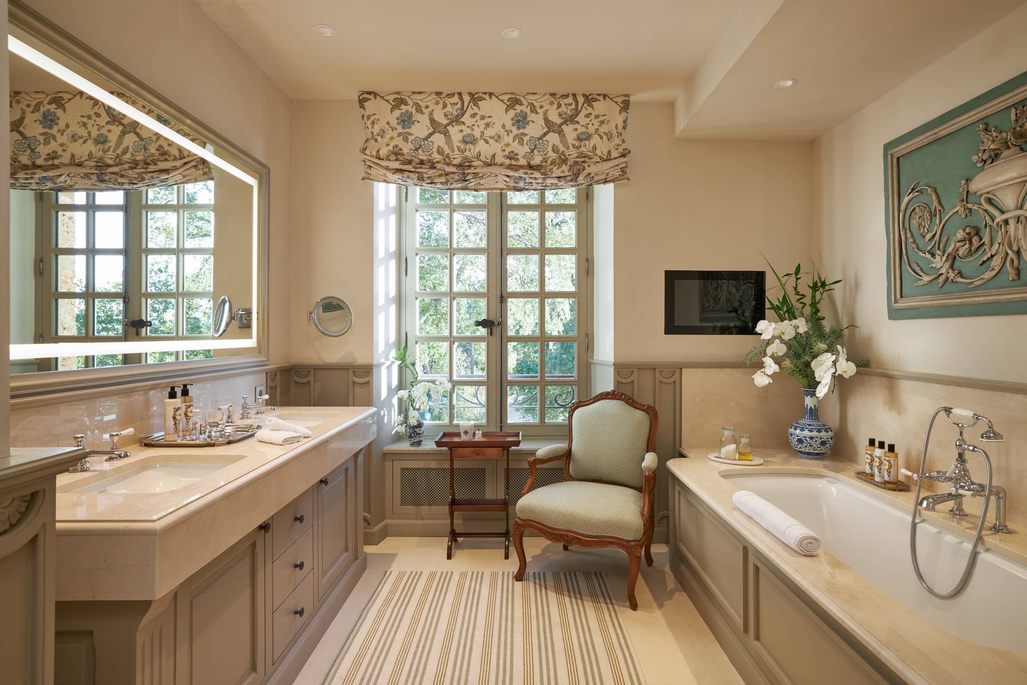 A focal point of the property, the bastide stands high atop a stone staircase, serving as a noble reminder of its storied past. From here a magnificent panoramic view of the green hills towards Aix can be enjoyed. Immersed in lush green gardens, the main house features guest suites and bedrooms, a comfortable library with a vast selection of multilingual titles covering history, arts and cinema. Wine and dine on one of our terraces or in the gracious dining room with a large fireplace enjoying family-style meals or a French gastronomique menu prepared by the estate chefs. Feel at home as you relish the relaxing atmosphere, elegant architecture and bucolic natural beauty of the château.