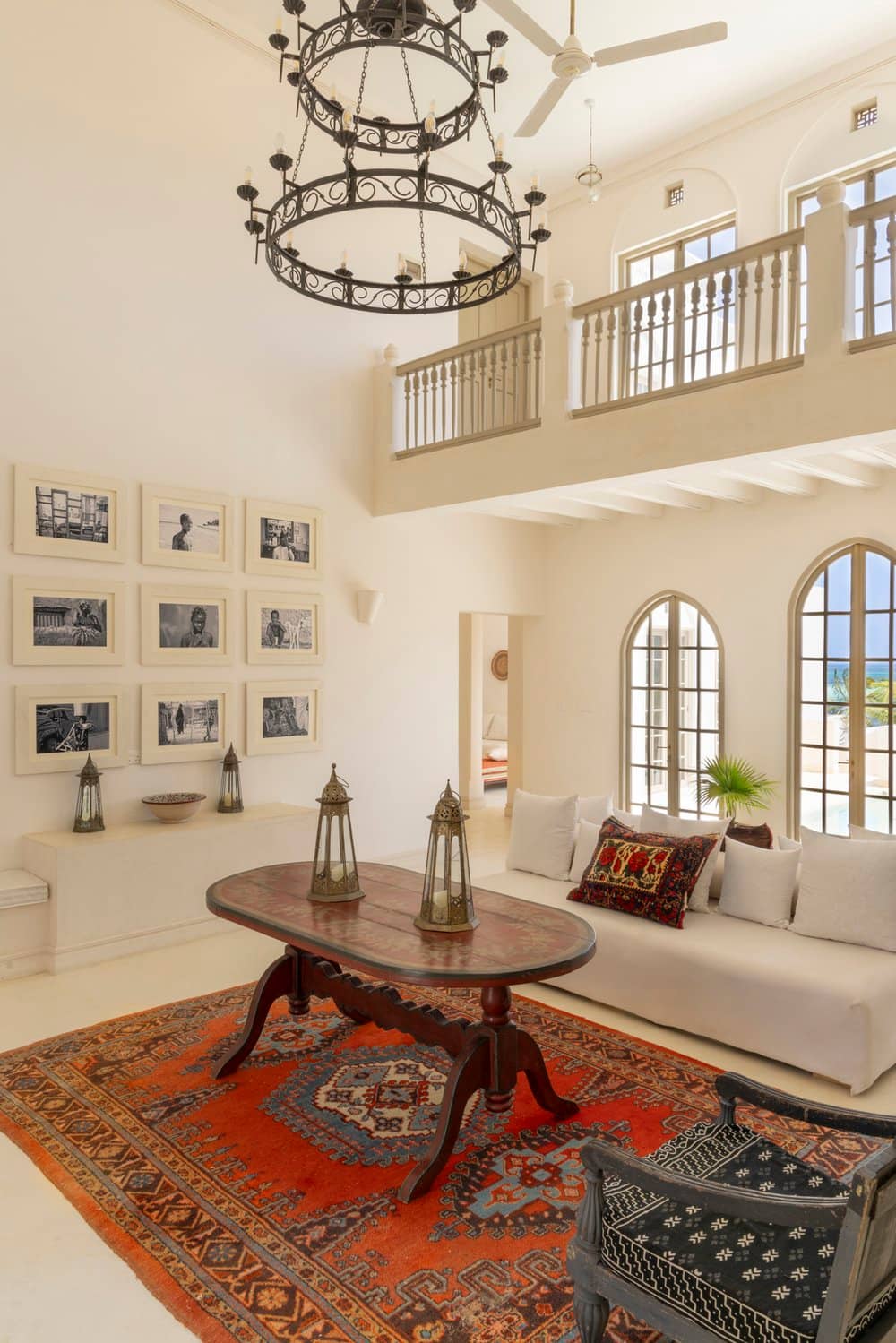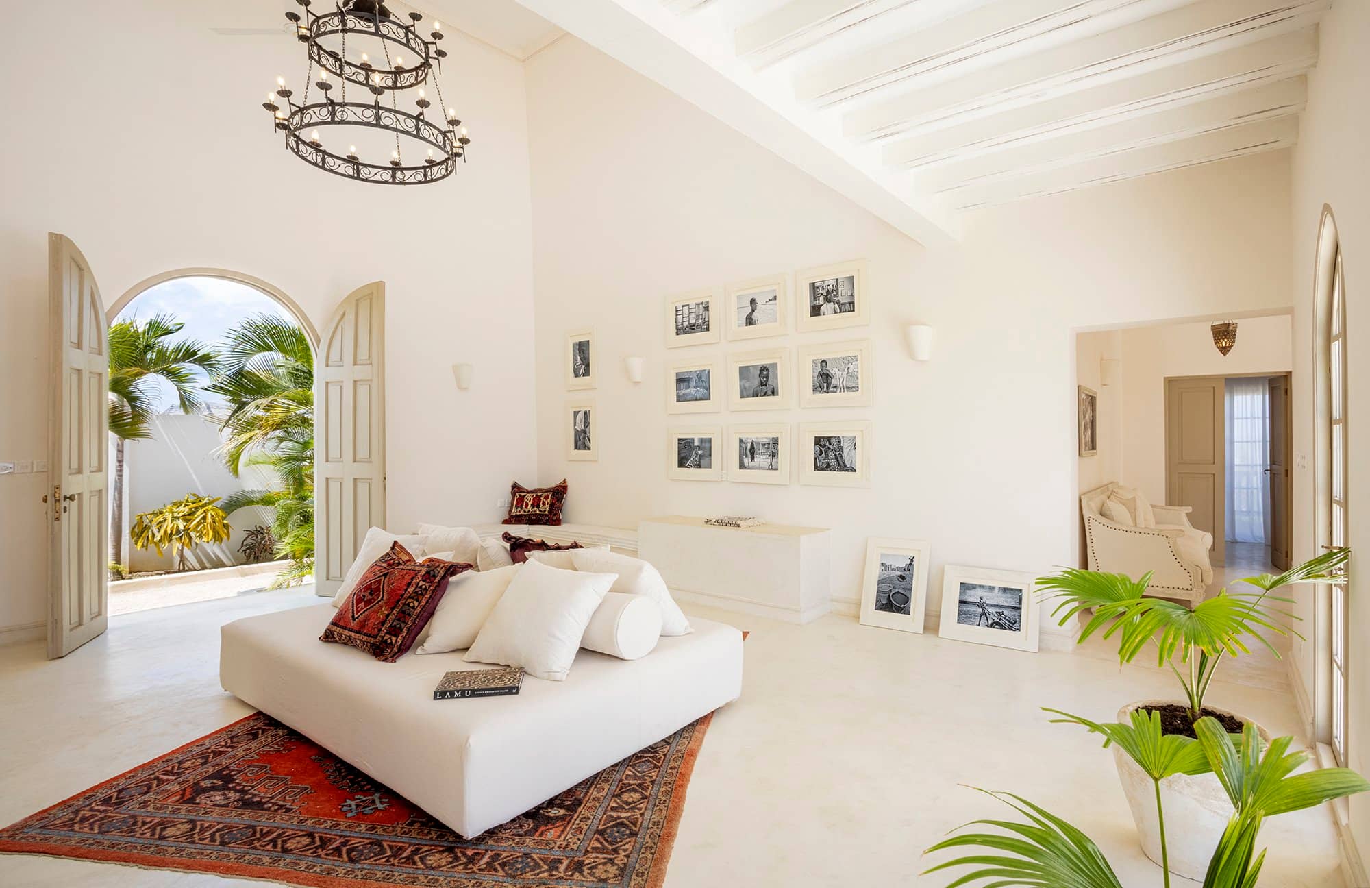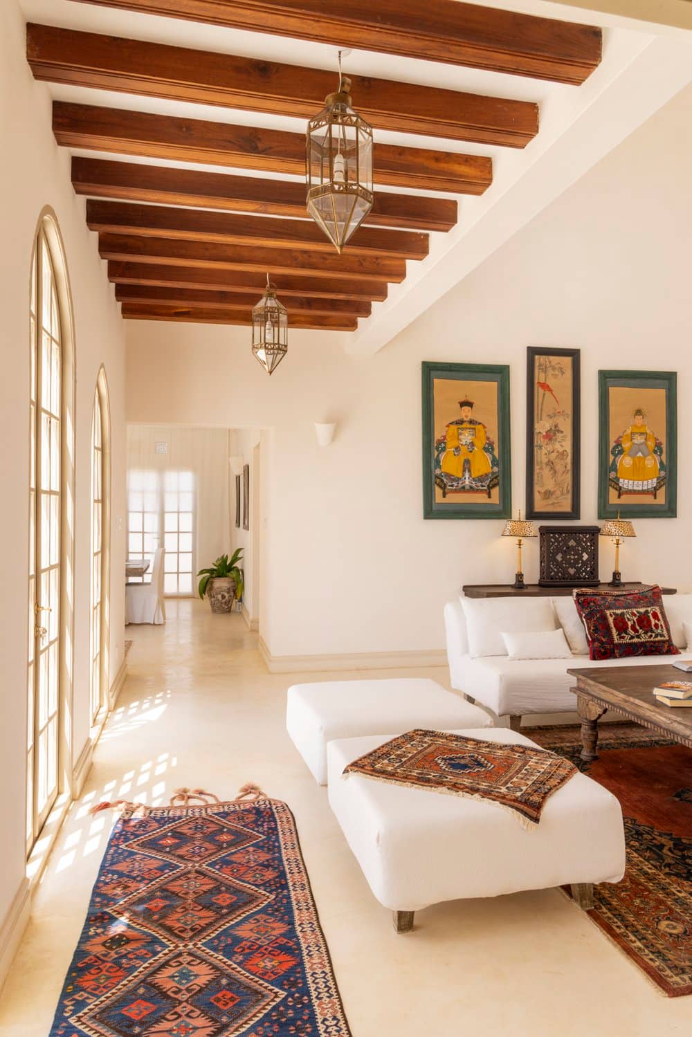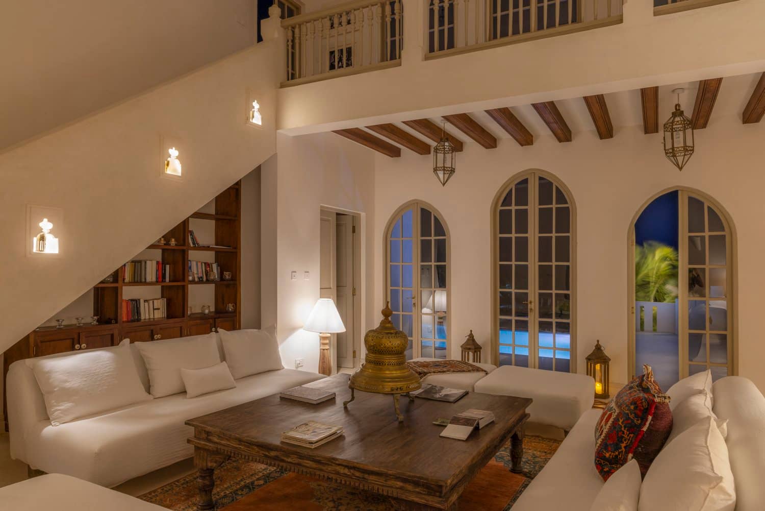 The third sitting area is equipped with a big smart TV, ideal for watching a movie, evening reading, or for guests who want to use a sitting room near one of the sleeping areas. The house’s furniture collection features pieces from around the world.