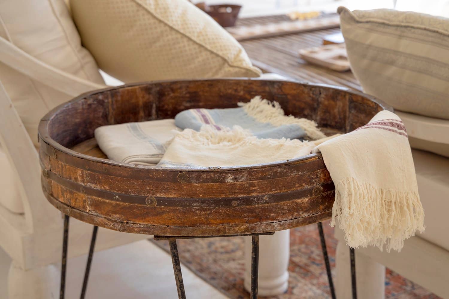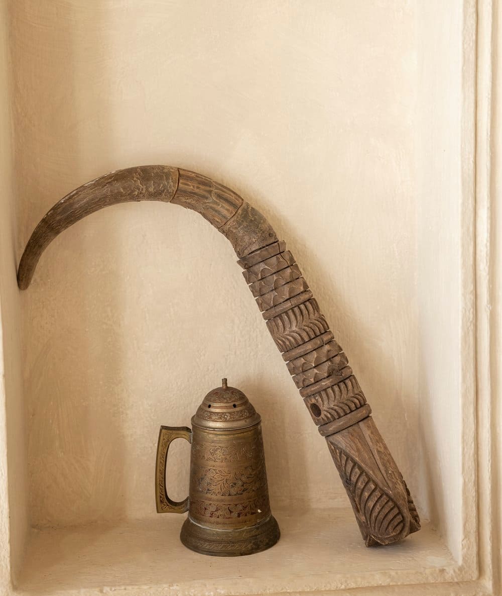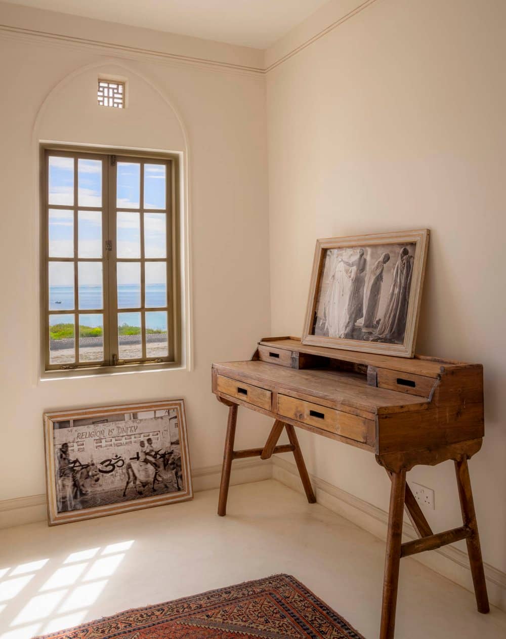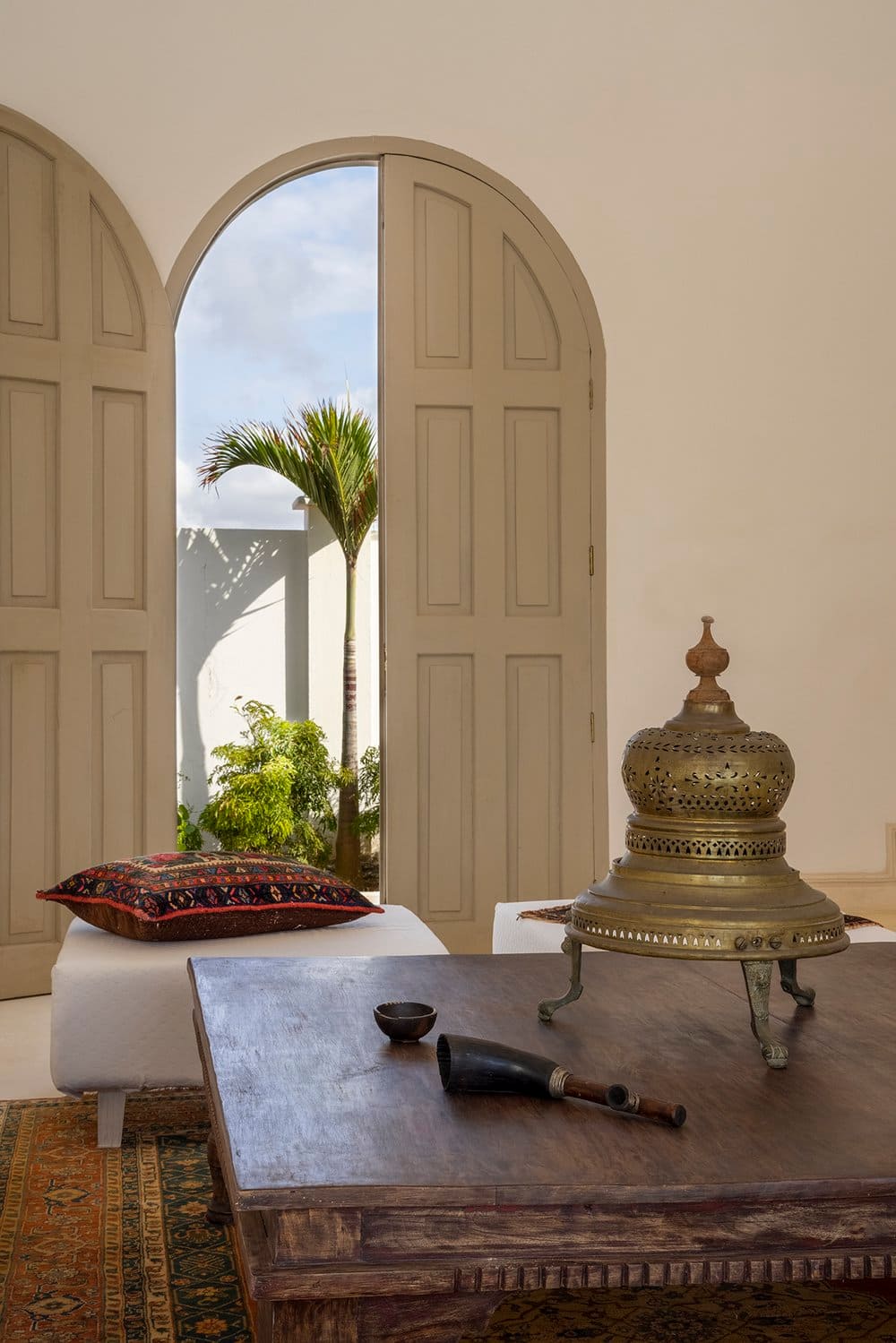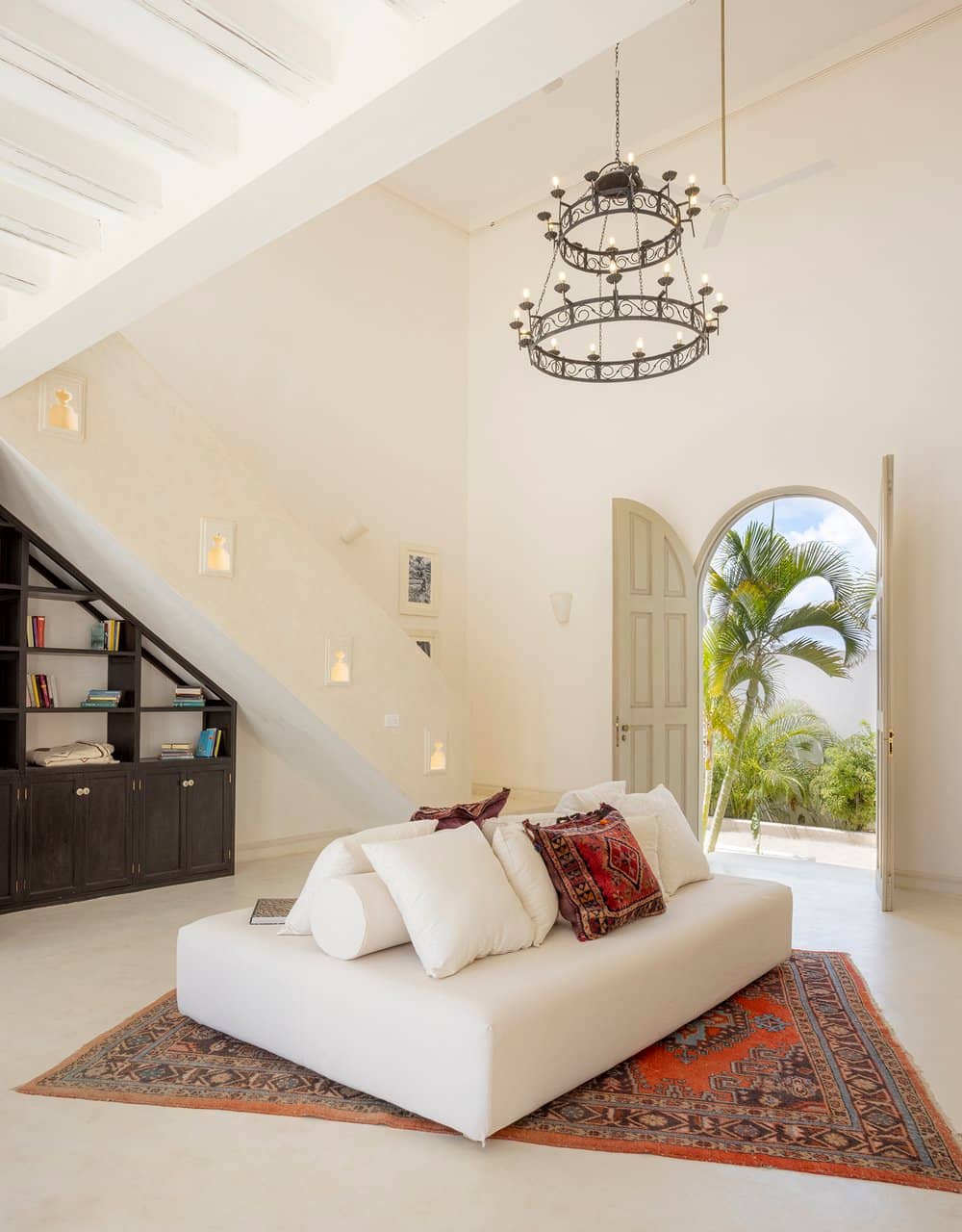 The third sitting area is equipped with a big smart TV, ideal for watching a movie, evening reading, or for guests who want to use a sitting room near one of the sleeping areas. The house’s furniture collection features pieces from around the world.