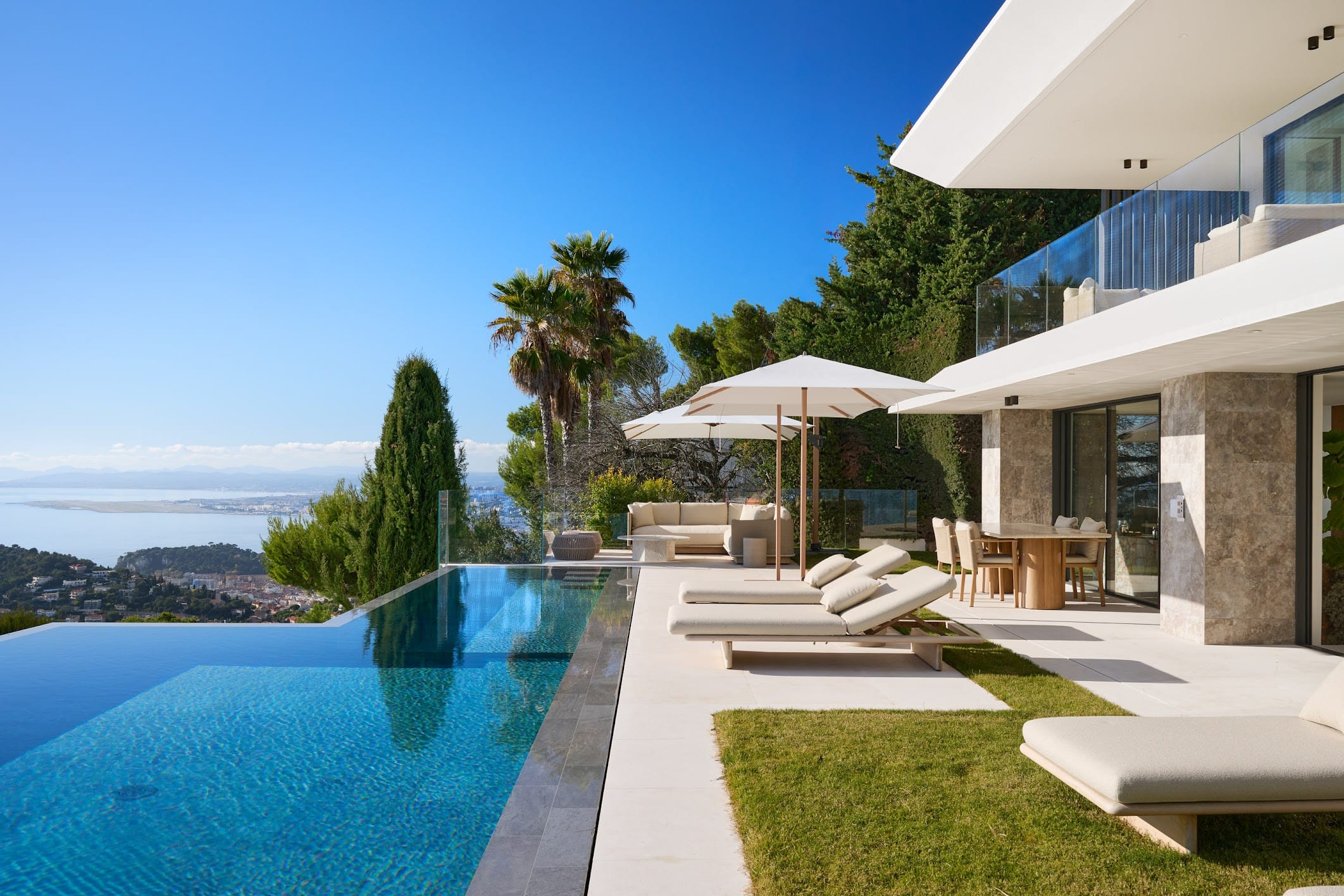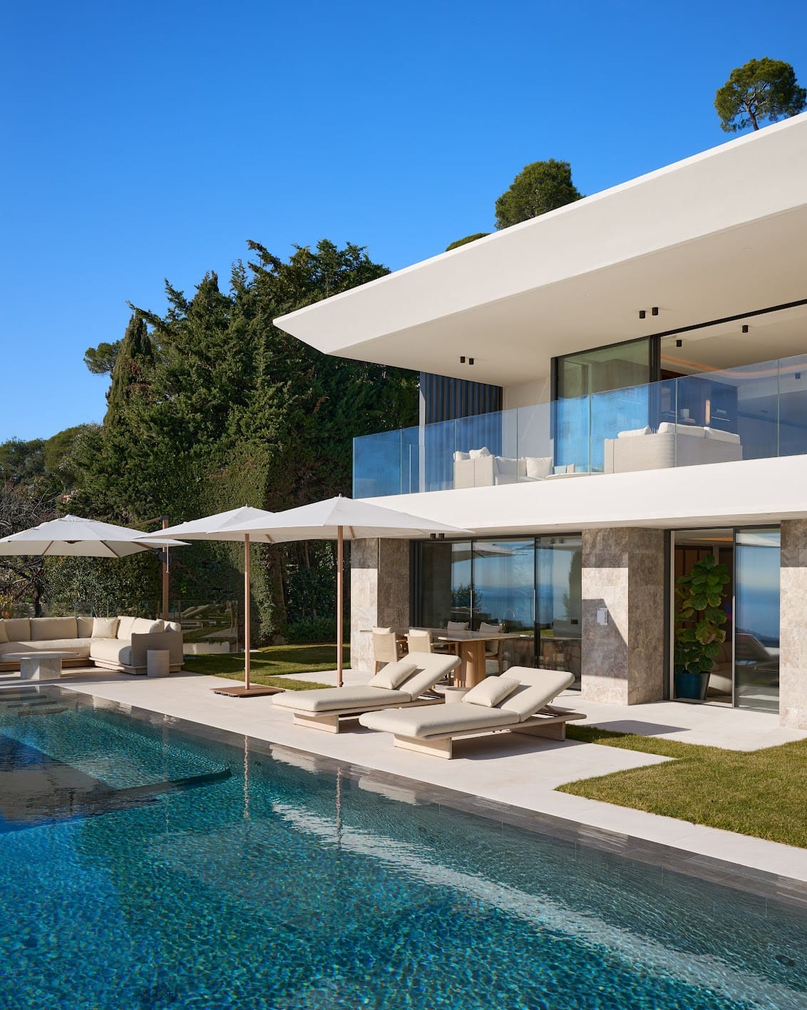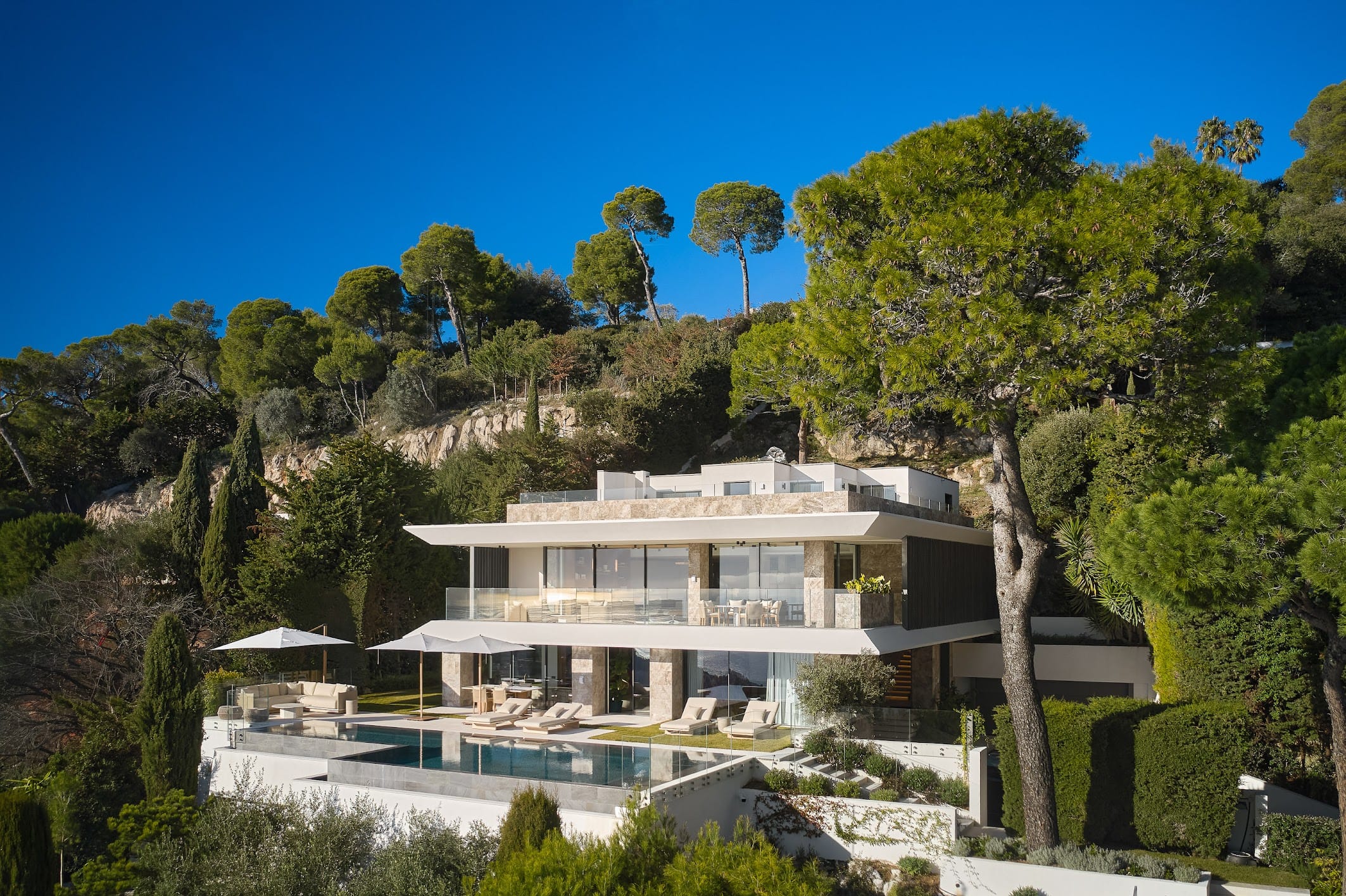 Perfect for both relaxation and entertaining, the villa offers two spacious living areas, a contemporary open-plan kitchen and dining space, a sophisticated bar, and a state-of-the-art cinema room. Outdoors, guests can unwind by the pool with its pool house and lounge areas, while a private spa, complete with an indoor pool, sauna, and fully equipped gym, adds the finishing touch to this exceptional French Riviera retreat.