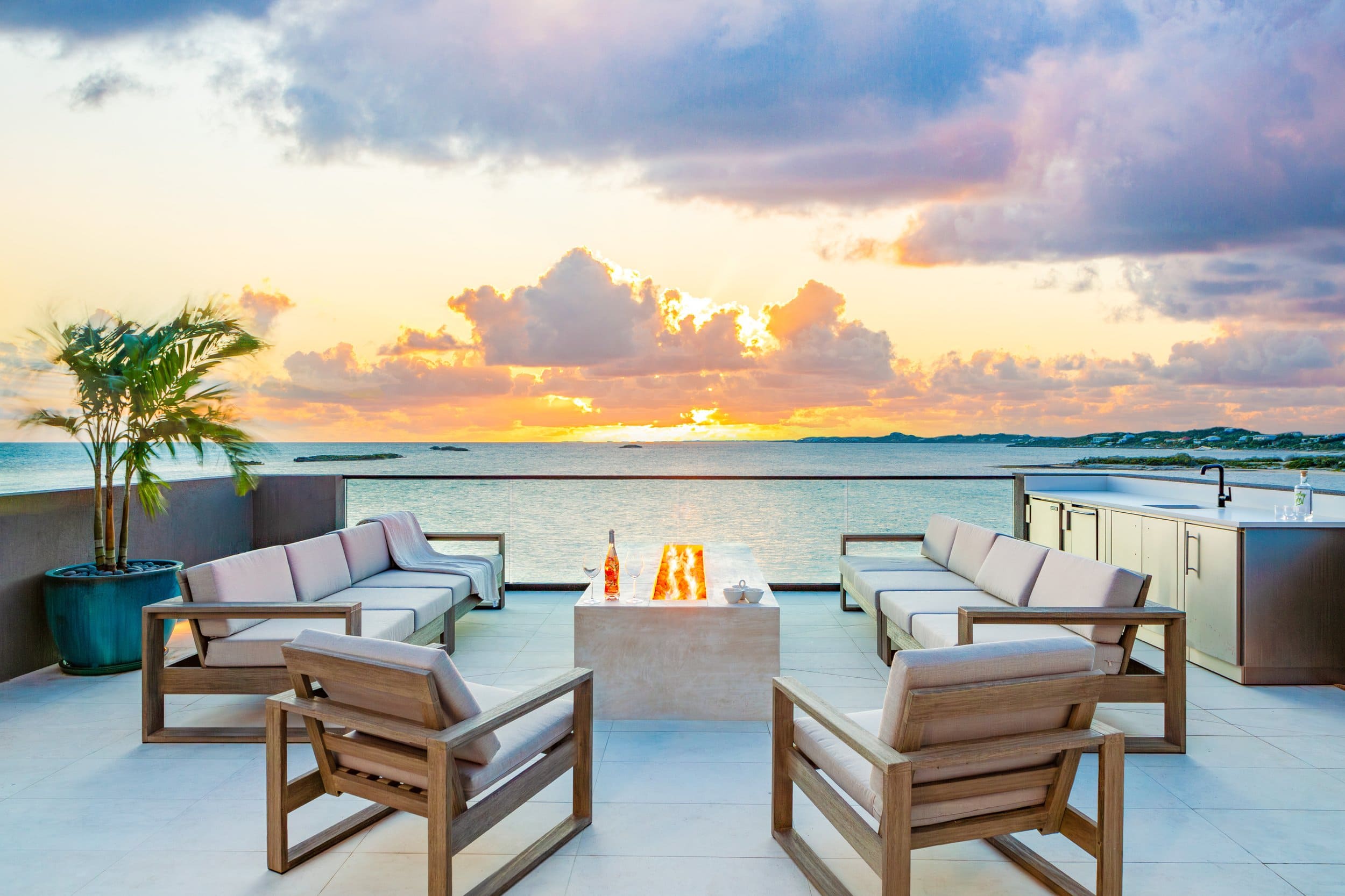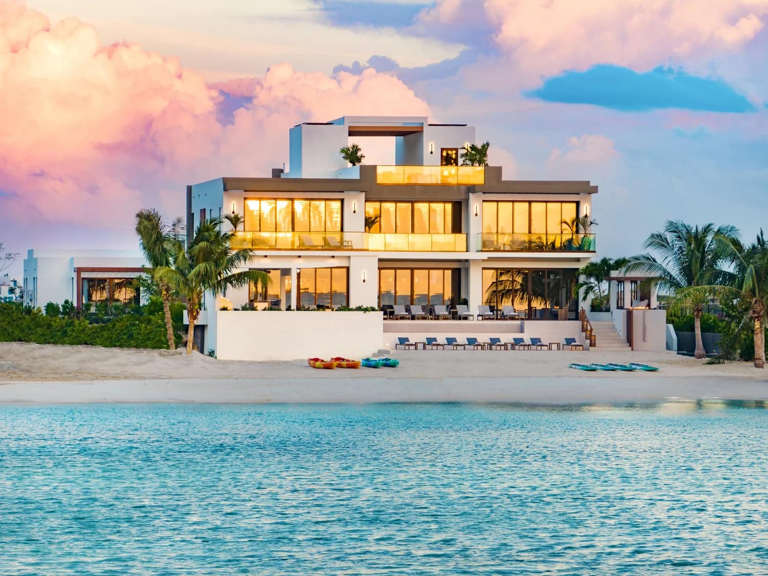 Outdoors, 7,800 square feet of beautifully curated space await, including 180 feet of private beachfront and a tranquil zen garden. A heated swimming pool, beachfront deck with bar, firepits, and outdoor dining area overlook the powdery white sand and shimmering turquoise waters. Unwind in the jacuzzi, savor panoramic views from the rooftop deck, enjoy a handcrafted drink at the outdoor bar, or stroll down to the shoreline for a refreshing swim.