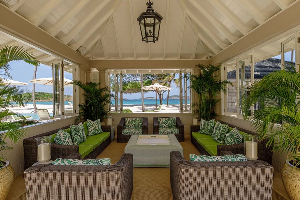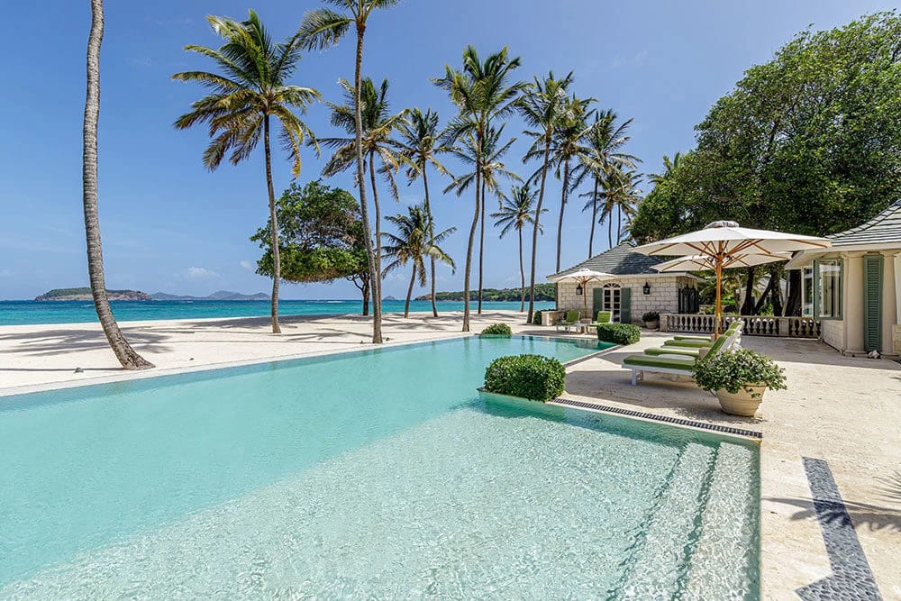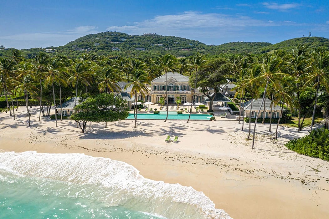 Inside, opulent formal living and dining rooms open onto expansive verandas that wrap around the house, leading seamlessly to the powder-white sands of L’Ansecoy Bay. The beachfront swimming pool, shaded by gently swaying palms, is simply magnificent.