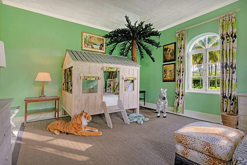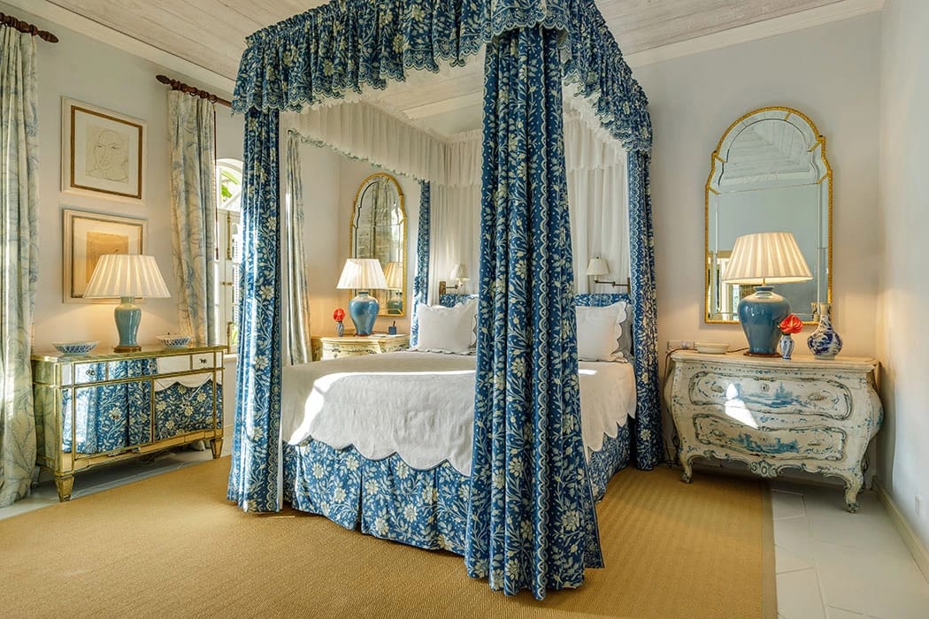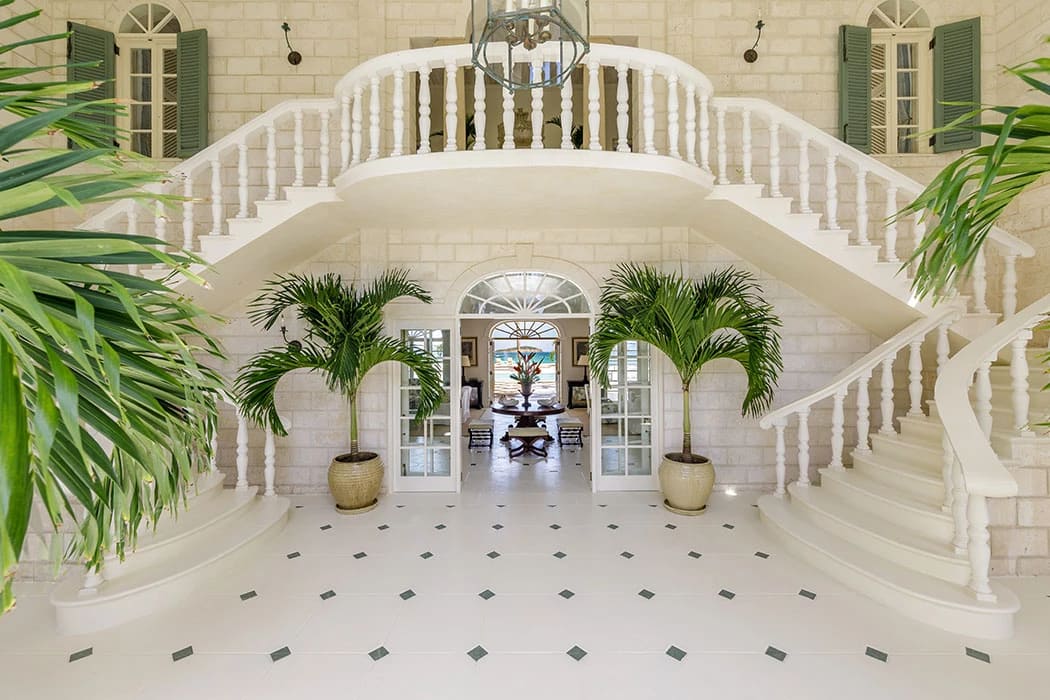 A spectacular double-height, palm-filled entrance hall with a sweeping dual staircase sets a dramatic tone from the moment you arrive. The villa’s architecture beautifully blends the timeless influences of Oliver Messel and Andrea Palladio, combining classic grandeur with tropical charm.