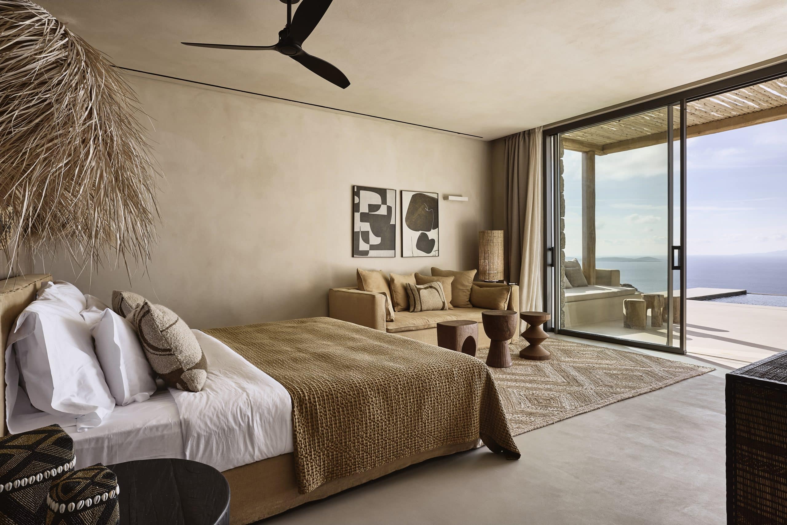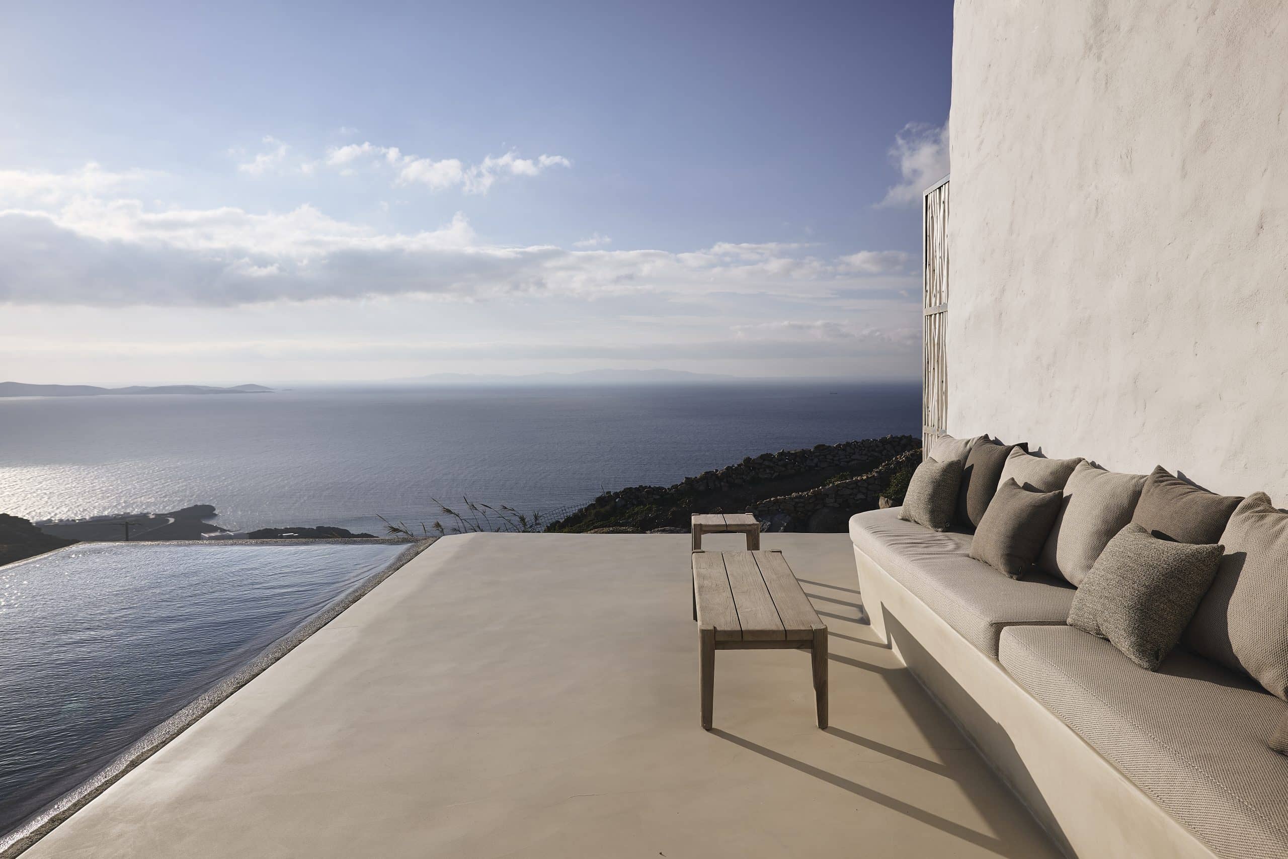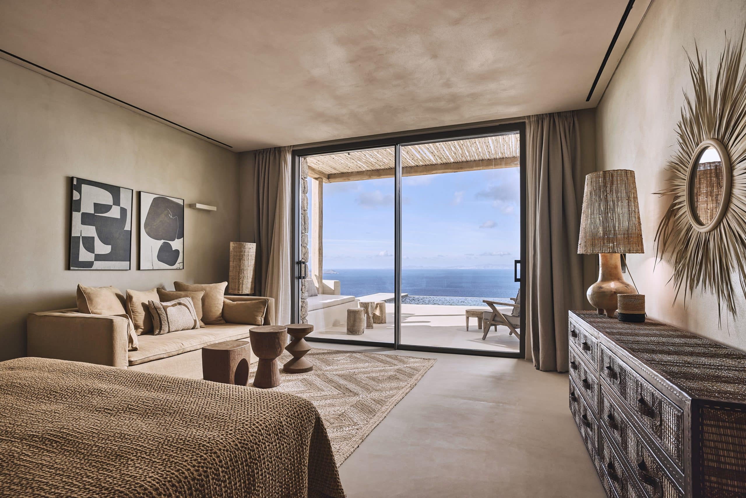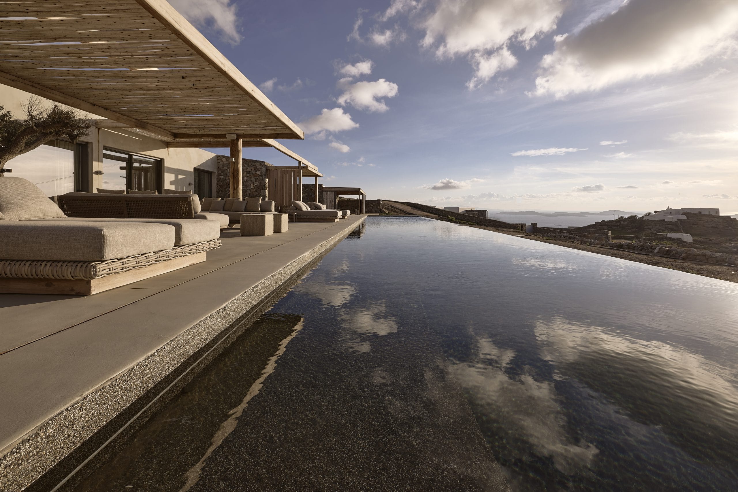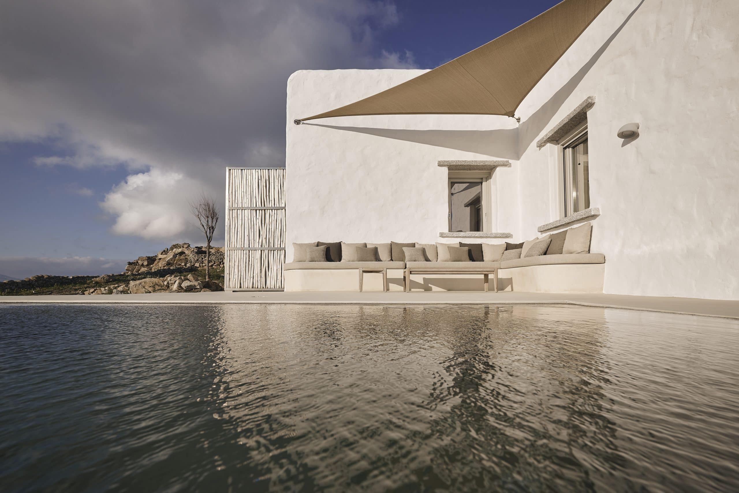The villa includes seven beautifully appointed bedrooms, among them two master suites with private lounges and two independent guest apartments, each featuring its own private infinity mini pool, that is ideal for guests seeking added privacy. The outdoor areas are truly spectacular, centered around a 26-meter infinity pool (heatable upon request) overlooking the sea and horizon. Beside the pool, guests can enjoy an open bar and lounge area, complete with a convenient outdoor shower. A fully equipped BBQ area provides the perfect setting for outdoor dining and entertaining.