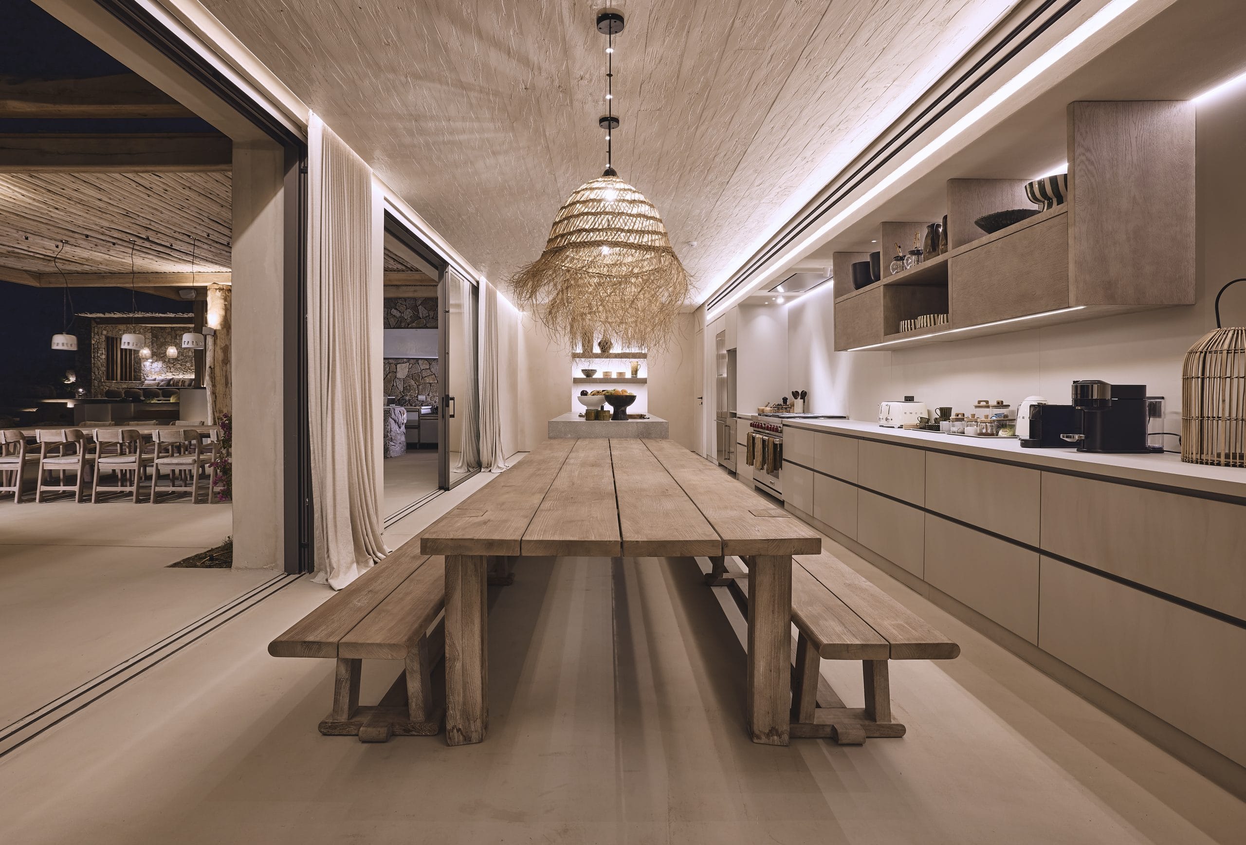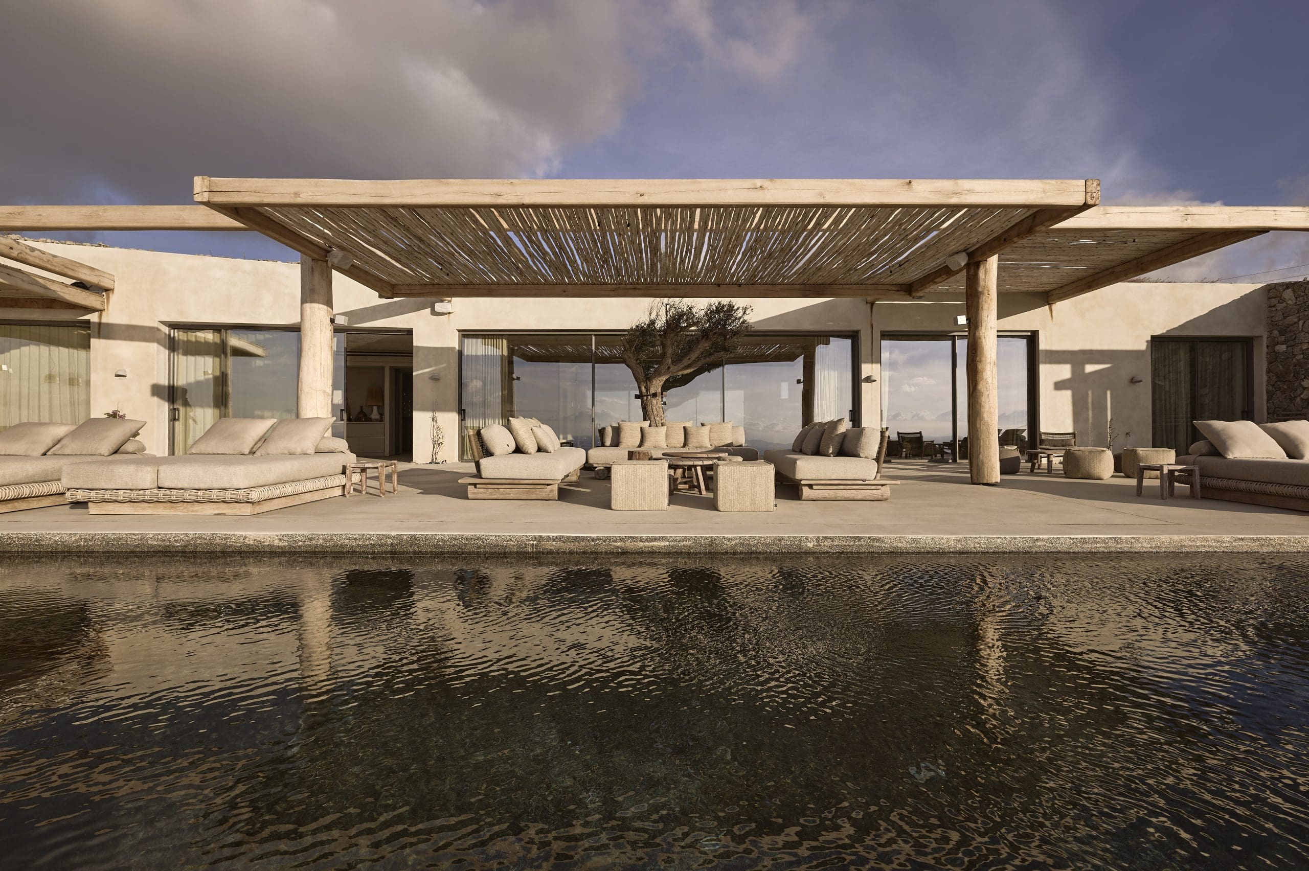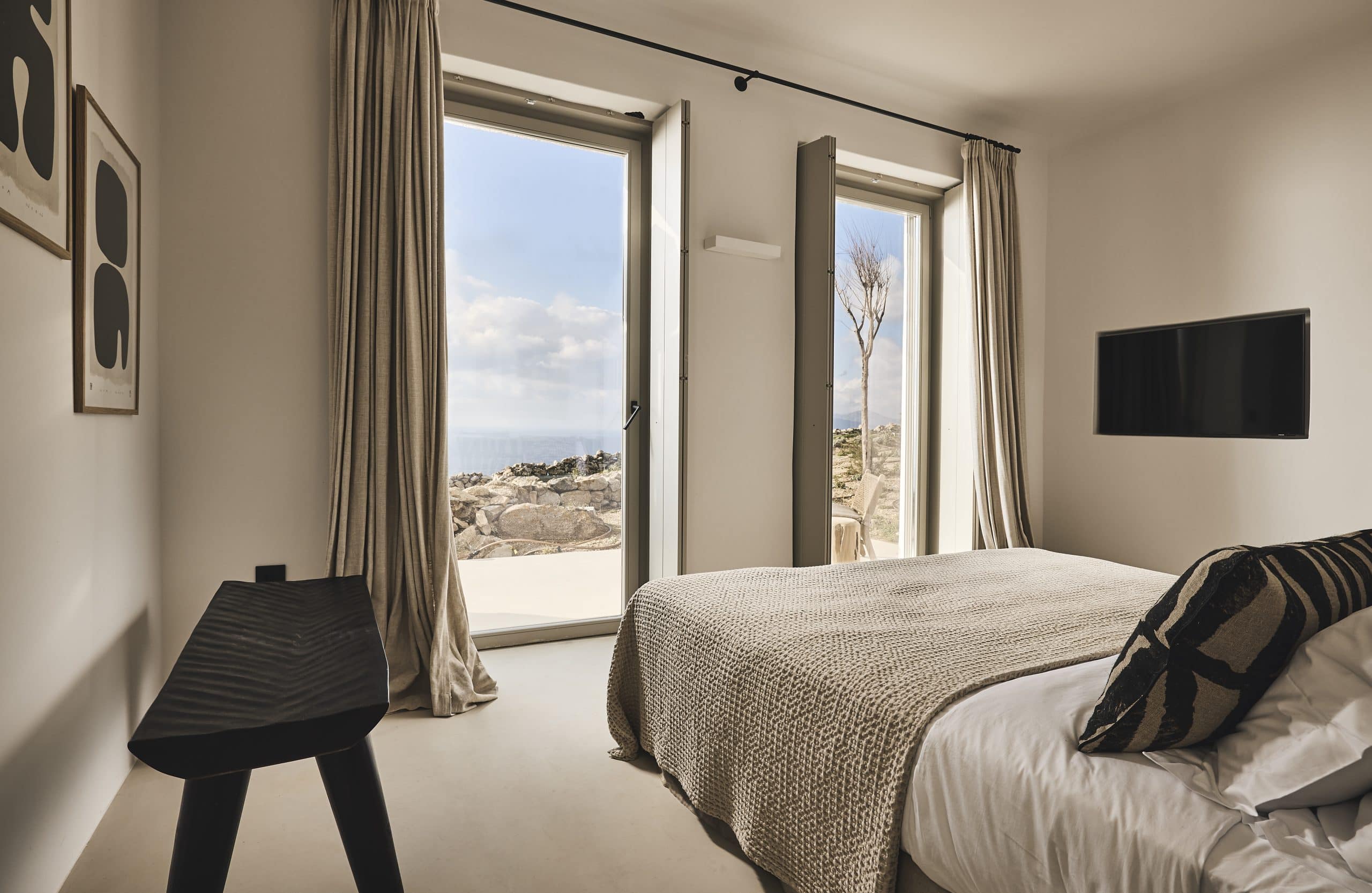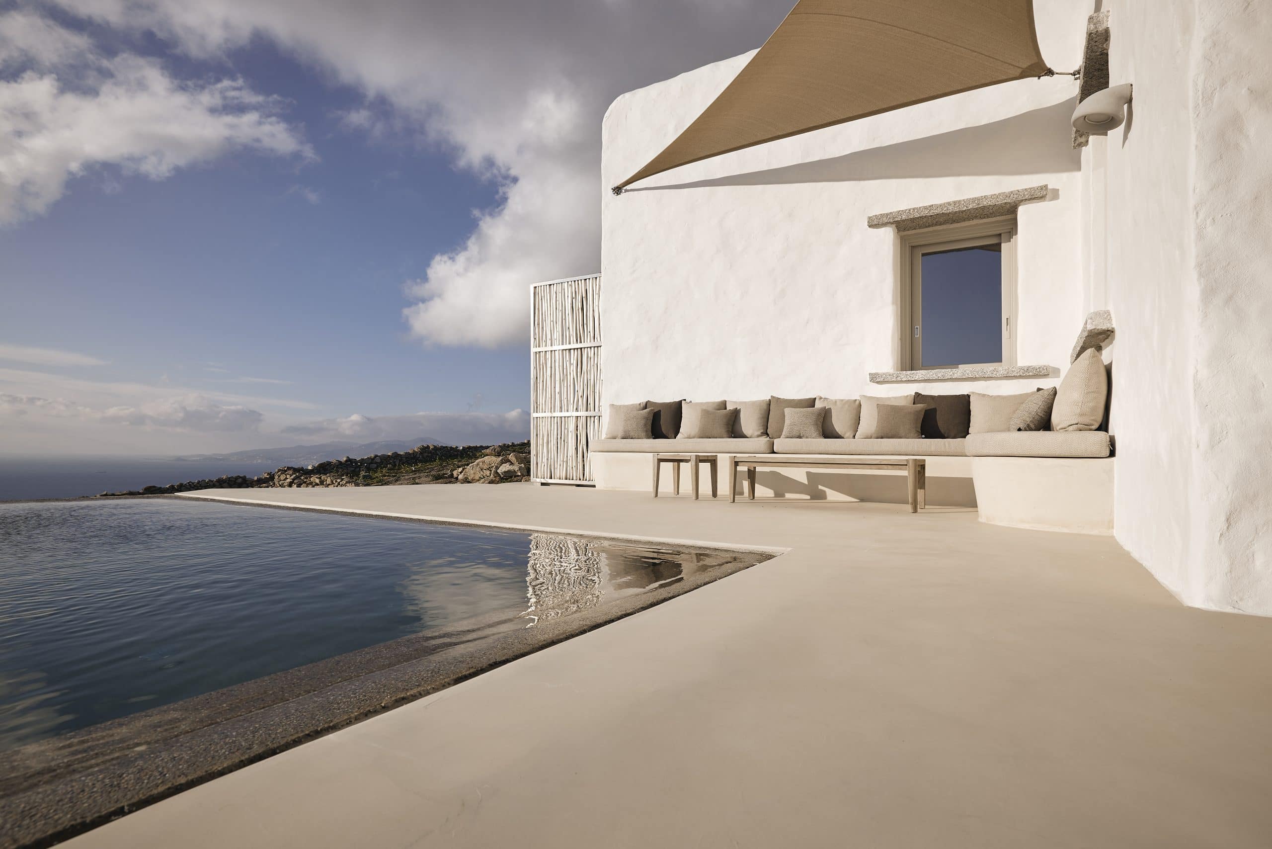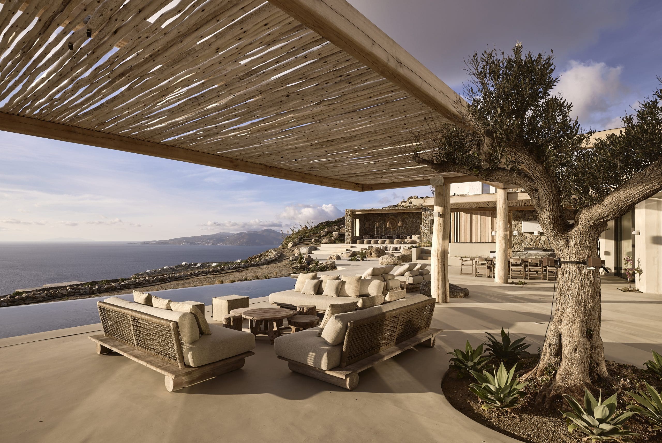 The villa includes seven beautifully appointed bedrooms, among them two master suites with private lounges and two independent guest apartments, each featuring its own private infinity mini pool, that is ideal for guests seeking added privacy. The outdoor areas are truly spectacular, centered around a 26-meter infinity pool (heatable upon request) overlooking the sea and horizon. Beside the pool, guests can enjoy an open bar and lounge area, complete with a convenient outdoor shower. A fully equipped BBQ area provides the perfect setting for outdoor dining and entertaining.