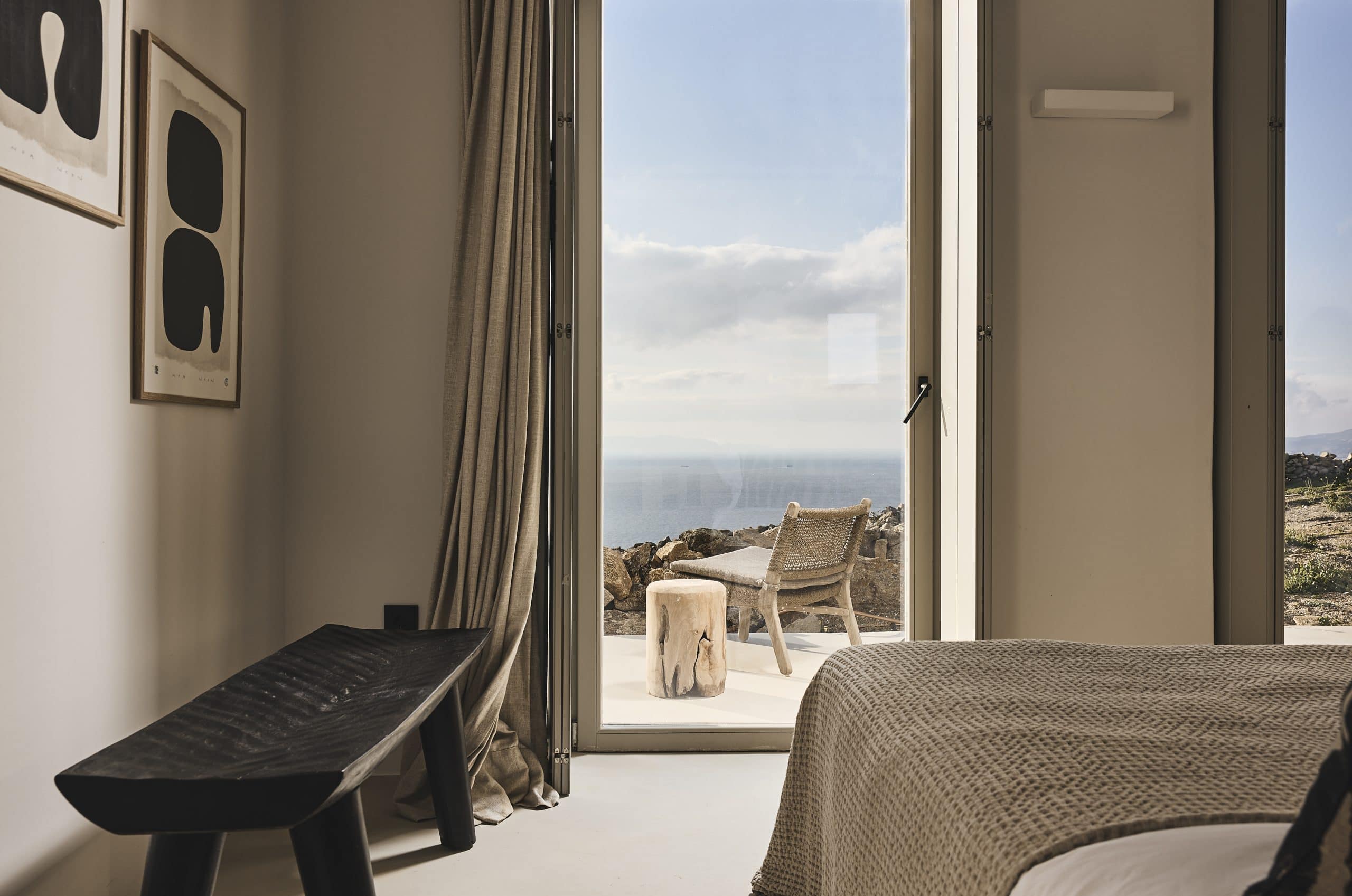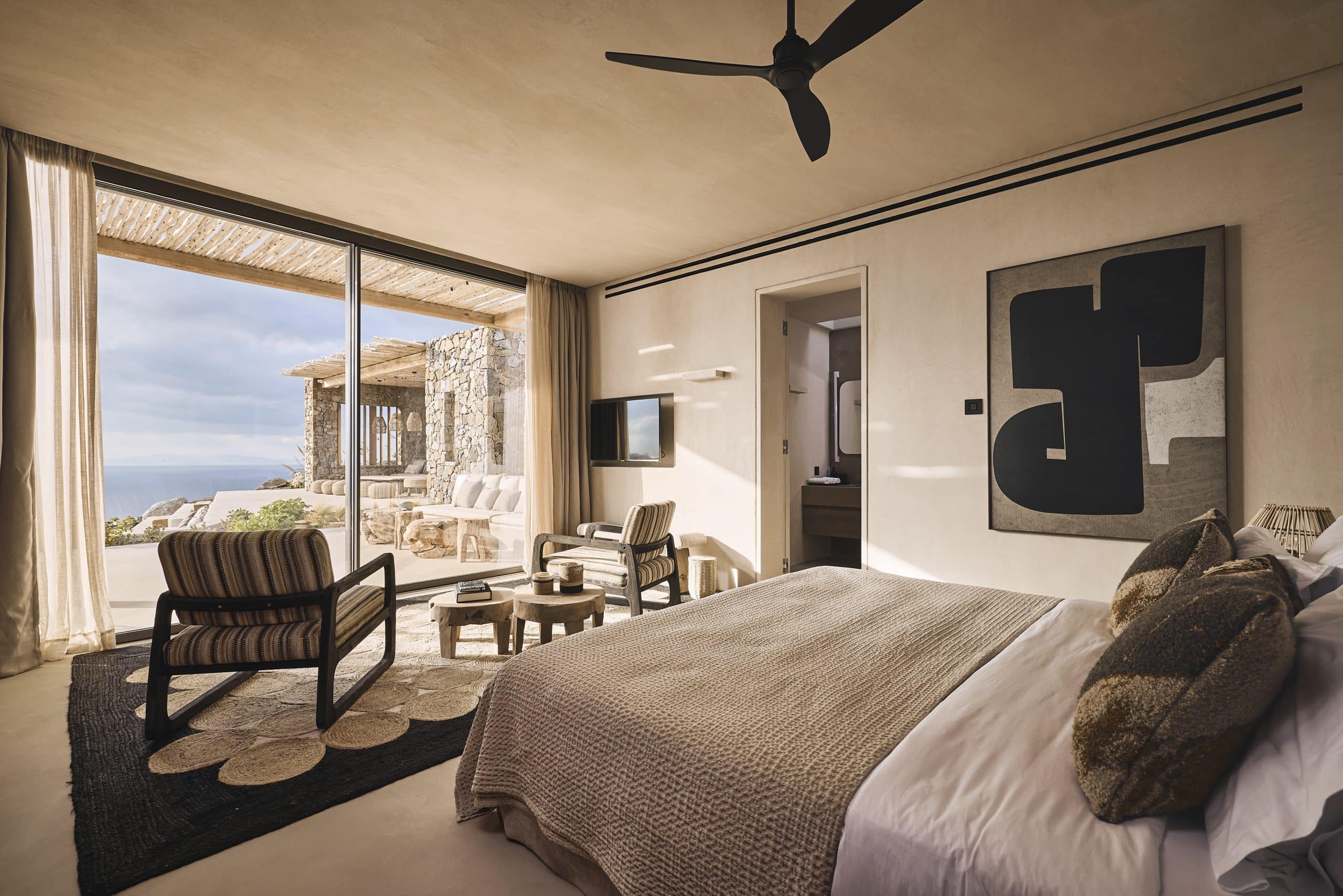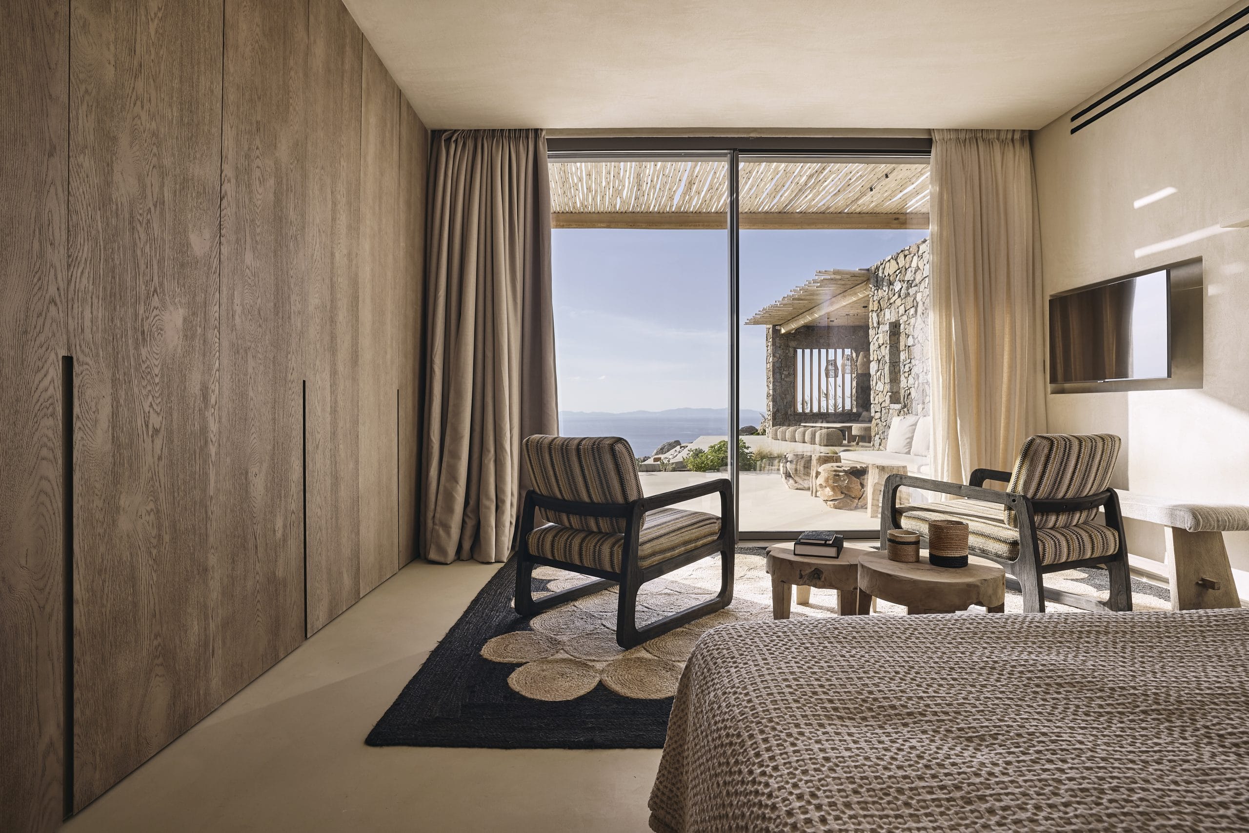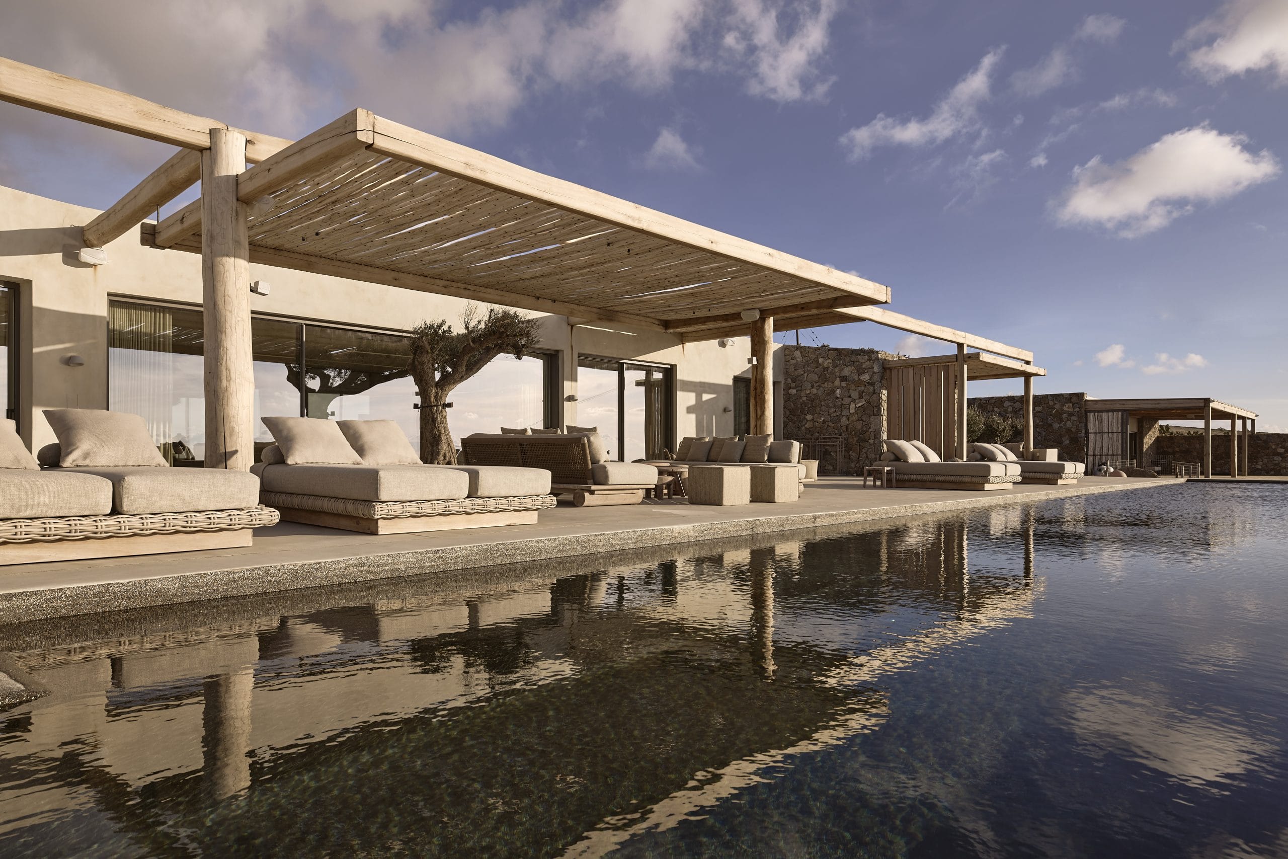 The villa includes seven beautifully appointed bedrooms, among them two master suites with private lounges and two independent guest apartments, each featuring its own private infinity mini pool, that is ideal for guests seeking added privacy. The outdoor areas are truly spectacular, centered around a 26-meter infinity pool (heatable upon request) overlooking the sea and horizon. Beside the pool, guests can enjoy an open bar and lounge area, complete with a convenient outdoor shower. A fully equipped BBQ area provides the perfect setting for outdoor dining and entertaining.