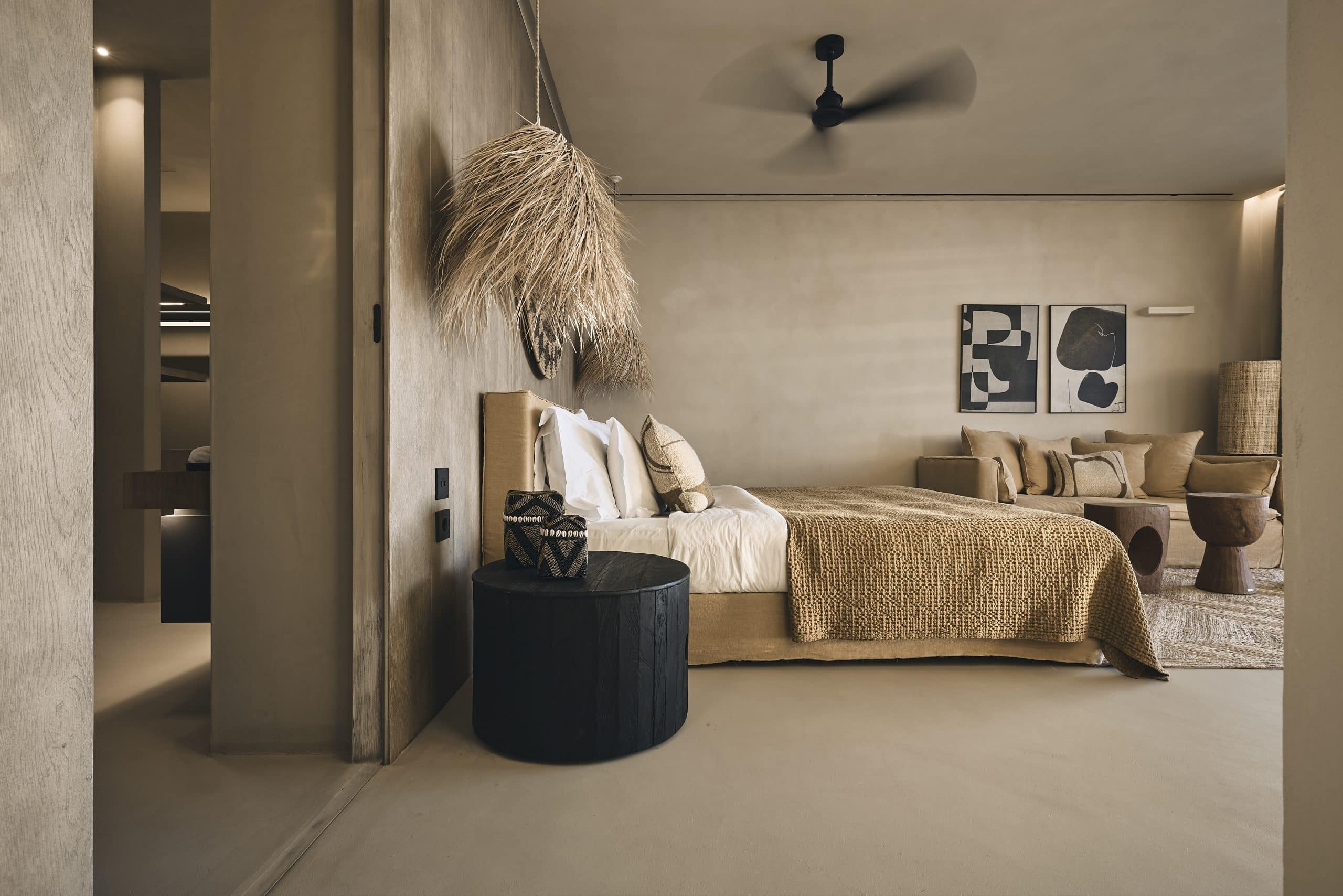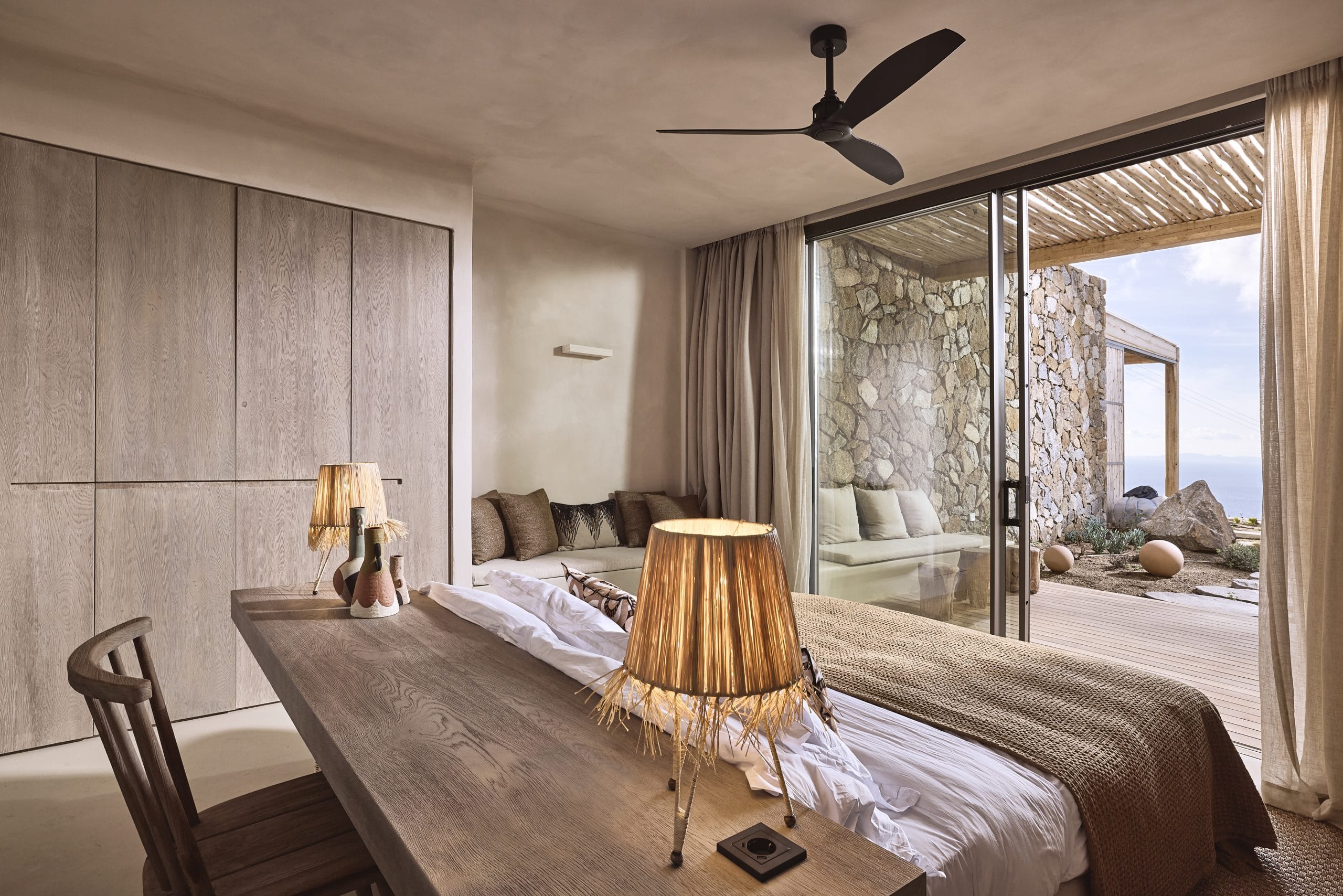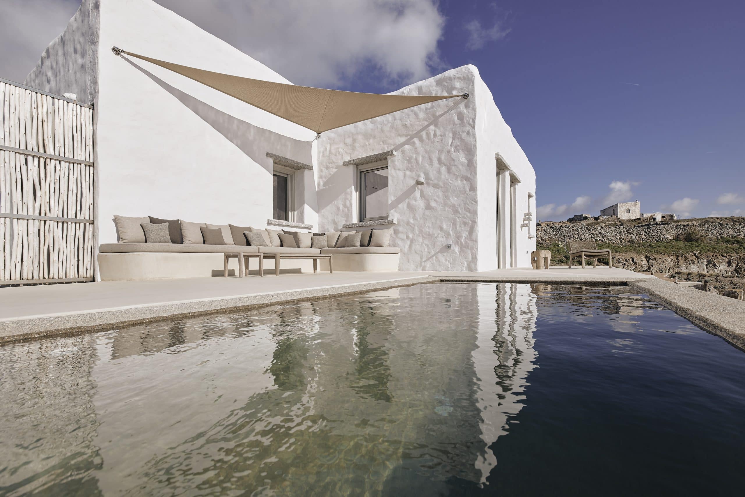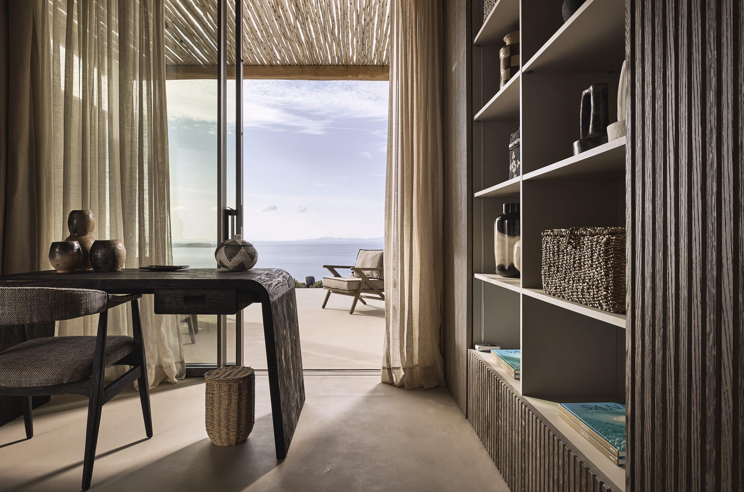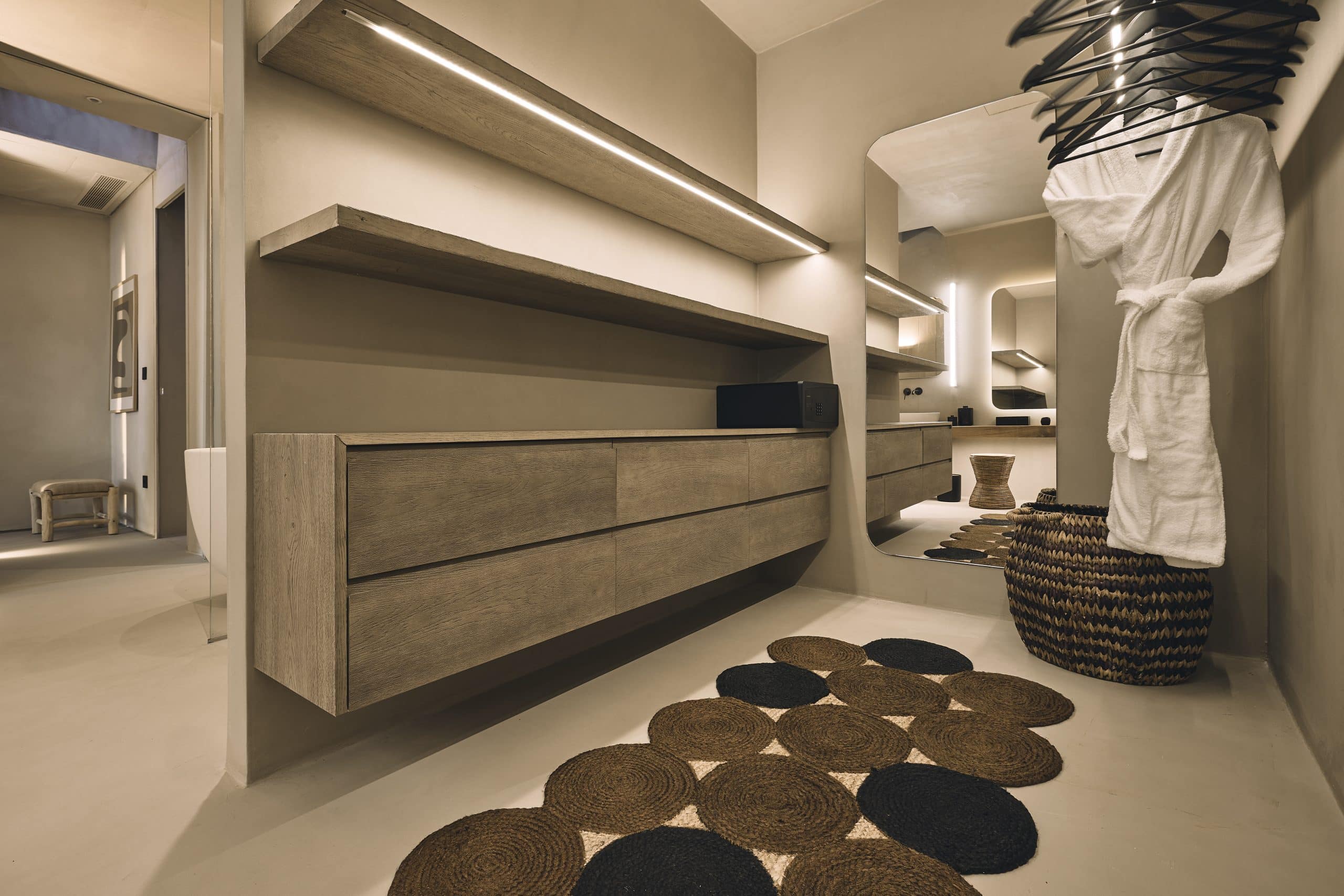 The villa includes seven beautifully appointed bedrooms, among them two master suites with private lounges and two independent guest apartments, each featuring its own private infinity mini pool, that is ideal for guests seeking added privacy. The outdoor areas are truly spectacular, centered around a 26-meter infinity pool (heatable upon request) overlooking the sea and horizon. Beside the pool, guests can enjoy an open bar and lounge area, complete with a convenient outdoor shower. A fully equipped BBQ area provides the perfect setting for outdoor dining and entertaining.