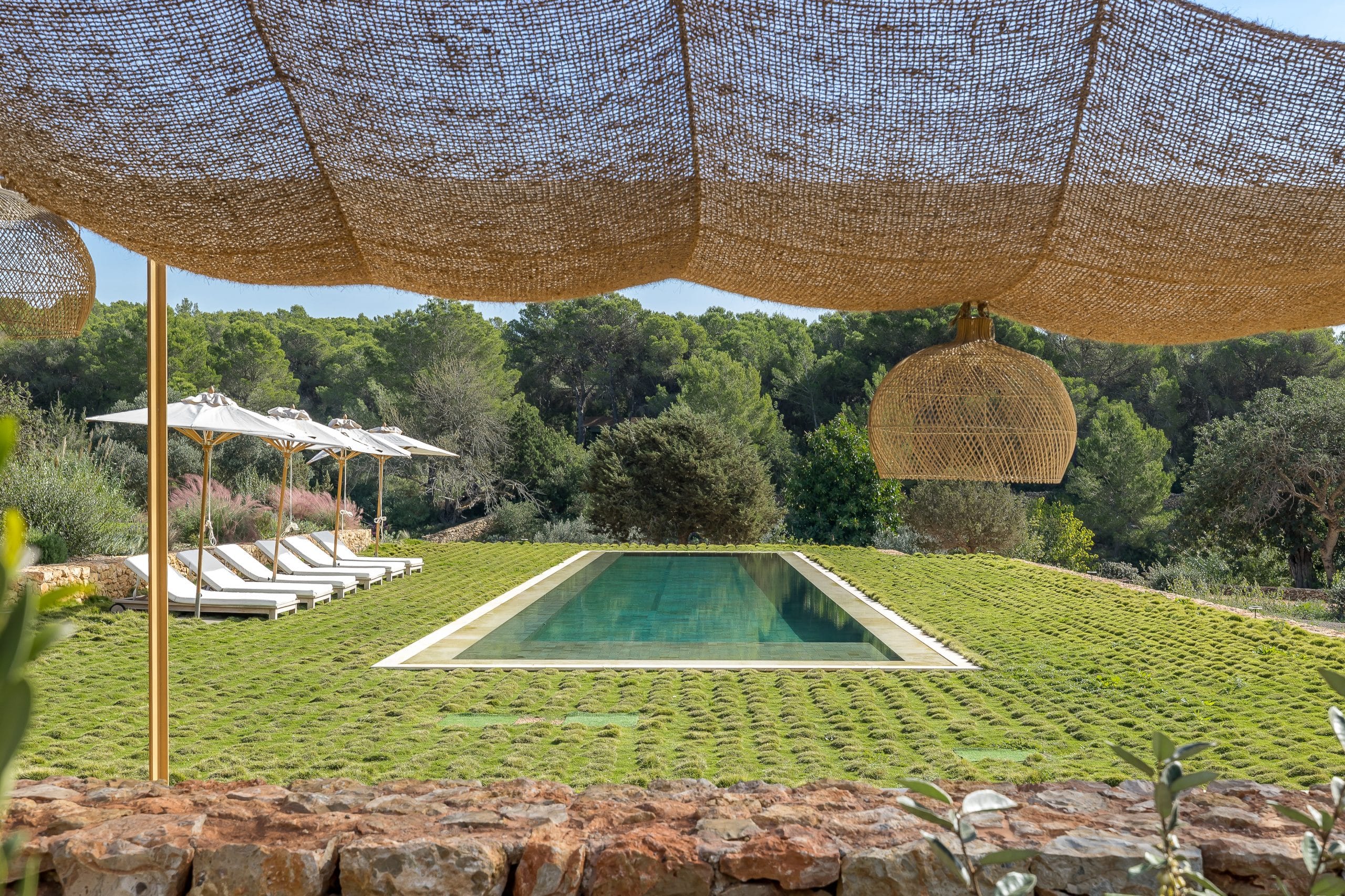 This villa is a private oasis of refined luxury, nestled among the cliffs, pines, and ancient olive trees of Es Cubells, an exclusive seaside enclave on the southern tip of Ibiza. The home is seamlessly built into the gentle curve of the hillside, intentionally blending into its natural surroundings and softening its grandeur. The villa’s sustainably driven design reveals itself in every detail, from cool marble slabs and textured stone to smooth, handcrafted wood finishes.