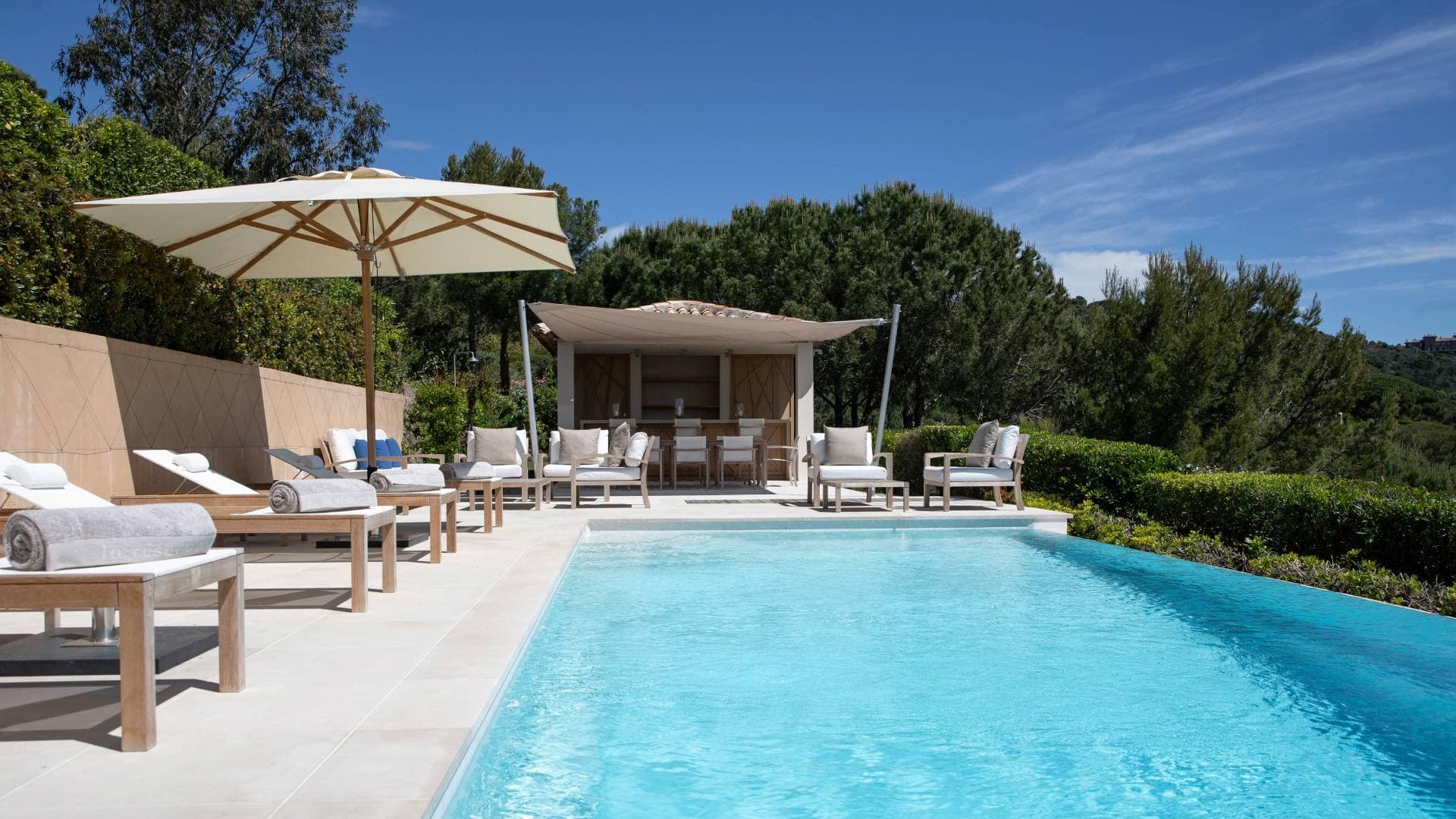Set in the part of the estate closest to the sea, this villa sits high on the hillside, enjoying breathtaking panoramic views over the Mediterranean. Just below the villa, the swimming pool is accessed by a short flight of steps and is complemented by a furnished pool house, an idyllic spot for leisurely lunches, shaded by a sail and facing the sea. With its highly contemporary and distinctive design, this stunning four-bedroom villa is arranged in two separate living spaces divided by a patio. An independent master suite, tucked away in a peaceful area, makes it particularly well suited to family holidays or stays with teenagers.