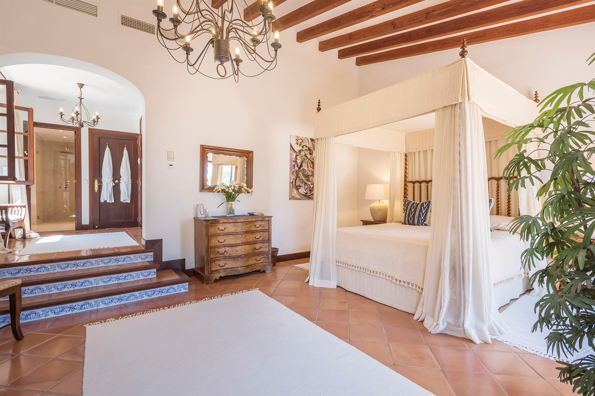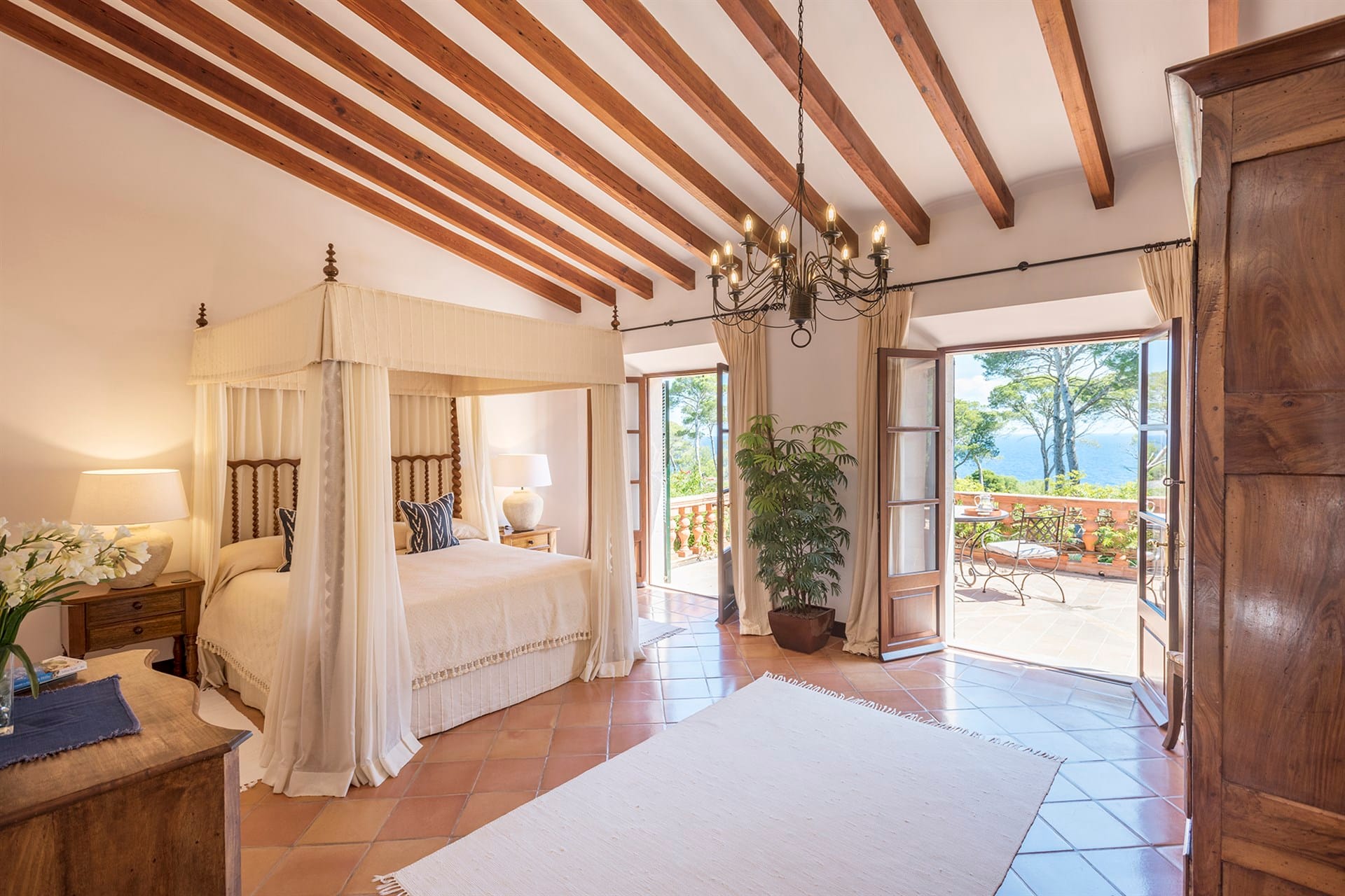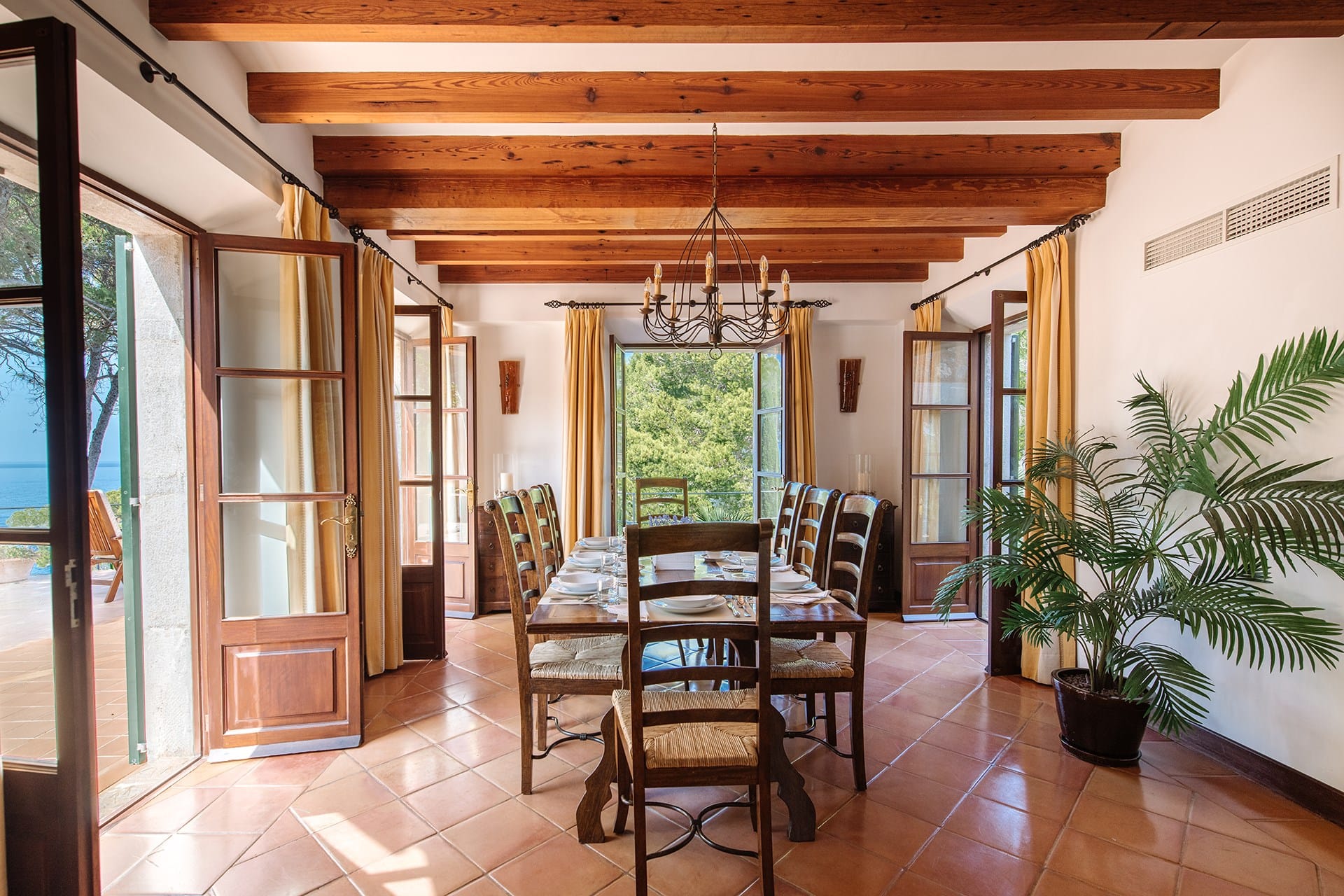 At the other side of the drawing room, wide steps embellished with blue and white Mallorcan ceramic tiles lead via a raised sitting area to the convivial dining room with triple-aspect views out to sea, easy access to the surrounding terraces, and a snug sitting area and fireplace. Next to this is the well-equipped kitchen that serves the indoor and the outdoor dining areas equally efficiently.