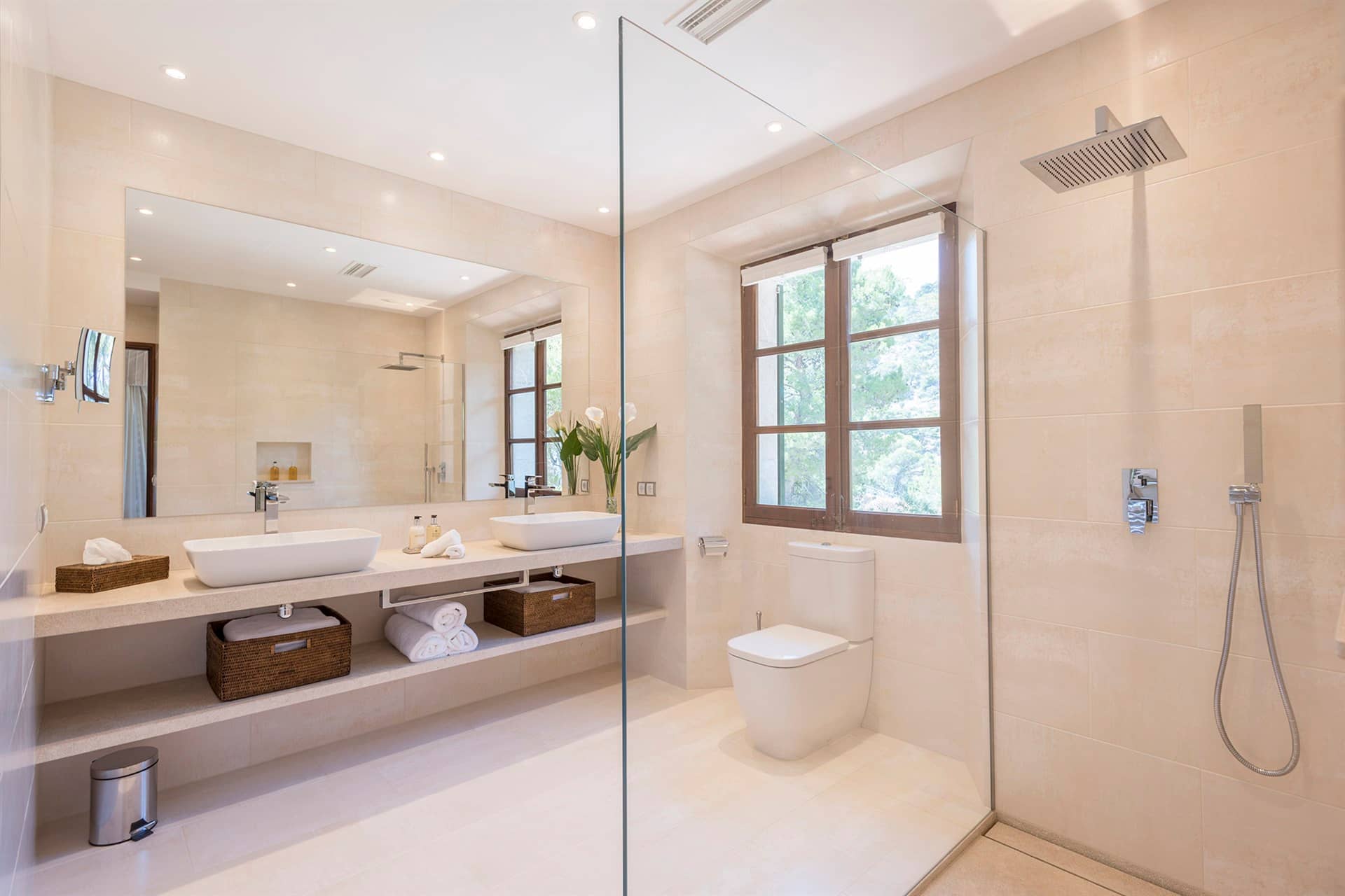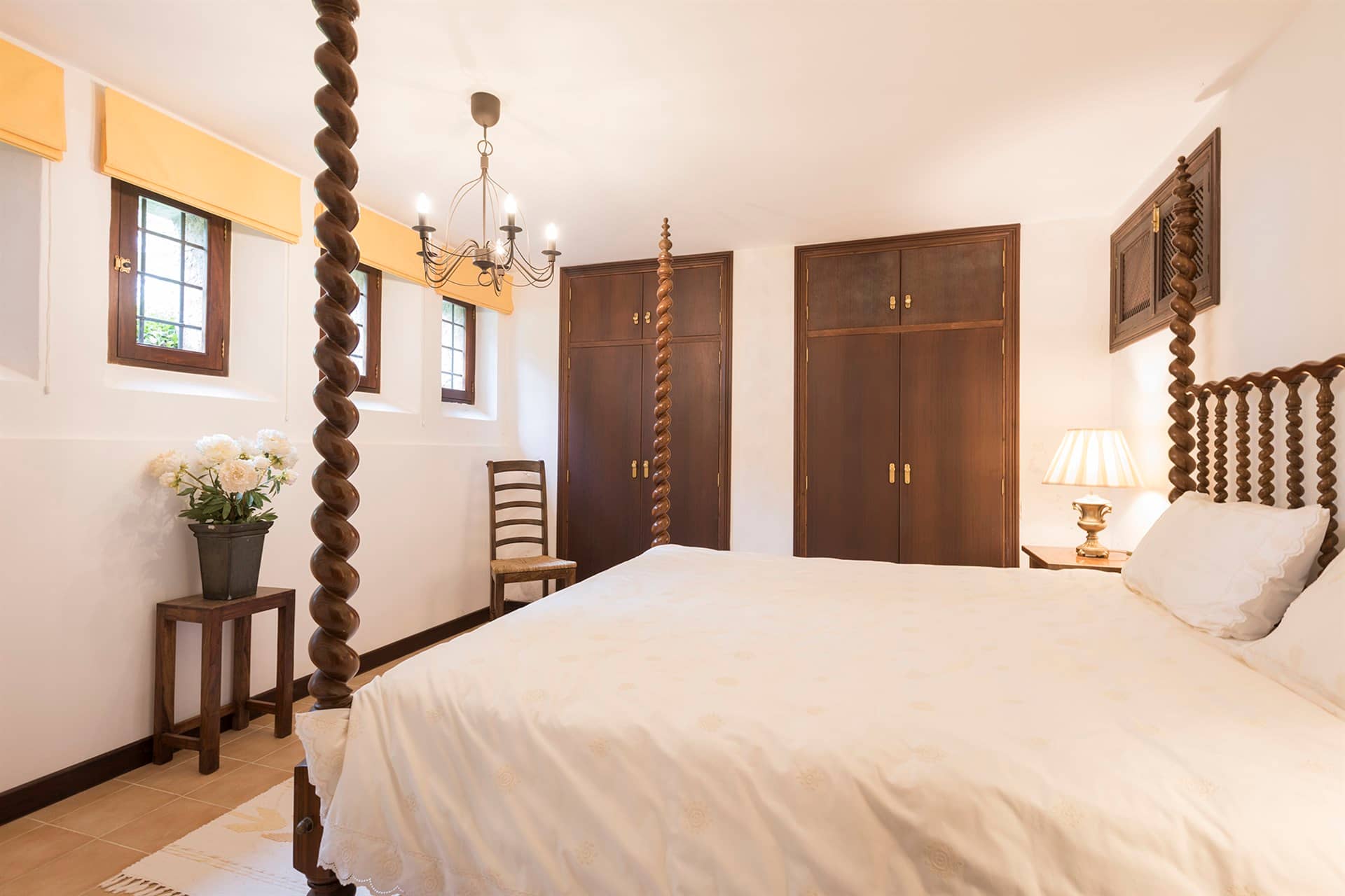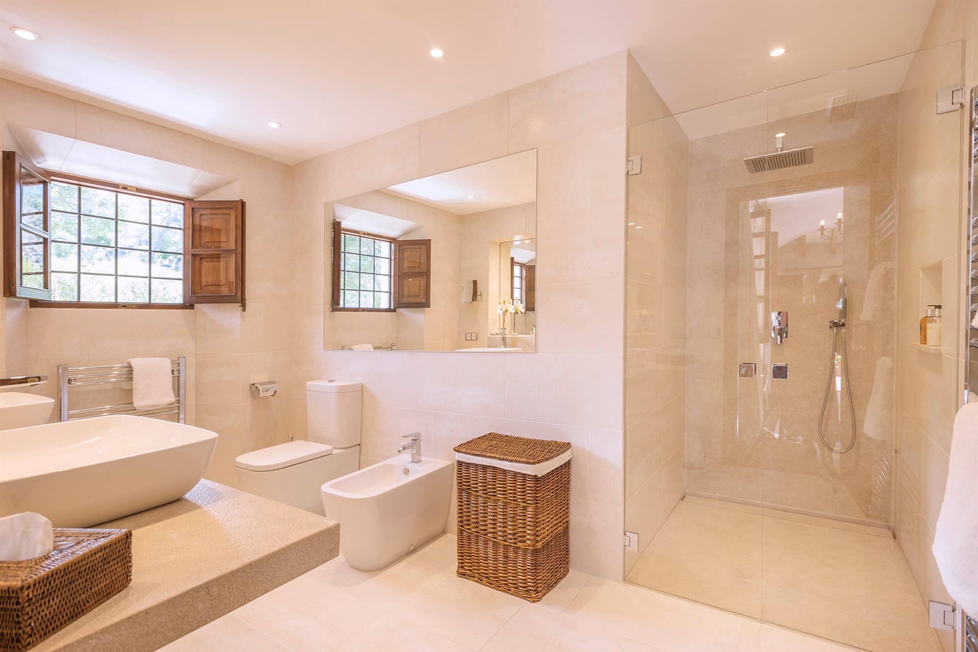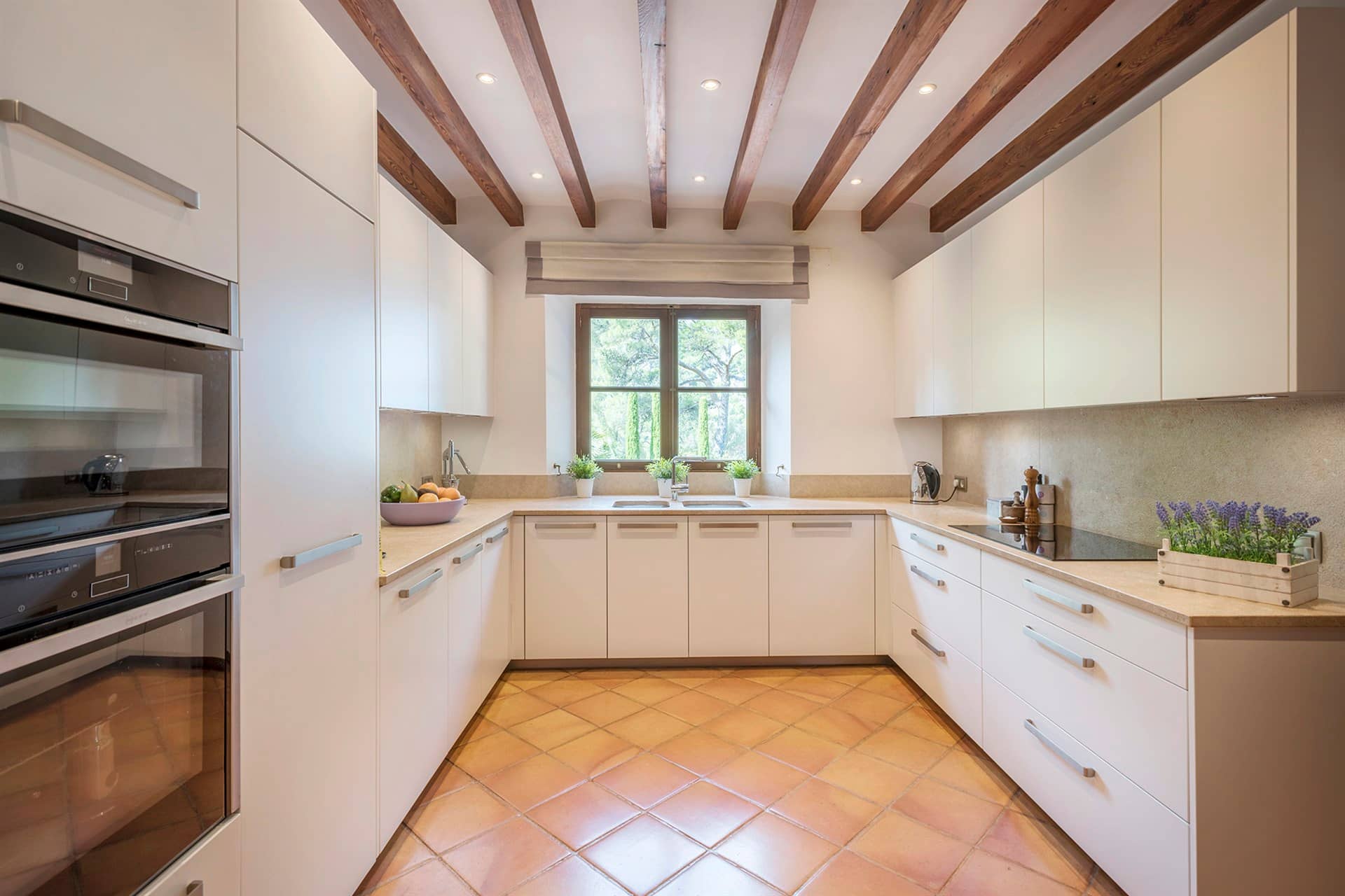 At the other side of the drawing room, wide steps embellished with blue and white Mallorcan ceramic tiles lead via a raised sitting area to the convivial dining room with triple-aspect views out to sea, easy access to the surrounding terraces, and a snug sitting area and fireplace. Next to this is the well-equipped kitchen that serves the indoor and the outdoor dining areas equally efficiently.