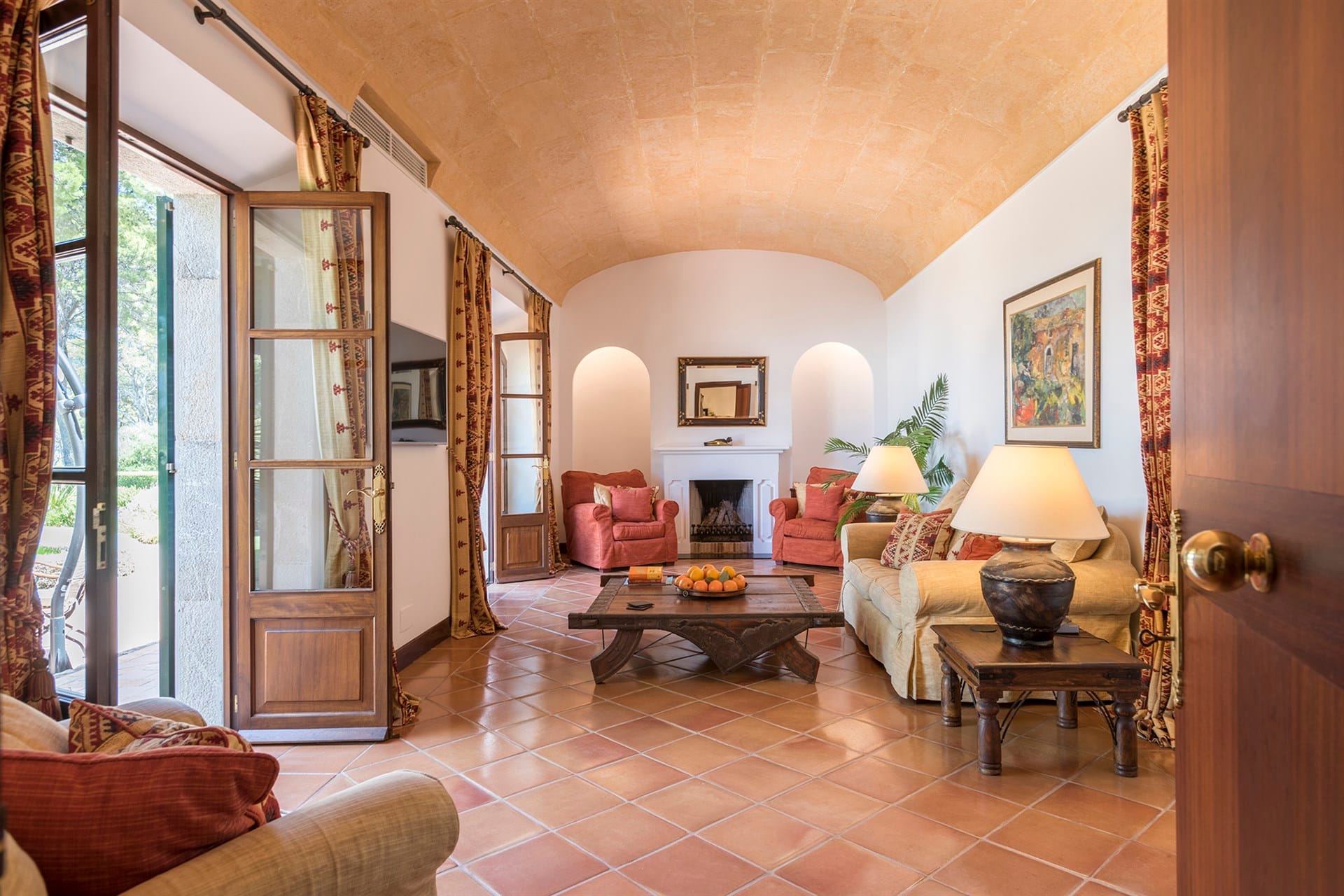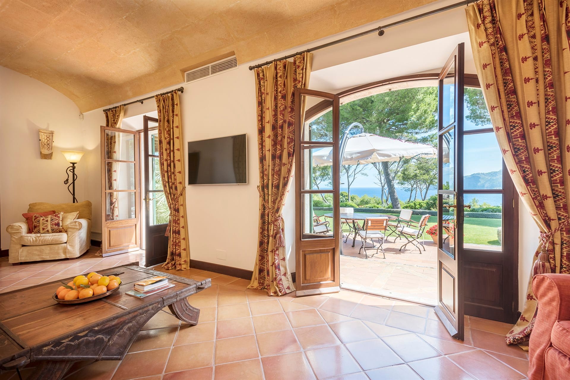 To one side of the drawing room, a door opens into an elegant, comfortably furnished living room with barrel vaulted ceiling, fireplace, TV, sea views, and French doors opening out on to the surrounding terraces.