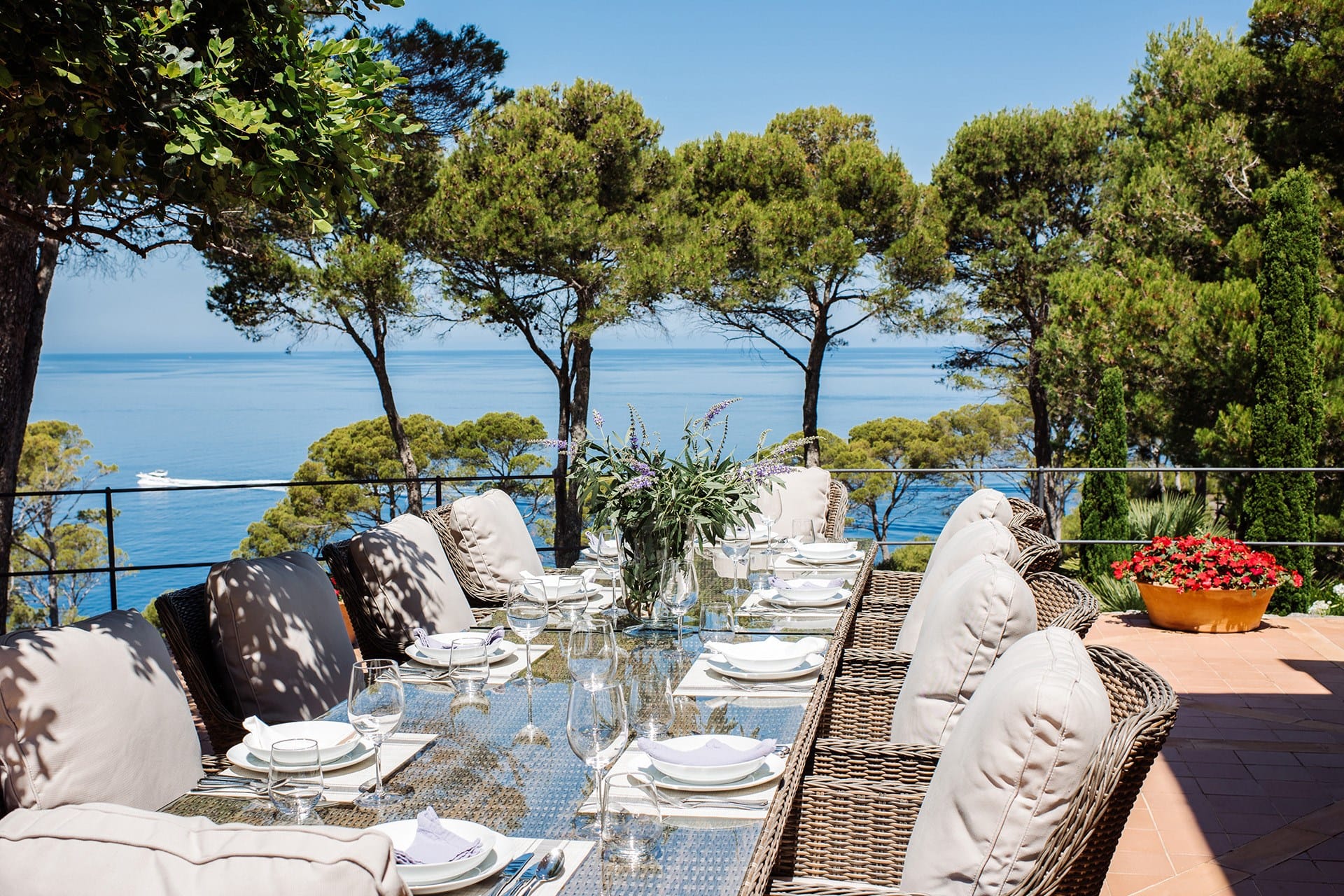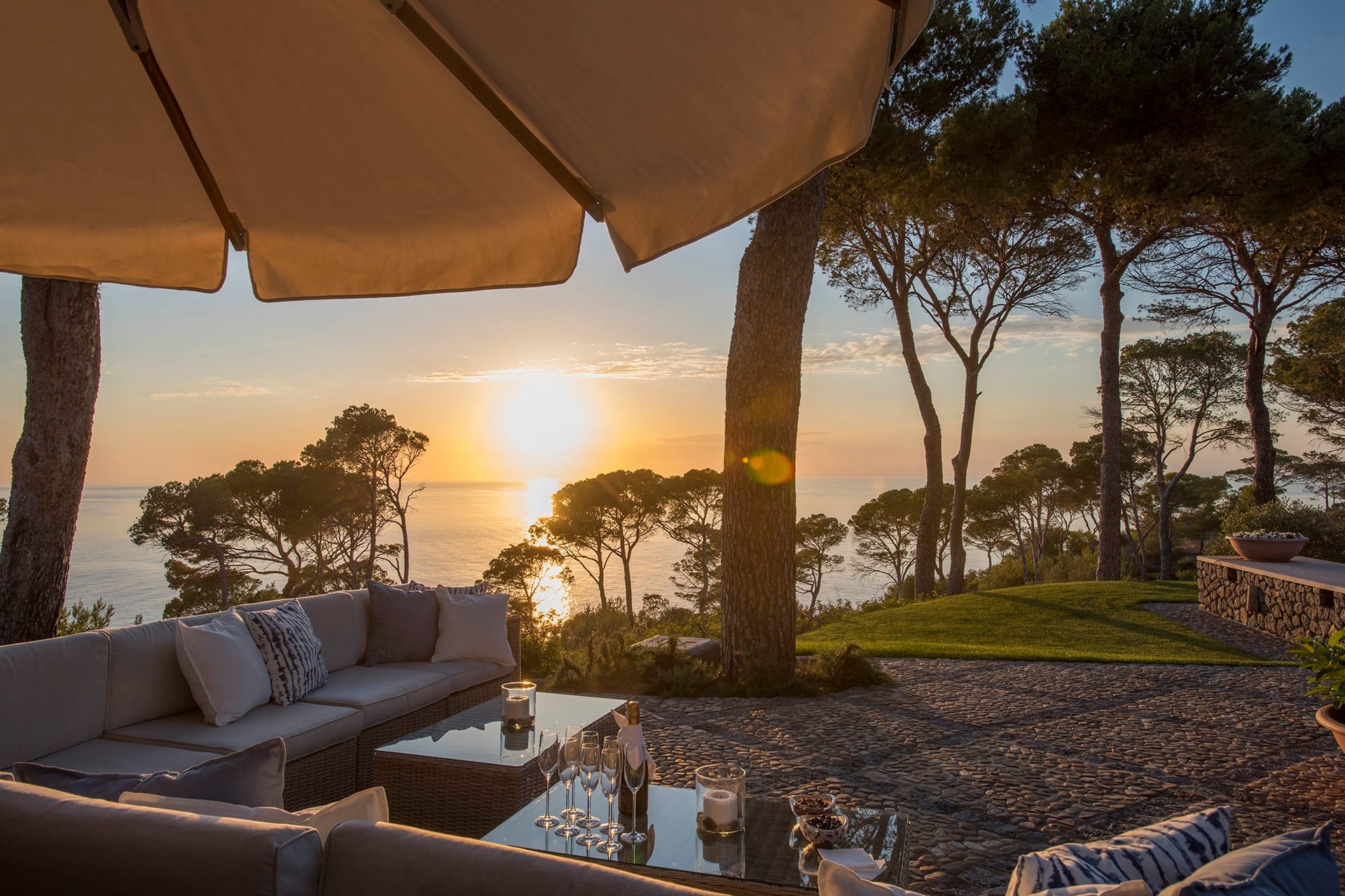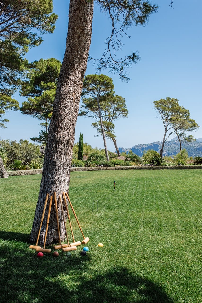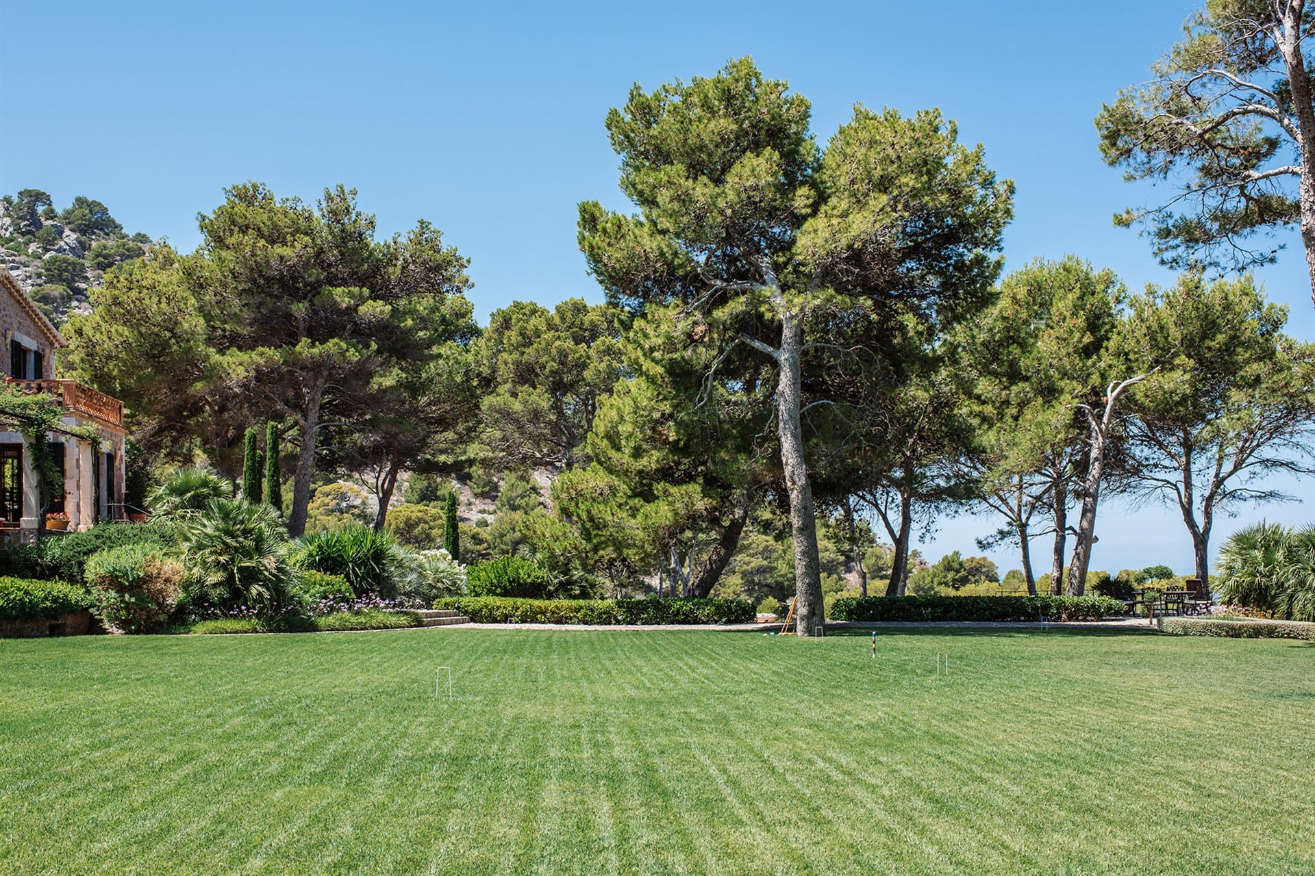 Where these terraces end, the superbly designed gardens begin. To one side of the property is an extensive, split-level area of manicured lawn. Its curvaceous borders host a wide variety of Mediterranean flowers and shrubs, some laid out in a semi-formal fashion, others left knowingly au naturel. Perfect stone walls delimit the various sections of the gardens, while a weave of cobbled and gravel paths transport guests between pine tree-shaded terraces and magnificent viewing points above the sea.