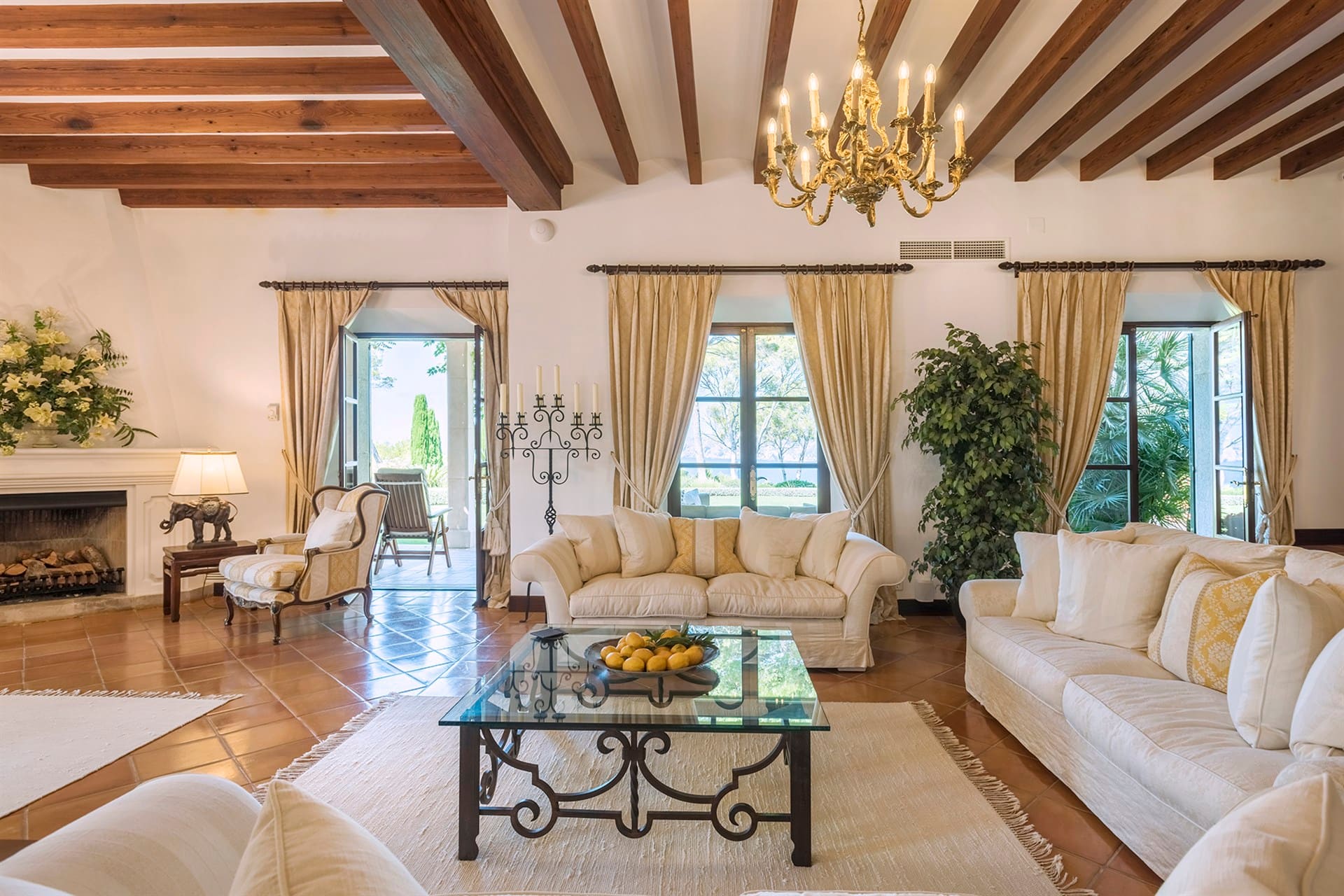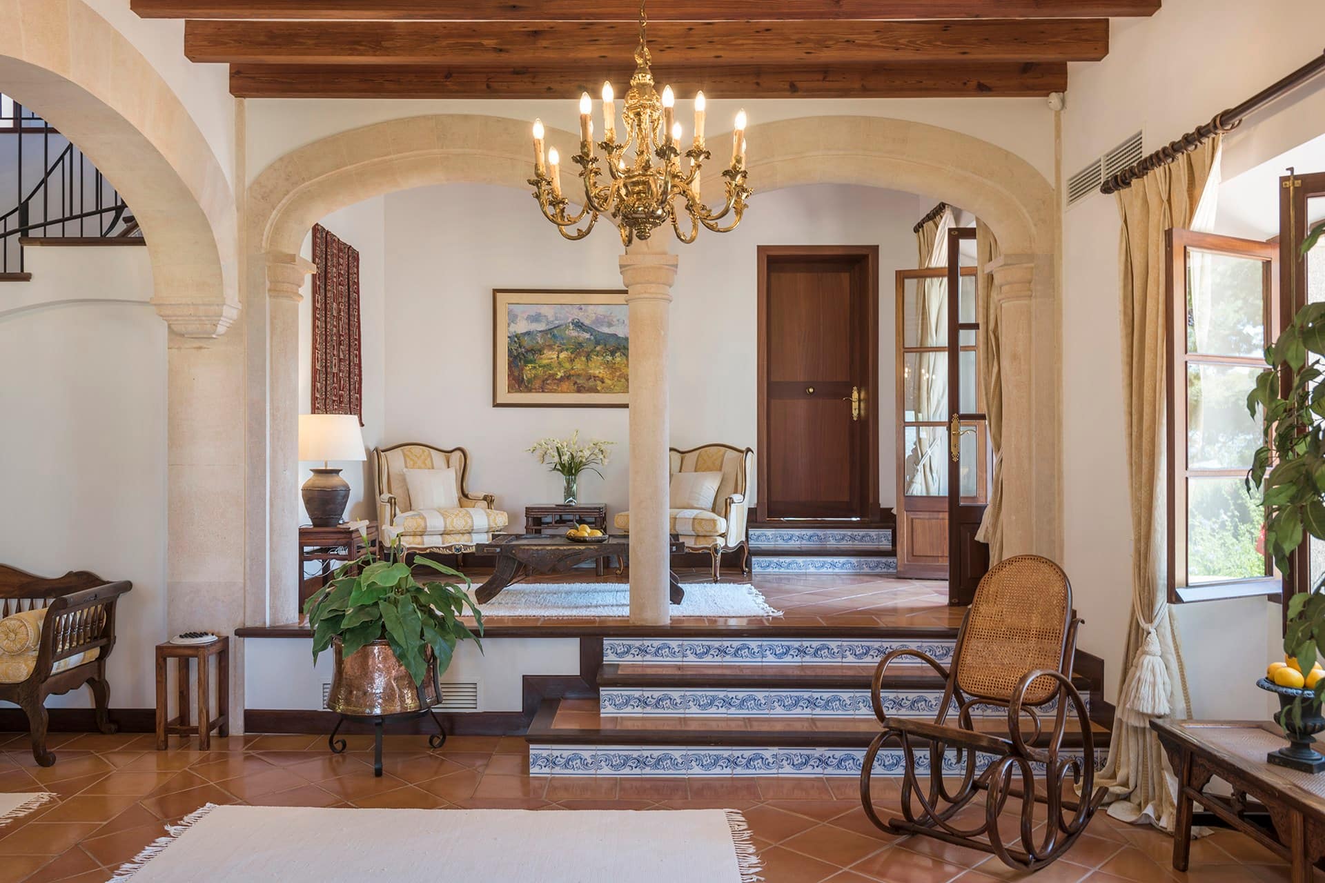 Accommodation extends over three floors. The main entrance takes one into a fabulously proportioned, luminous drawing room whose lofty beamed ceilings, sandy stone arches, terracotta-tiled floors, white-painted walls, banks of French doors, quality furnishings, impressive fireplace and understated chandeliers are all leitmotifs destined to reappear throughout the property. The overall effect is one of pleasing harmony, stylistic coherence and unerring attention to detail.