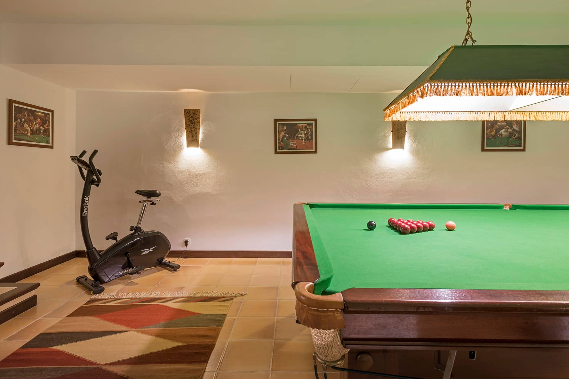 Last but not least is the lower ground floor, accessed via a staircase from the kitchen. Here there is a snooker room, a table tennis room, and an apartment with a super king size double bedroom, an en-suite bathroom with tub and shower attachment, and a living area with TV. Comfortably furnished and equipped, but without views and not finished quite to the same level as the other accommodation, this bedroom is recommended for an independent teen, younger children or a nanny.
