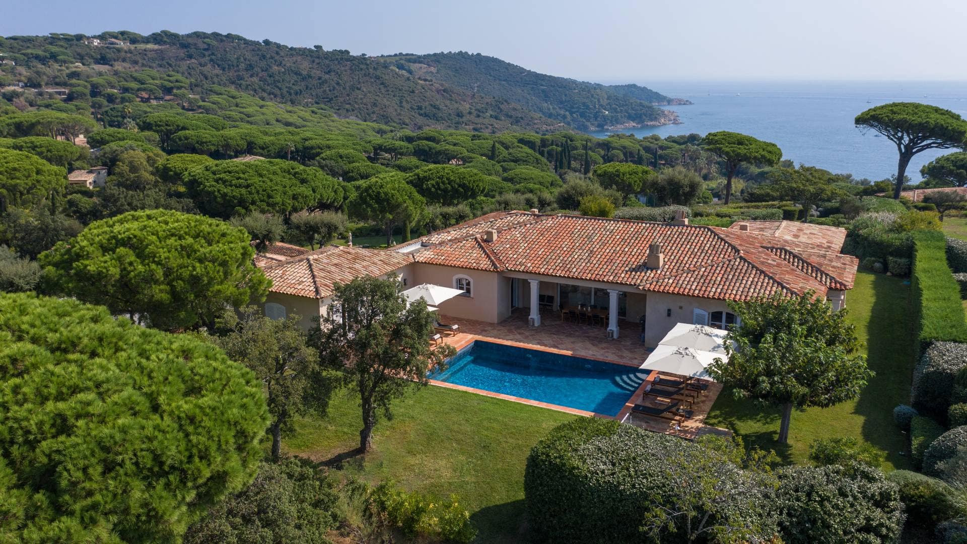 Inclusions and Amenities: Tailored hotel services • Personalised service from a dedicated housemaid available 8 hours per day, (breakfast, cleaning and laundry services) • Dedicated room service for the villa, available from 11:00 am to 10:00 pm • Laundry service • Clefs d’Or concierge services • Family activity planning • 24/7 reception • Shuttle service to Place des Lices in Saint-Tropez, the village of Ramatuelle and other Pampelonne beaches (subject to availability) • Gated estate with 24/7 security • Wi-Fi • Newspapers upon request • Villa surface: 330 sqm • Garden surface: 3,030 sqm • Orientation east • Sea view • Private terrace and outdoor pool (heated from April to October) • Closed garage: 1 place • Outdoor parking: 2 places • 5 bedrooms • 5 bathrooms • Safes: 1 per room