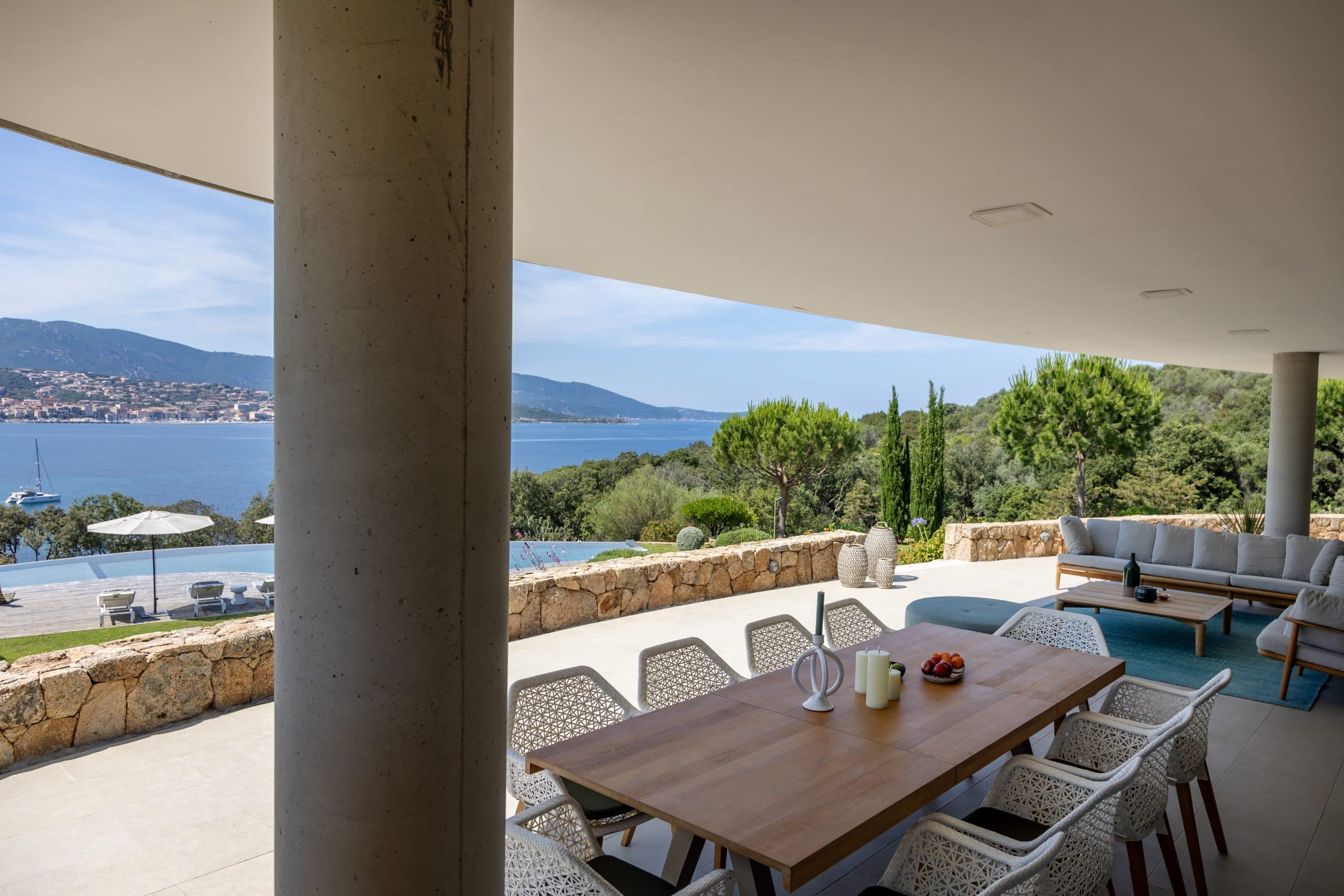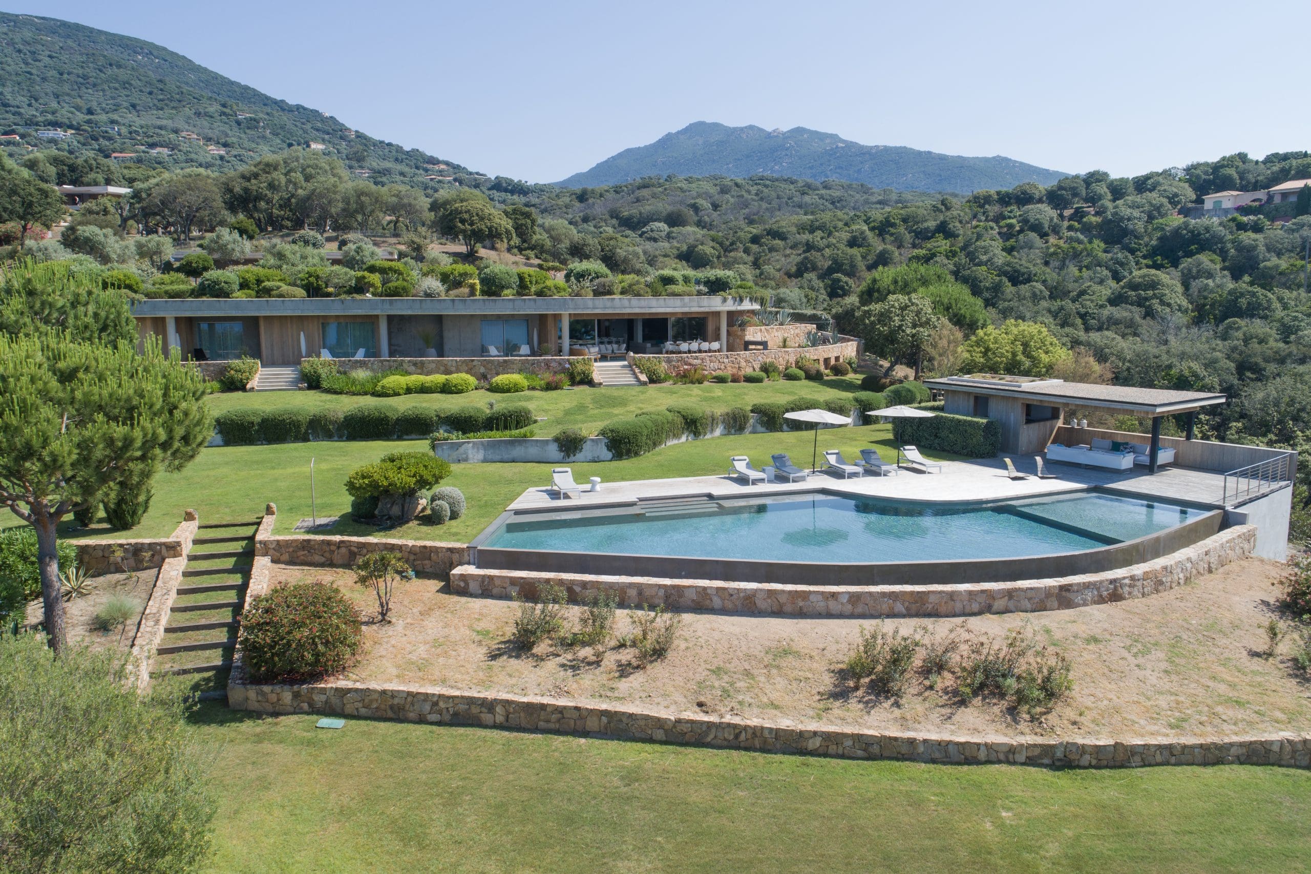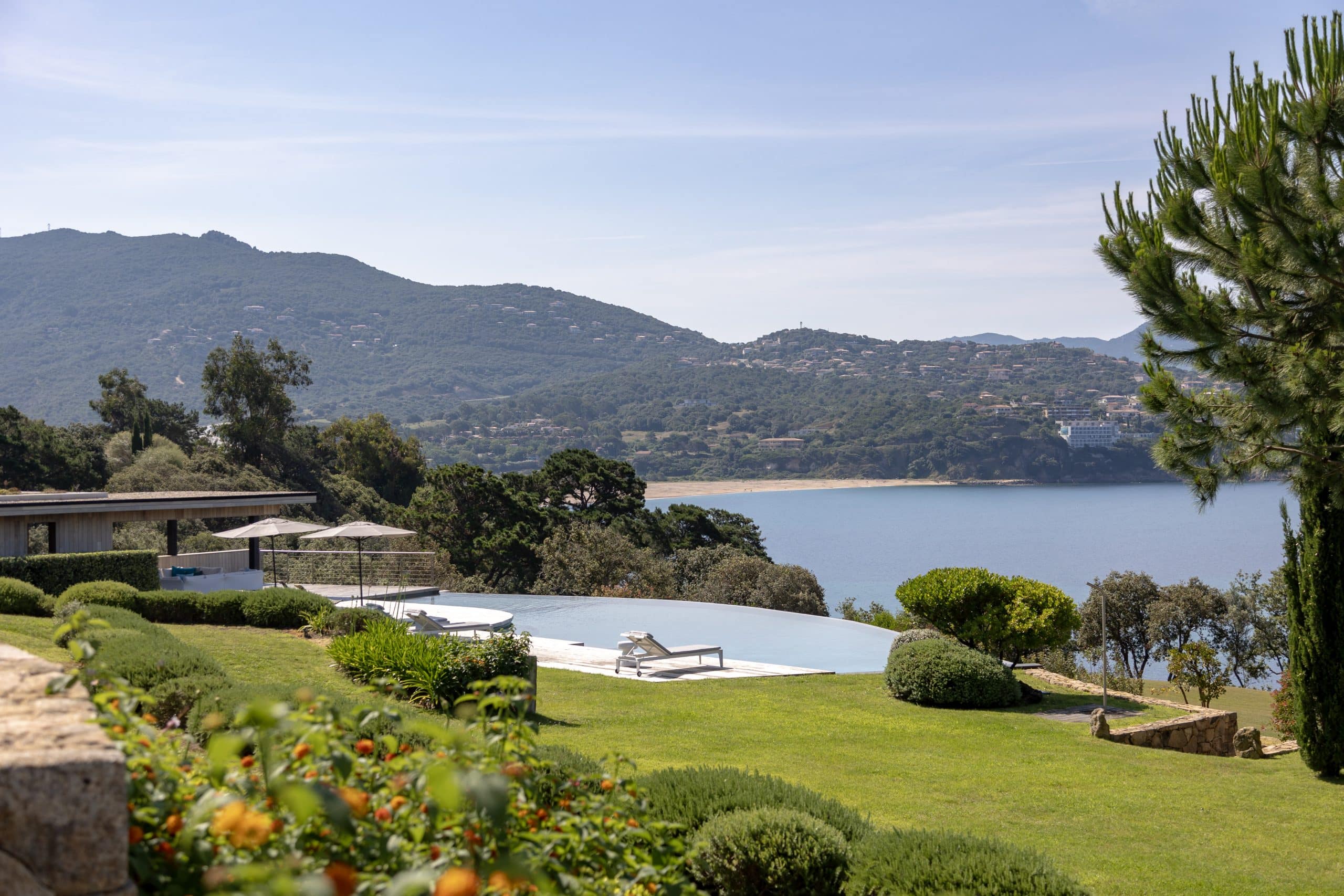 Exterior Highlights: 600 m2 villa • Breathtaking views of the bay of Propriano • Equipped edible garden • Large 26-metre infinity pool secured with alarm and lined with sun beds and parasols • Pool house with living room • Panoramic seaview terrace with large dining table and outdoor lounge • Barbecue • Access to a pristine beach via private path.