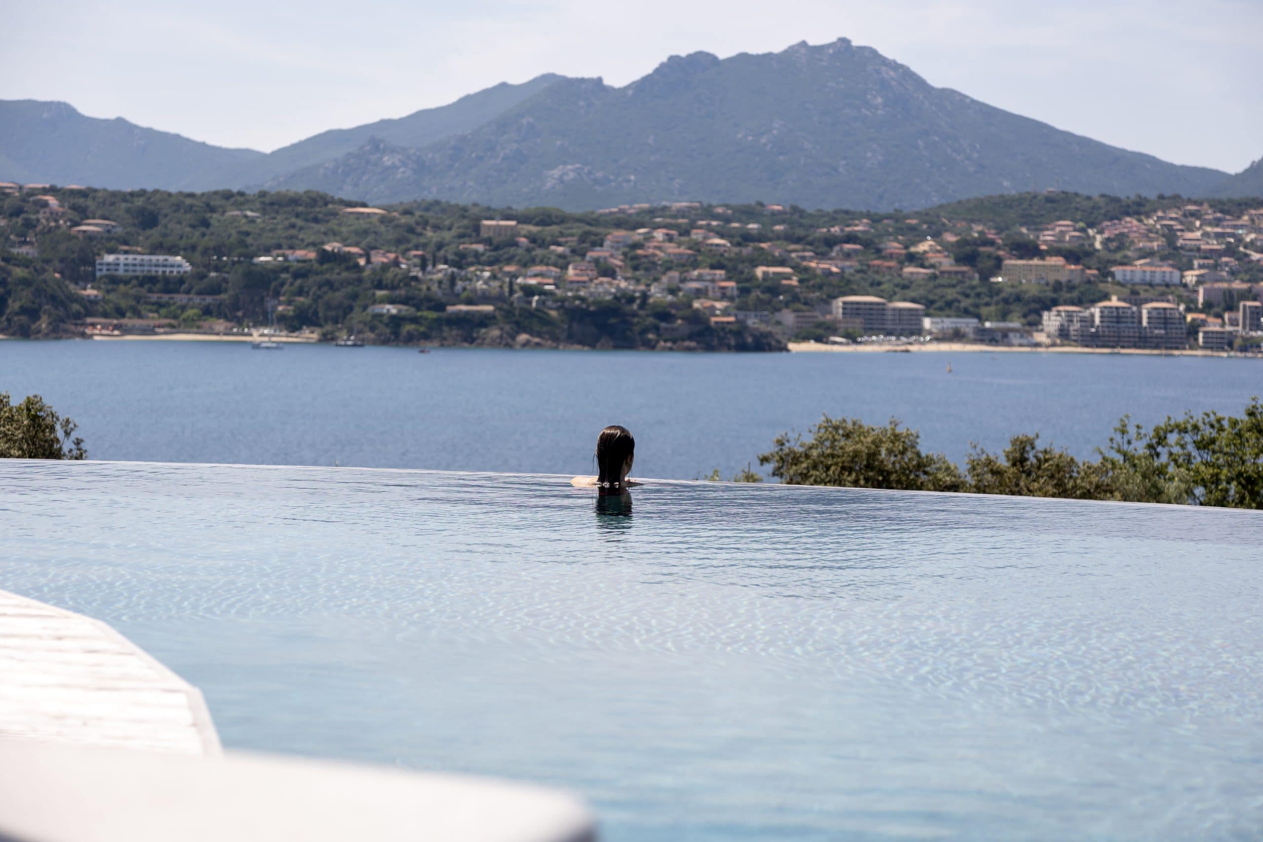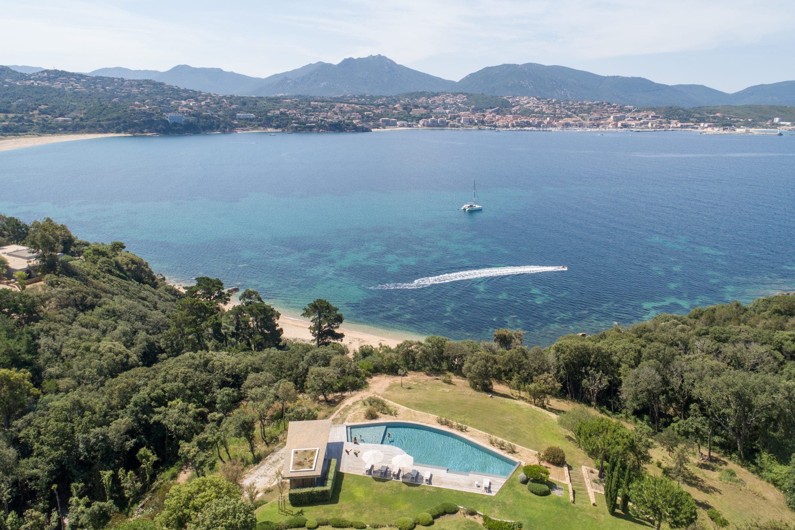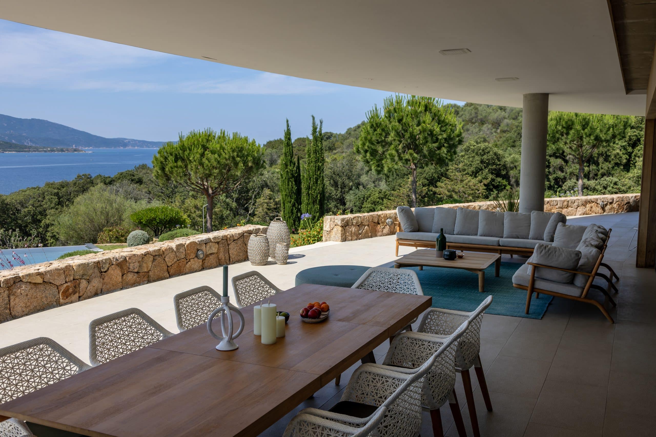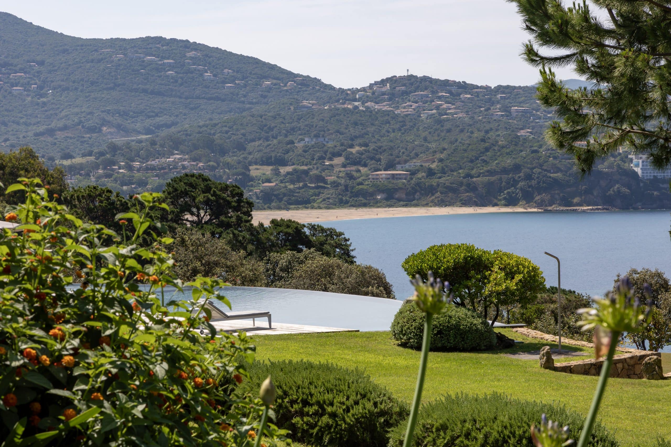 Exterior Highlights: 600 m2 villa • Breathtaking views of the bay of Propriano • Equipped edible garden • Large 26-metre infinity pool secured with alarm and lined with sun beds and parasols • Pool house with living room • Panoramic seaview terrace with large dining table and outdoor lounge • Barbecue • Access to a pristine beach via private path.